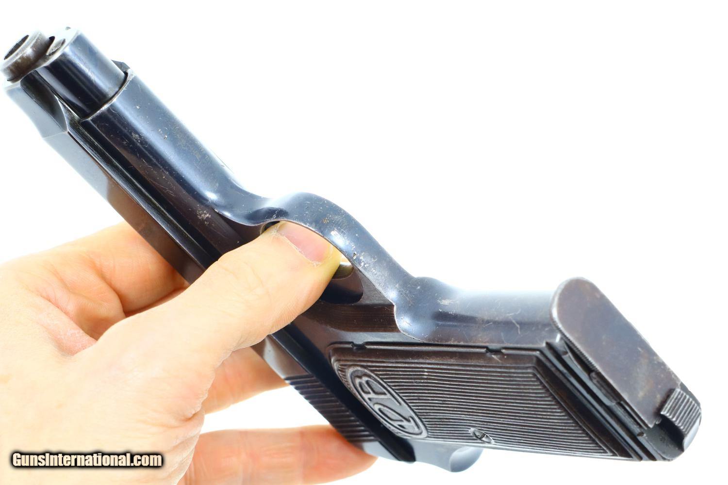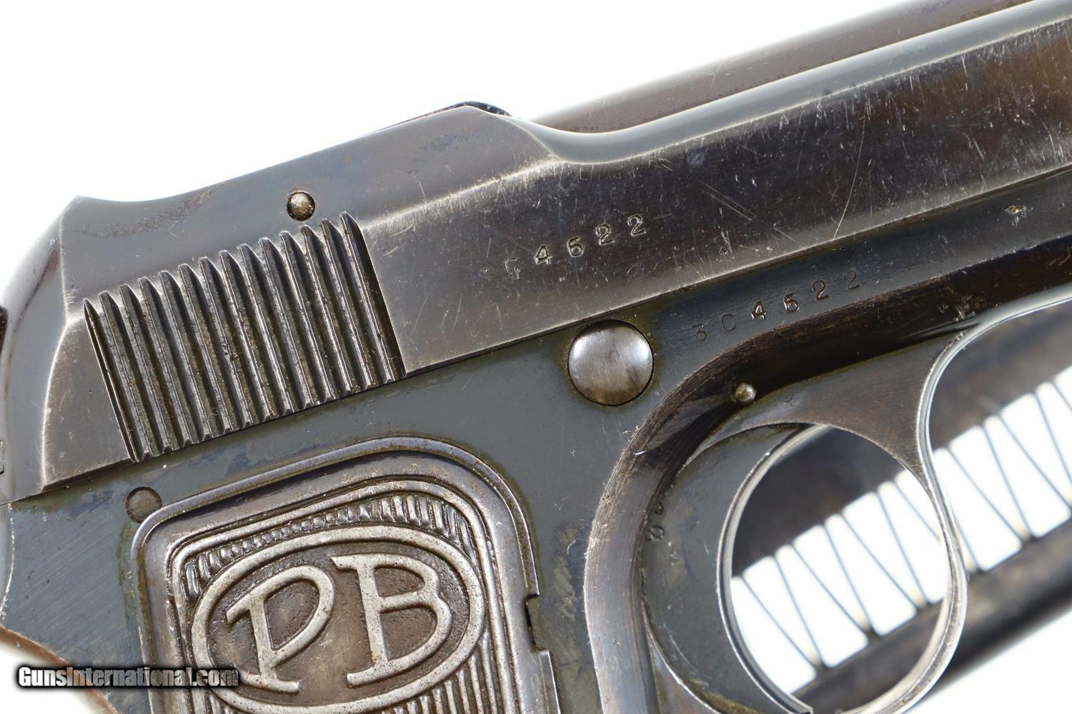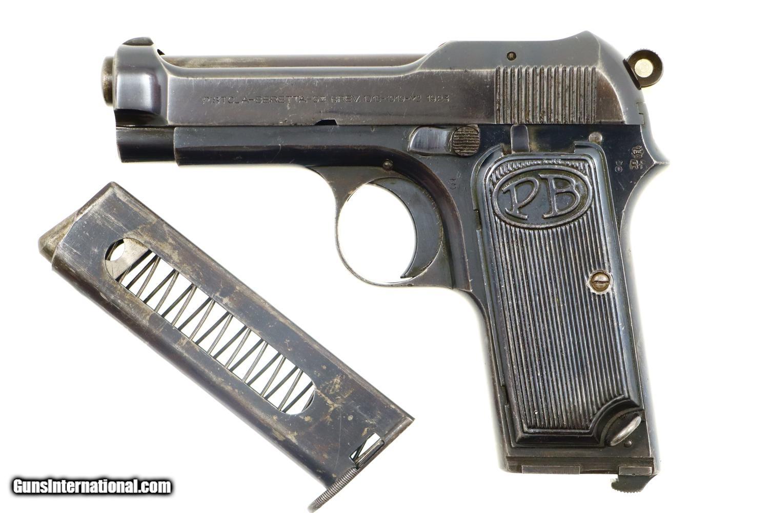 Description: Synopsis: Scarce Beretta, 1923, Slotted, Italian Military Pistol, 304622, FB00918 Description: Standard configuration Beretta 1923 with fixed front, notched rear sight, and slotted for shoulder stock, one of approximatly 3000 issued to the Italian Army. Top mounted extractor. Single action blowback with slide retention after last shot. Manufacturer, caliber, and model on left side of slide. Right side of slide and frame with full serial number, last few digits repeated on barrel lug. S/F safety markings. Crown/RE, marked on left tang, reflecting use by Italian military. Metal grips with encircled PB logo over vertical serrations. Fixed lanyard ring. Correct magazine with large windows on each side of body and unmarked floorplate having serrations on each side. Condition: Approximately 90% bright original blue with sharp edge wear and thinning of front and backstrap as carefully pictured. Bright bore with sharp rifling. Perfect manual mechanics. One of the most desirable of the large early Berettas, this one slotted for a shoulder stock and having been issued to the Italian Army. ~~Insured shipping fee of $65; most packages shipped using FedEx 2nd Day.~~ SOLD Curio/Relic: Yes Manufacturer: Beretta Serial Number: 304622 Caliber Info: 9m |