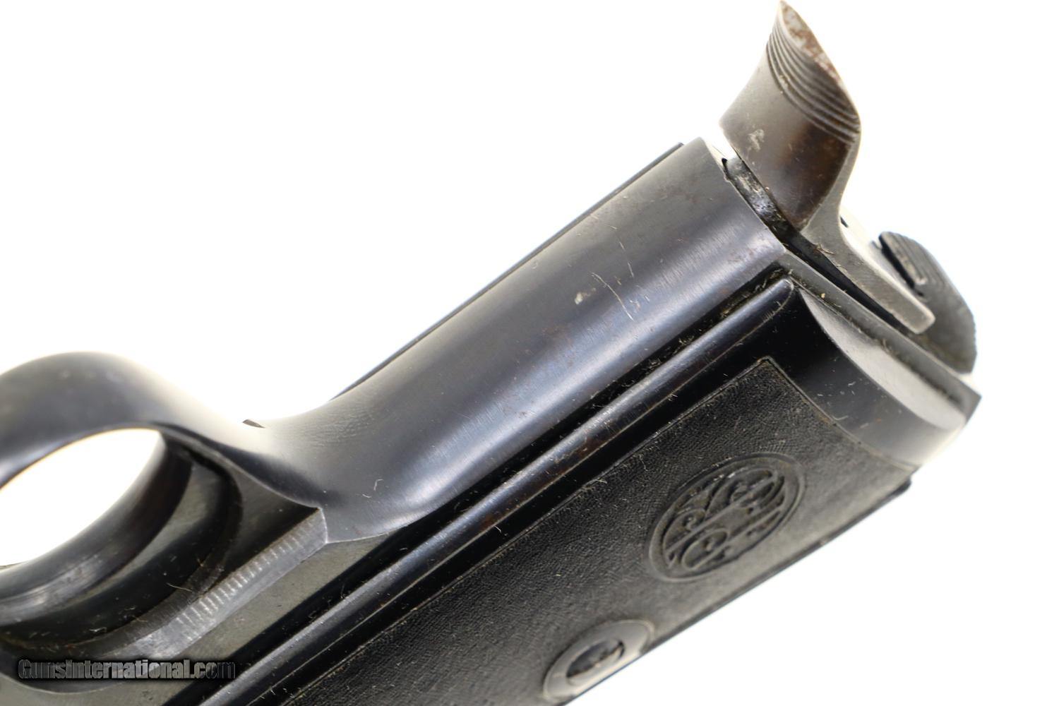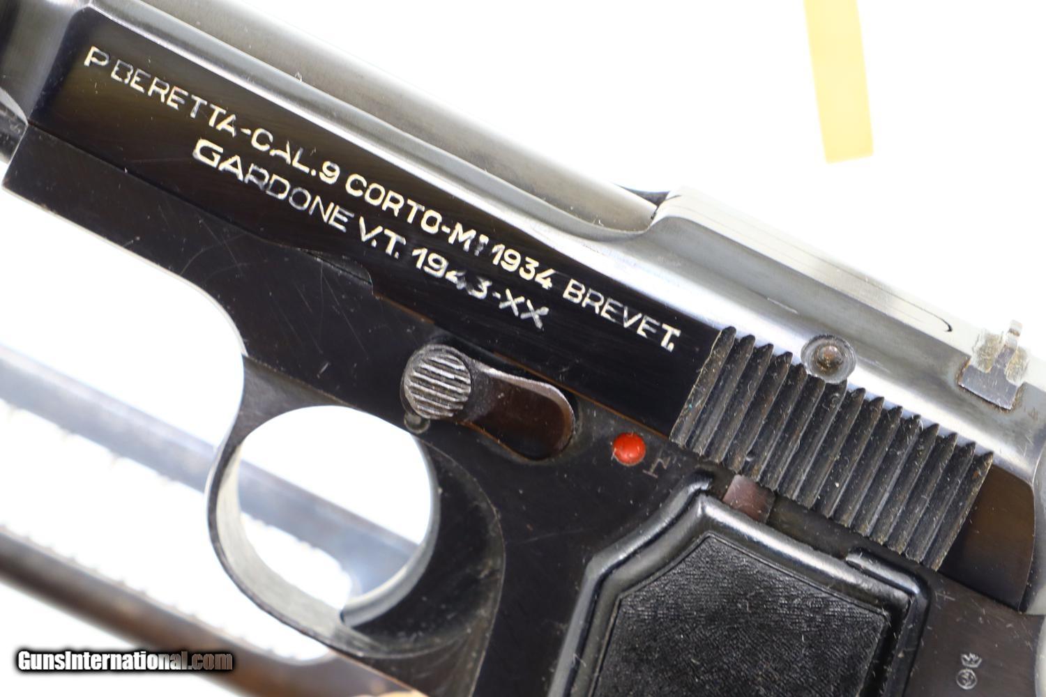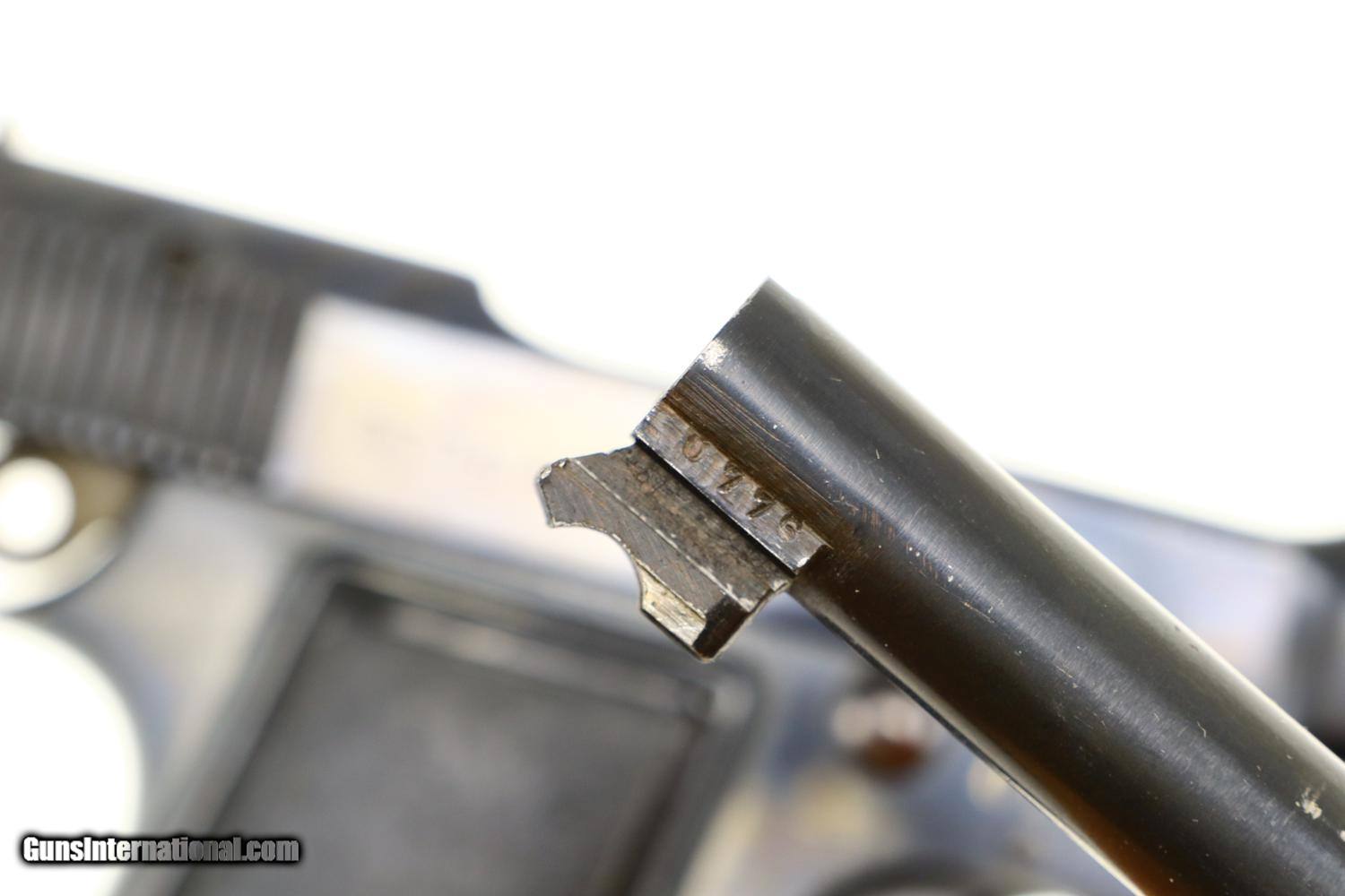 Description: Standard configuration Beretta 1934 pistol, caliber .380 ACP, with fixed front sight and a drift adjustable rear sight. Marked on the left side of the slide with two line address, all capitals , denoting caliber, model, and year of manufacture in 1943. “S” and red dotted "F" safety detents. Small proof on left tang. Boxed inspector markings on right trigger guard web. Full serial number on right side of barrel lug, right slide, and right frame. Standard metal backed plastic grips and blued magazine with finger extension floorplate. Synopsis: Exceptional Beretta 1934 pistol, WWII, early high polish, Nazi Military issue. Condition: Nearly 99% bright original high polish salt blue. Minimal sharp edge wear with faint freckling on the backstrap. Comparable condition grips, slightly burred grip screws. VG magazine with thinning finger extension floorplate. Mirror bright bore with sharp rifling. Perfect manual mechanics. A beautiful high polish Nazi contract Beretta M1934, made 1943, that would be very difficult to upgrade. ~~Insured shipping fee of $65; most packages shipped using FedEx 2nd Day.~~ SOLD Curio/Relic: Yes Manufacturer: Beretta Serial Number: 776AA Caliber Info: 9mmC |