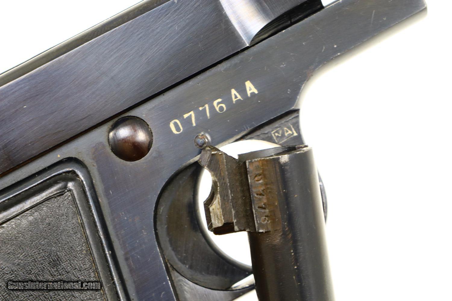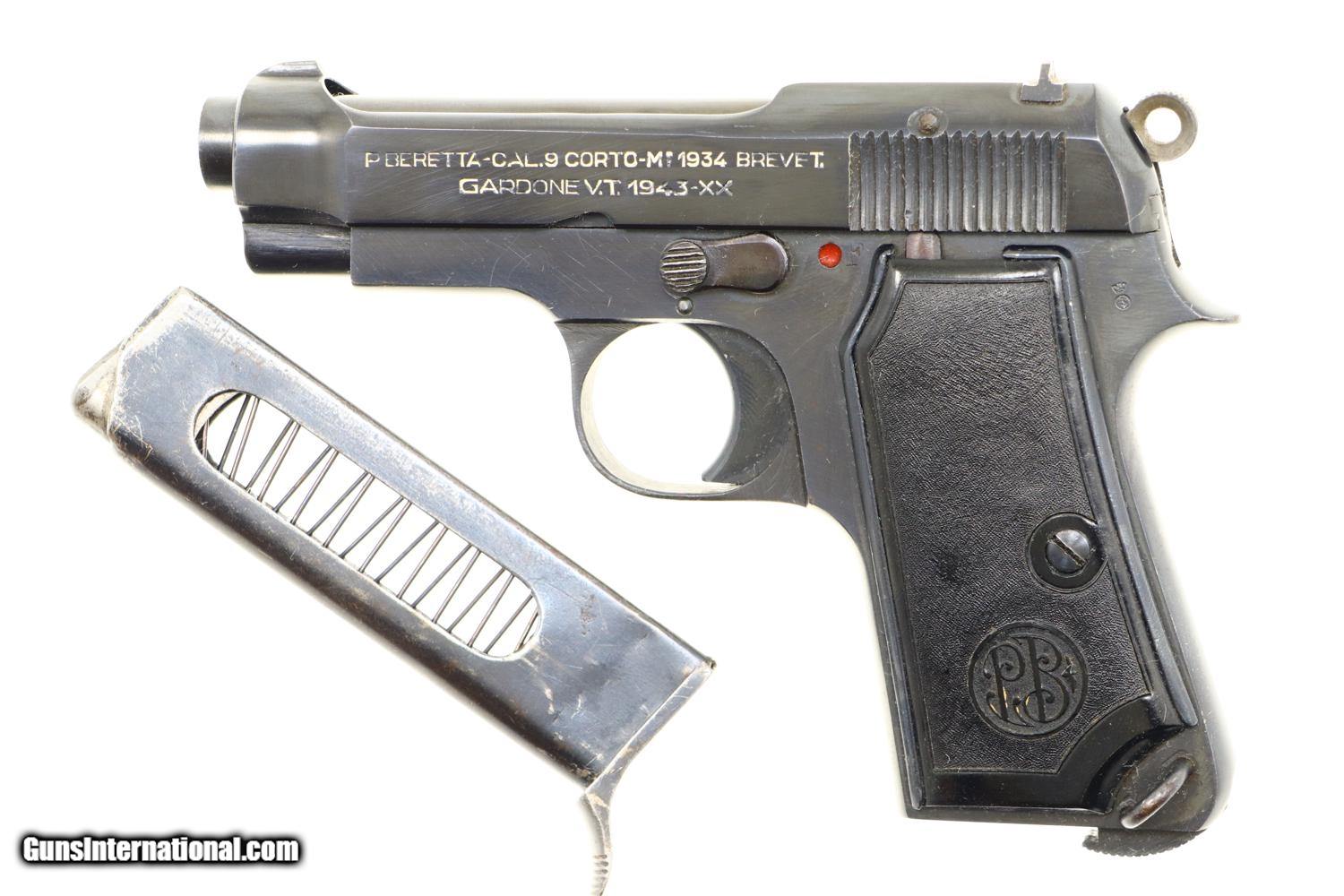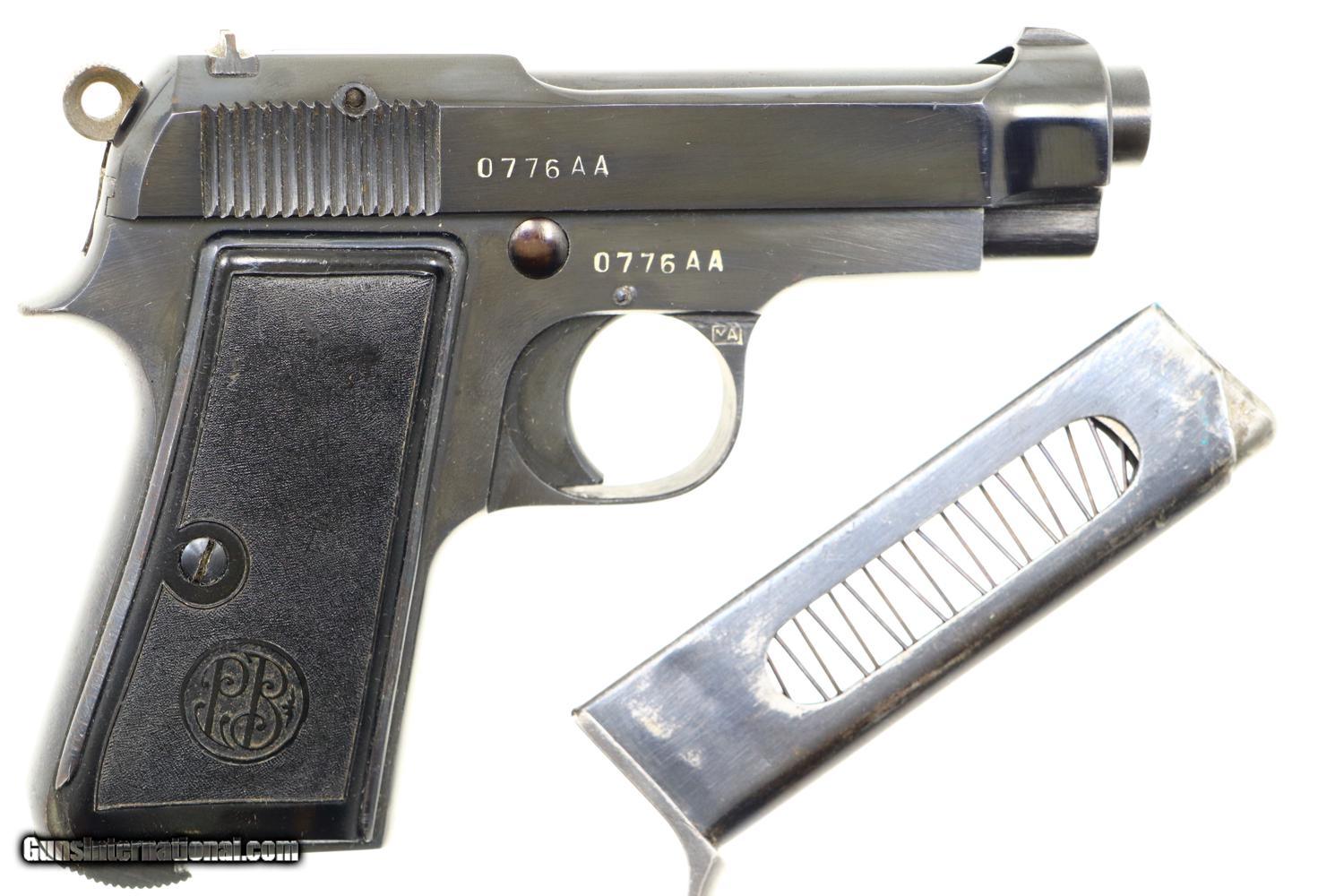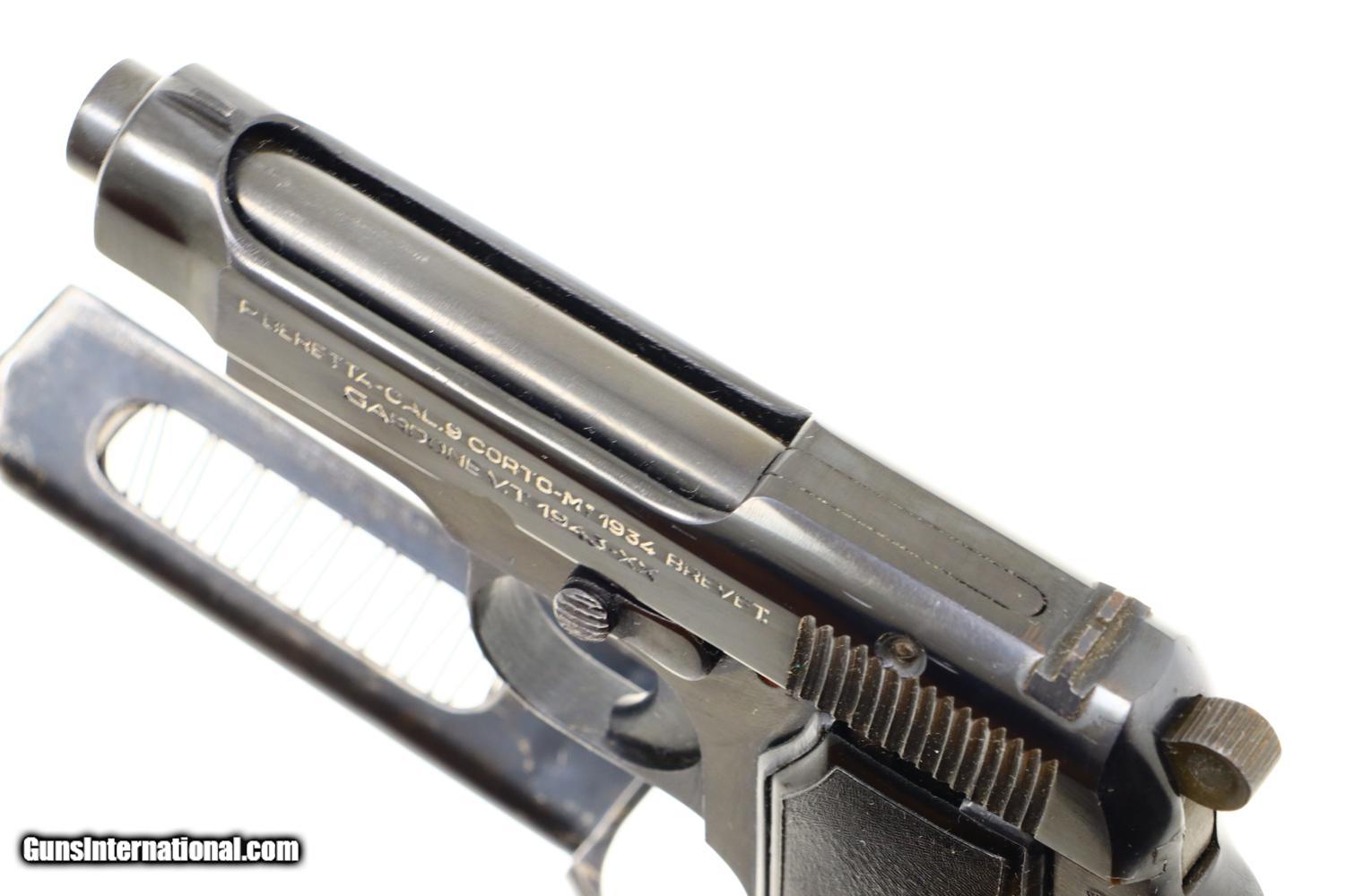 Description: Standard configuration Beretta 1934 pistol, caliber .380 ACP, with fixed front sight and a drift adjustable rear sight. Marked on the left side of the slide with two line address, all capitals , denoting caliber, model, and year of manufacture in 1943. “S” and red dotted "F" safety detents. Small proof on left tang. Boxed inspector markings on right trigger guard web. Full serial number on right side of barrel lug, right slide, and right frame. Standard metal backed plastic grips and blued magazine with finger extension floorplate. Synopsis: Exceptional Beretta 1934 pistol, WWII, early high polish, Nazi Military issue. Condition: Nearly 99% bright original high polish salt blue. Minimal sharp edge wear with faint freckling on the backstrap. Comparable condition grips, slightly burred grip screws. VG magazine with thinning finger extension floorplate. Mirror bright bore with sharp rifling. Perfect manual mechanics. A beautiful high polish Nazi contract Beretta M1934, made 1943, that would be very difficult to upgrade. ~~Insured shipping fee of $65; most packages shipped using FedEx 2nd Day.~~ SOLD Curio/Relic: Yes Manufacturer: Beretta Serial Number: 776AA Caliber Info: 9mmC |