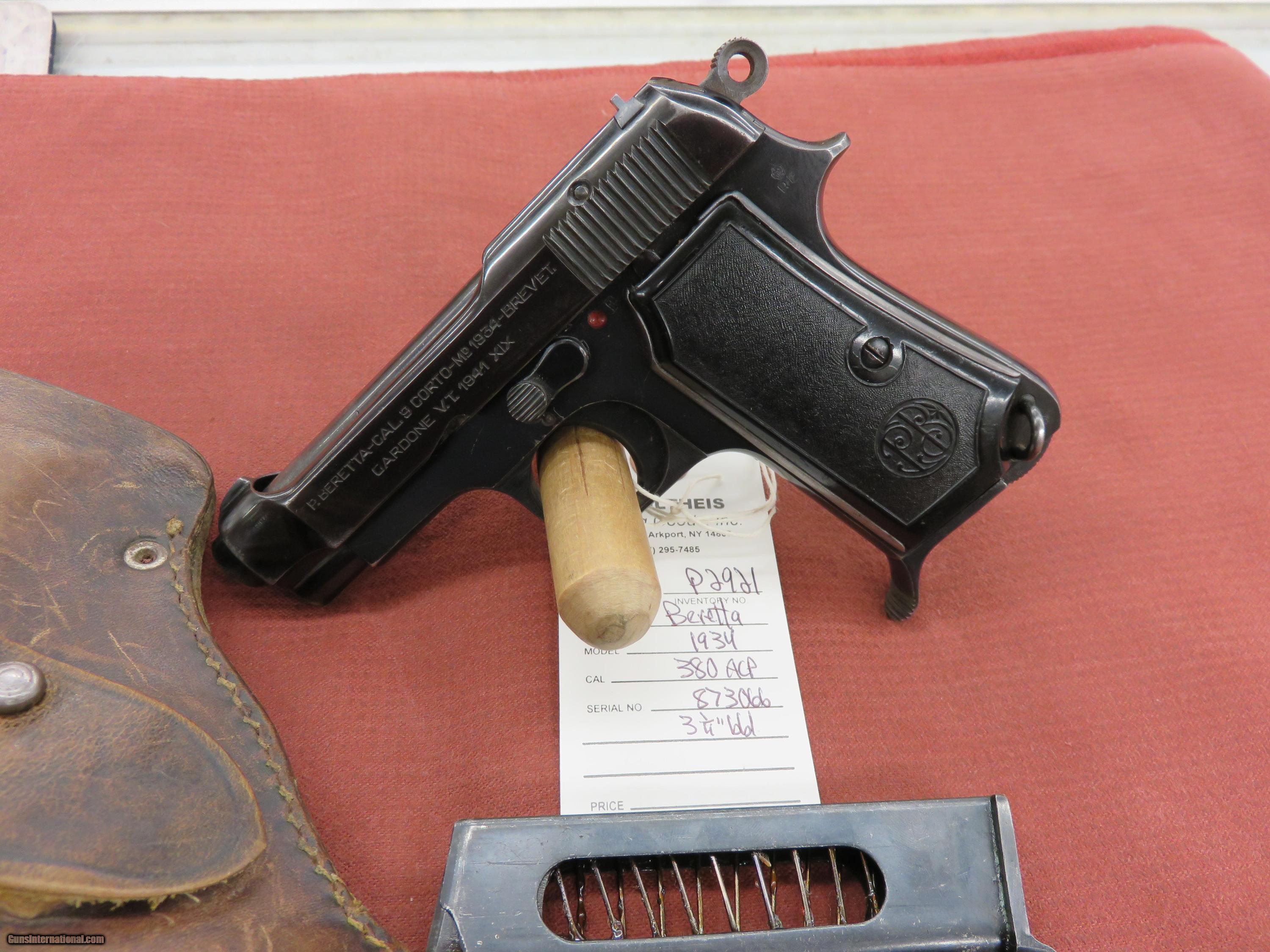 Description: Beretta 1934, 380 acp, #873XXX, slight holster wear, 93% blue, excellent bore and grips, crown over RE proof mark, all original with extra original magazine and old unmarked holster. SOLD |