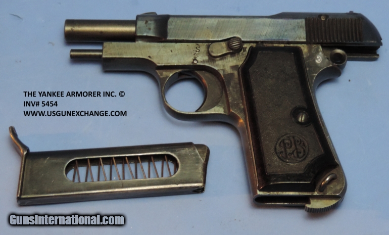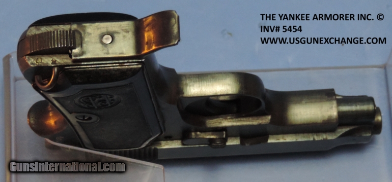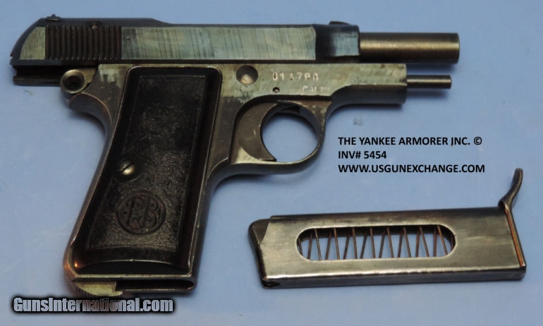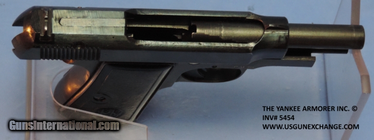 Description: Inv. 5454 Beretta 1935 (Nazi) "Blank Slide," Caliber 32 ACP, Serial Number 01147XX. There was probably in the very last run of Berettas. The condition is absolutely awesome retaining about 99.9+% of the factory blue. This gun looks like it just came off the production line and was captured. The finish is very crude with extensive machine marks all over. The gun has very distinct oval 4/UT for the Nazi inspection team designated, the "4th Unit Technical" which took over the Beretta plant at the end of the war. Reference, "Still's Book Axis Pistols" The only other markings are the caliber and the serial numbers. All parts match. The grip straps have not grayed. The plastic grip panels are perfect, no chips or splits. The bolt face and feed ramp show no use. The bore is just about factory new. A real find for the collector looking for an outstanding example. $695. To purchase this firearm or if you want to request more information contact us at: Email ckgunsymail Phone 201-512-0002 Cell 201-575-6838 FAX 201-215-4759 We accept most major credit cards. Prices shown are Discounted 3% for Cash or Check. The buyer must be familiar with all the laws governing the purchase and the ownership of firearms in their own city and state. The Yankee Armorer, Inc is not responsible for any failure to comply with or observe these laws. The Yankee Armorer, Inc will only ship after full payment and receipt of all required documents. Shipping: Add $35.00 for handguns, $45.00 for long guns. New Jersey buyers are subject to a 7% sales tax. The Yankee Armorer, Inc offers a 3 day inspection period with full refund upon return of intact firearm and in the original condition. The Yankee Armorer, Inc offers a no interest lay away program - 25% down; 25% in 30 days; 25% in 60 days; and full payment in 90 days. Any violation of this policy is subject to restocking and forfeiture of all payments. Any variation from this policy must be agreed to in advance. Unshipped Cancelled sales are subject to a 20% restocking fee. Be advised that all firearms sold by The Yankee Armorer, Inc. or the Gun Exchange, LLC (SELLER) are sold as collector’s items. They have not been fired or tested for safety and must be examined by a license gunsmith prior to use. By purchasing any item from the (SELLER), you are agreeing to hold the (SELLER) free from any damages or lawsuits of any nature. Any item left for transfer or storage will be charged to $25.00 per month, per item from the day of its receipt. Any variation from this policy must be agreed to in advance. Store hours 10:00 am to 5:00 pm Tuesday -Saturday. It's always best to call for appointment. Store 201-512-0002, cell 201-575-6838. SOLD Curio/Relic: Yes |