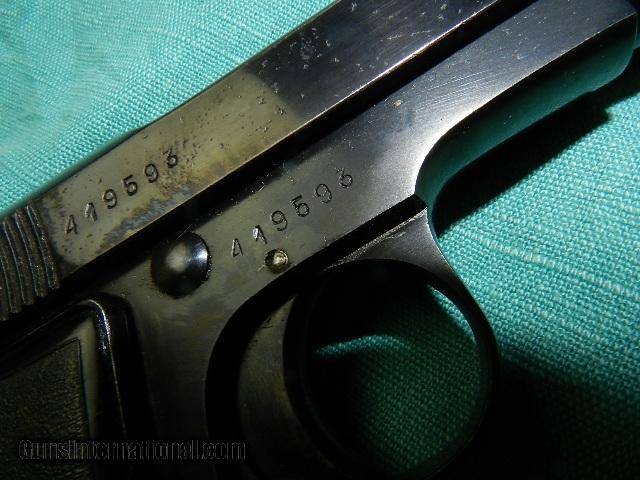 Description: A Clean, and rare 1934 Beretta with 1936 date,with about 95% blue with numerous, slight small speckles from storage, and almost no wear. This gun has a very clean bore, some slight roughness in grooves but strong rifling.The black monogrammed Beretta grips with a metal wartime backing are showing little wear.Action is verymgood, and has a proof mark of an eagle with a crown over it, the Royal AIR FORCE proof mark. Chambered for the .32acp.Matching numbers, and comes with one finger rest bottom mag of 8 rounds.A good wartime produced gun good enough for modern day carry. We don’t have asite .I prefer money orders or a check. Item ships when funds come in. If you can only pay with a card let me know. I hope you like my wide selection of unusual guns, knives and gun parts. I try to keep the prices affordable, which means I make less money than most dealers. I consistently have the best selection of older guns If you BUY IT NOW you must still contact us for details buy it now doesn't end the sale, it just sends an email telling us you want to buy this gun. A phone call won’t secure a sale! Not home many times, the first buyer by email buys the gun !Thissite doesnot close down a sale when you do a BUY IT NOW like Ebay!I can get six buy it nows in an hour, first buyer to email gets the guns, others are in second place! Best to send another email . Sometimes not home to get calls. Some guns are required shipment to a gun dealer near you for a transfer to you when it arrives. With the widest selection of older guns at great prices, We don’t have a store, and sell on the internet only. SOLD Curio/Relic: Yes |