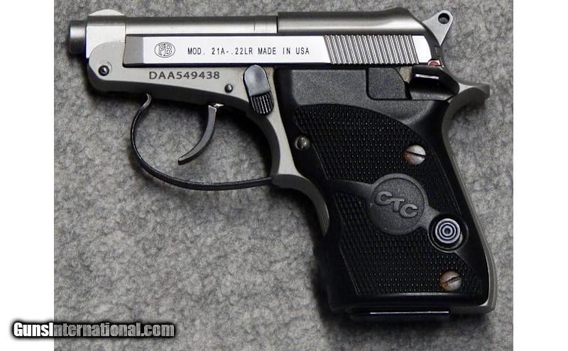 Description: Beretta ~ 21A ~ Chambered in .22 Long Rifle. Is a semi-auto rimfire pop up barrel pocket pistol. Features a 2.5" pop up barrel paired with iron sights. Firearm has a stainless steel finish and is complimented with black polymer Crimson Trace Laser Grips. Comes with generic hard case, polyester holster, and two 7 + 1 capacity magazines. .22 Long Rifle SOLD Chambers: .22 Long Rifle. Metal Condition: Very good condition. Bore Condition: Good condition. Triggers: 7.5 pounds. Weight: 0.75 pounds Sights: Iron sights. Item Location: Acworth, GA |