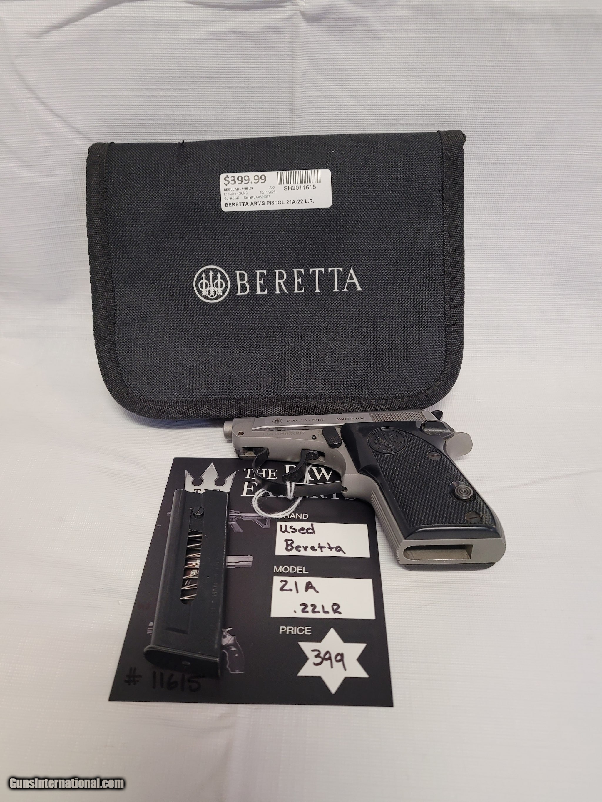Description: Guns Listing ID: 1044567 We have a Beretta 21A-.22 LR pistol for sale for $399.99. It comes with a soft case. If you are interested or have any questions feel free to contact us! Beretta Arms Pistol 21A-22 L.R. #11615 Maricopa Jewelry and Pawn 20800 N John Wayne Pkwy, Ste 109 Maricopa, AZ 85139 520-494-7066 SOLD Manufacturer: BERETTA Model: 21A Caliber Info: .22 LR Condition: Used - Non-Certified Barrels: 2.5 BARREL Finish: MATTE STAINLESS |
