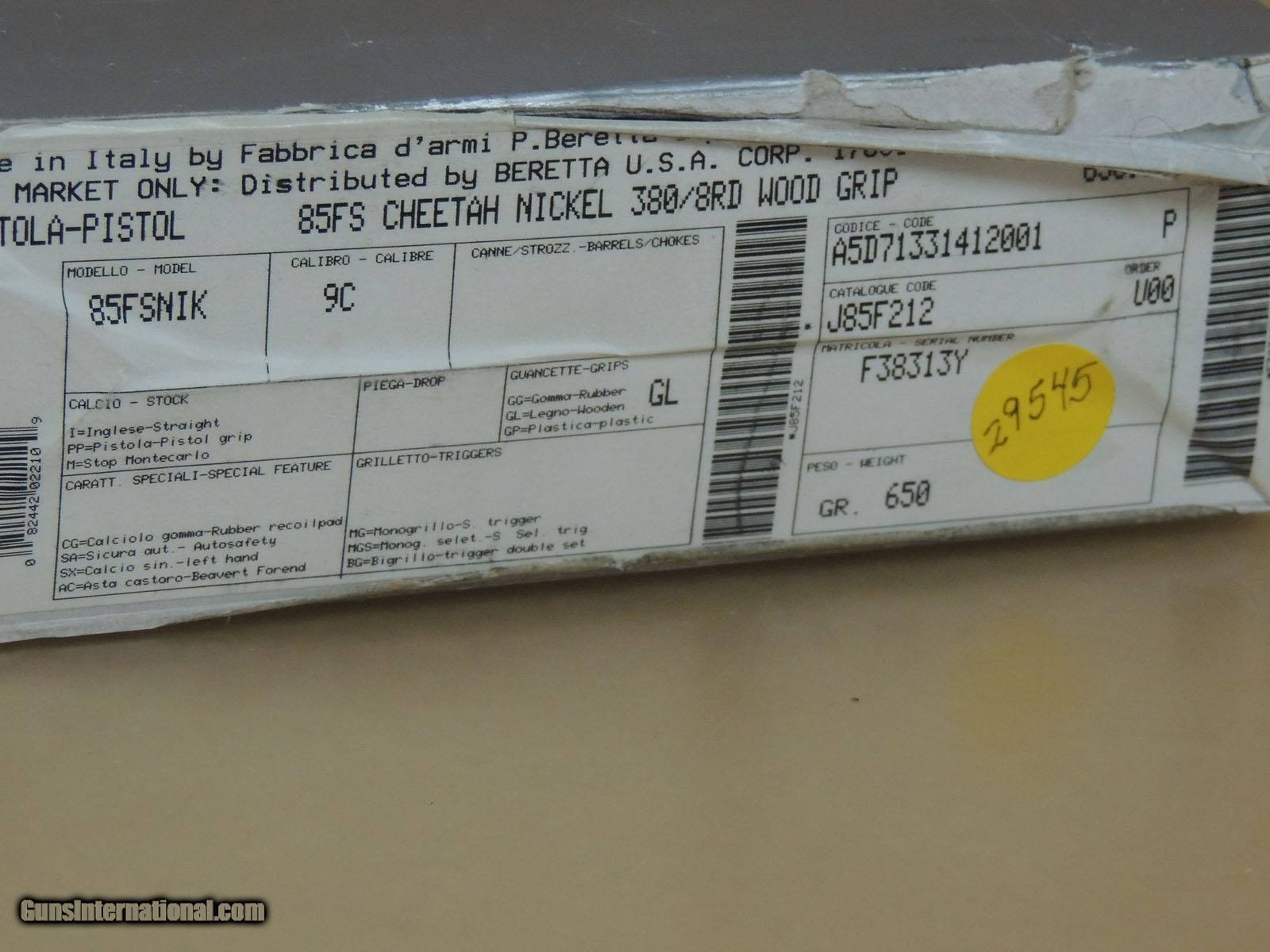 Description: BERETTA 85 FS CHEETAH NICKEL .380 PISTOL IN BOX, MADE IN ITALY, 99%, WITH BOX , CASE AND PAPERS $775 ******* (PLEASE REFERENCE OUR INVENTORY NUMBER) (PAYMENT OPTIONS) (Postal Money Order) (Cashiers Checks) (Personal Checks (Item held until Check Cleared) ***(Layaway 120 days-(No Interest)-(Pay any way, any time you like over the term) -(Deposit required)*** (Credit Cards Visa or Master Card 3% fee added to total sale) (GA residents 7% sales Tax Applies) (FAX 888-597-1394) (BEST PHONE/TEXT 229-424-8450) (Shipping $35.00) SOLD |