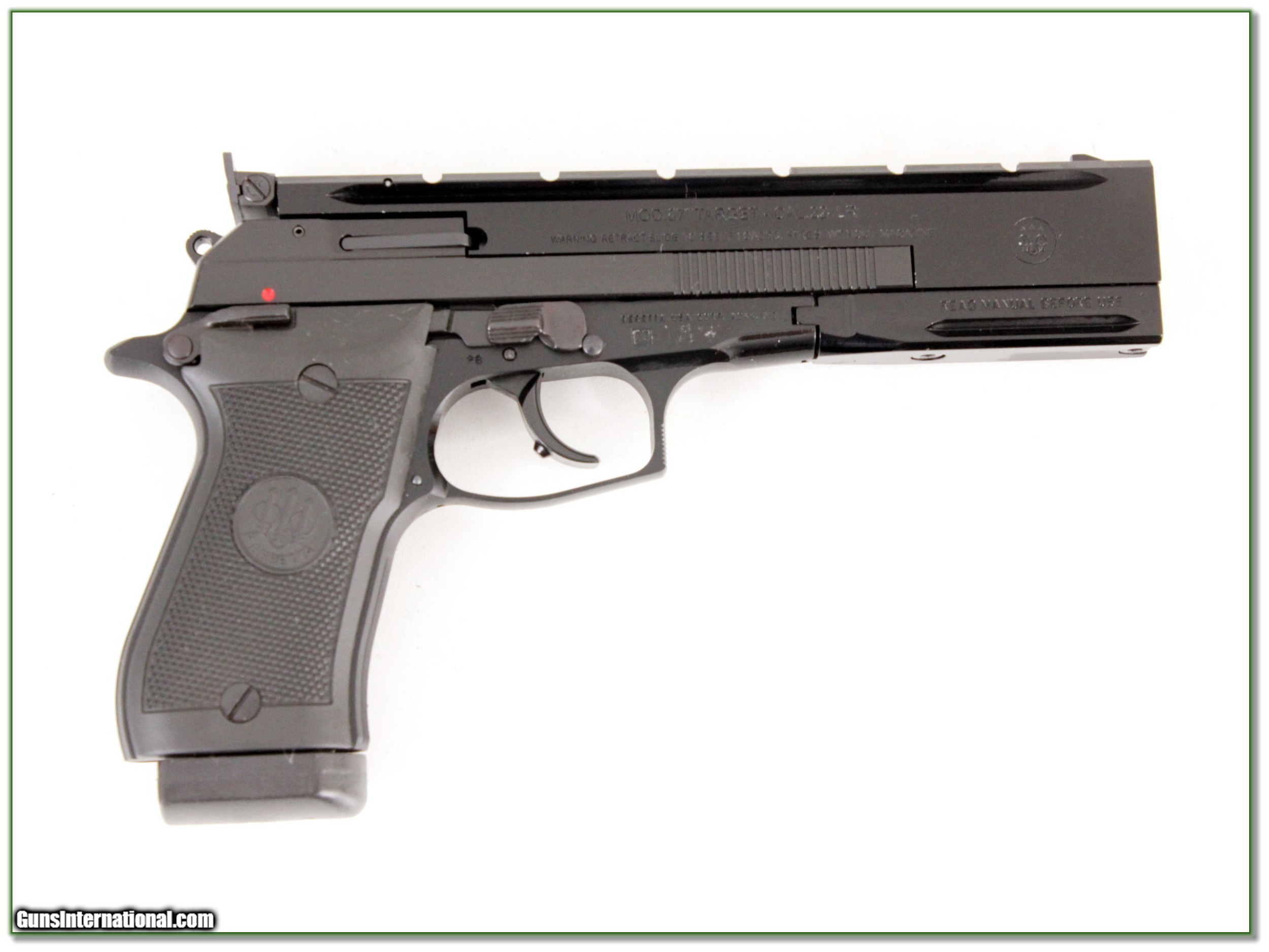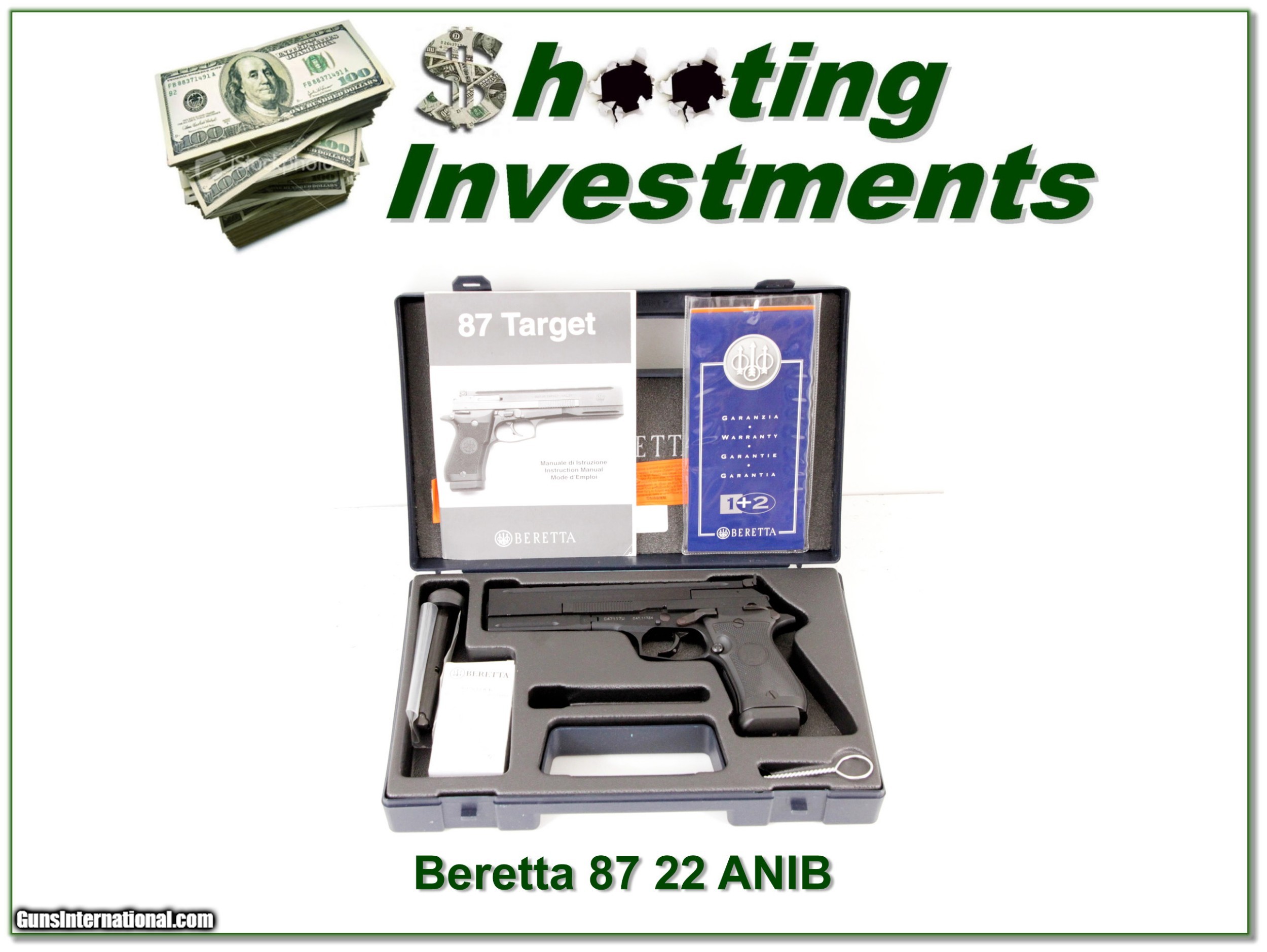 Description: This is a new and unfired Beretta 87 TARGET 22 LR Pistol. It comes as seen on original case with original outer box (not pictured), 2 magazines and papers. I am selling this one on consignment and as such lay-a-way can’t be used. It does of course have the standard 3-day inspection. Shipping and insurance is $39. Please email me with any questions or larger pictures. (Consign your quality firearms with Shooting Investments for only 12%! Let me know if you have any you would like to sell!) 18-0269 Payment: Payment is by Money Order, Cashiers Check or Personal Check. I can now also accept MasterCard and Visa with a 3% convenience fee. PayPal can be used for some items but never firearms. Please let us know if you would like to pay via PayPal. Shipping: The shipping charge will be listed in each description. It is $39 for most long guns and $29 for most handguns. Some heavy guns or those insured for over $2000 will be higher. Shipments to Alaska and Hawaii are higher because air shipment is required. Most firearms are shipped on Tuesday and Thursday and usually in 5 days of receipt of payment. We package all shipments carefully and insure them. For long guns you can purchase a new Plano case for $19. They now cost us $22 when buying 100 at a time. Optics are shipped Priority Mail and most other non-firearm shipments are shipped First Class. Returns: Our return policy is simple. If for any reason you are not pleased with your purchase, you may return your item for a full refund of purchase price. Ammunition cannot be returned. It is important to us that you are happy. Guns cannot be fired or dissembled before returning them and they must be returned in the same condition as received. Notification of a return must occur with-in 3 days of receipt at your dealer. Shipping, convenience and dealer fees are not refundable and are the responsibility of the buyer. Lay-a-way: If needed, we offer a 60 day lay-a-way option on most firearms. It is 1/3 now, 1/3 in 30 days and 1/3 in 60 days. Lay-a-way firearm sales are final and if not completed the first payment cannot be returned. Consigning your firearms with Shooting Investments: We will help you get top dollar for your firearms. While most local guns shops charge 20% or more, our fee is only 12% with a minimum of $75. At your local gun shop it might take months to sell. Selling on-line provides instant access to thousands of interested buyers. You won’t find any other on-line dealer willing to sell your firearms for only 12% or listing every gun on 3 separate s. Selling through an House typically costs the seller 15% and the buyer an addition 15% (so 30%) and you have to wait several months to sell and longer to receive funds. If properly priced, we will sell your firearms in a few weeks. Send us an email or give us a call and we’ll explain how easy it is for you to get top dollar. Trading: Trading for use is really just buying your gun to re-sell. If you have a gun you want to trade, please email a picture and we will let you know what we can give or it. You will always get more if we sell it for you on consignment. Help for California Buyers: We are happy to ship to California. It is the buyer’s responsibility to make sure any item you buy is legal in your state. We are also happy to help with your purchase of a firearm from someone other than us. If you see a gun you would like to buy but the seller can’t or won’t ship to California they can ship to use and we’ll then ship it to your California dealer. The cost for this service is only $30 + shipping. Let us know if we can help! SOLD |