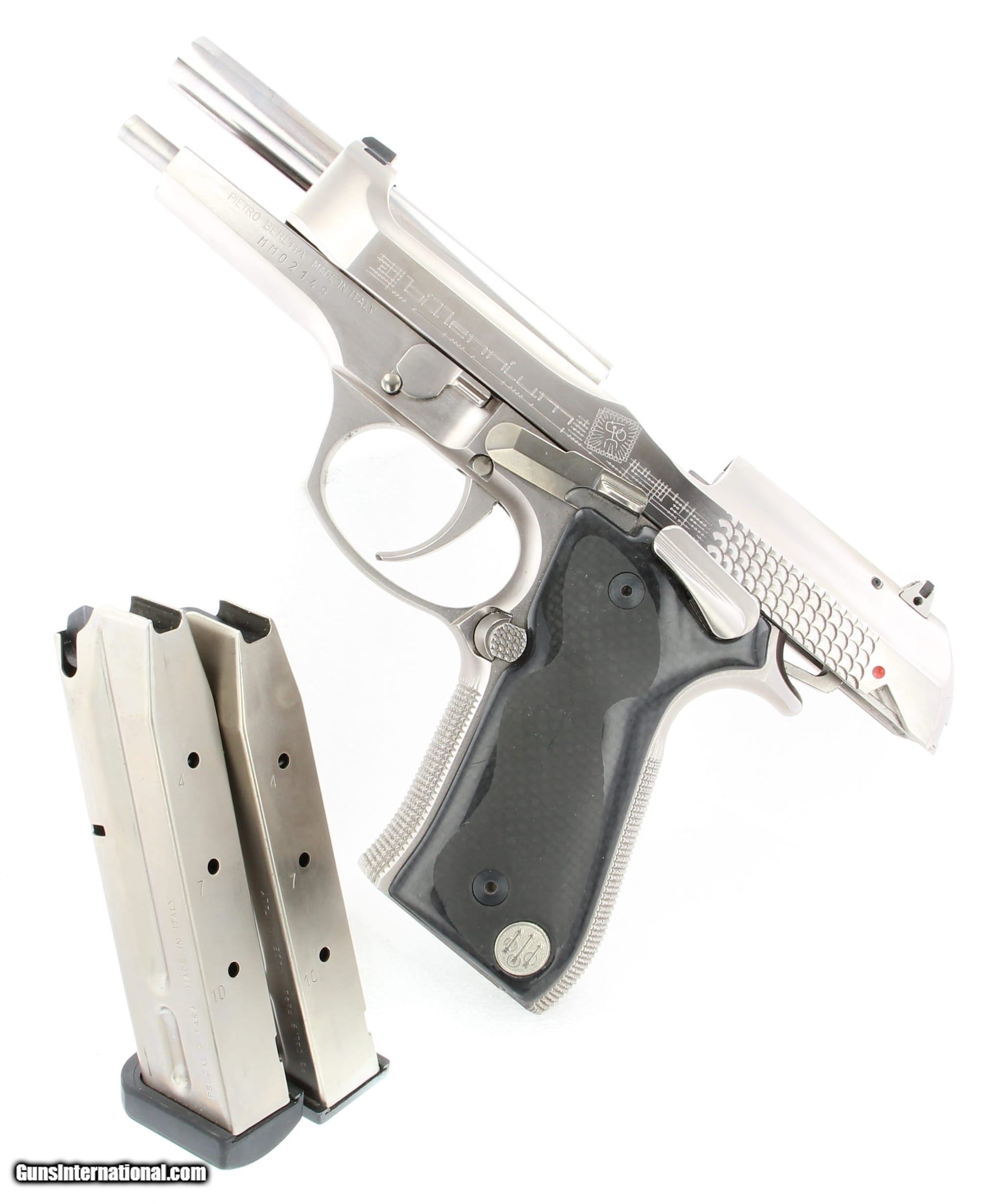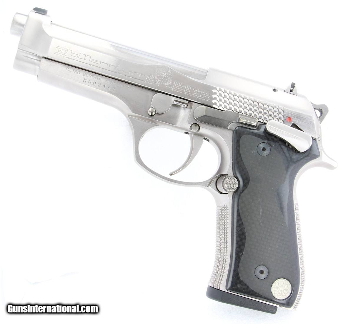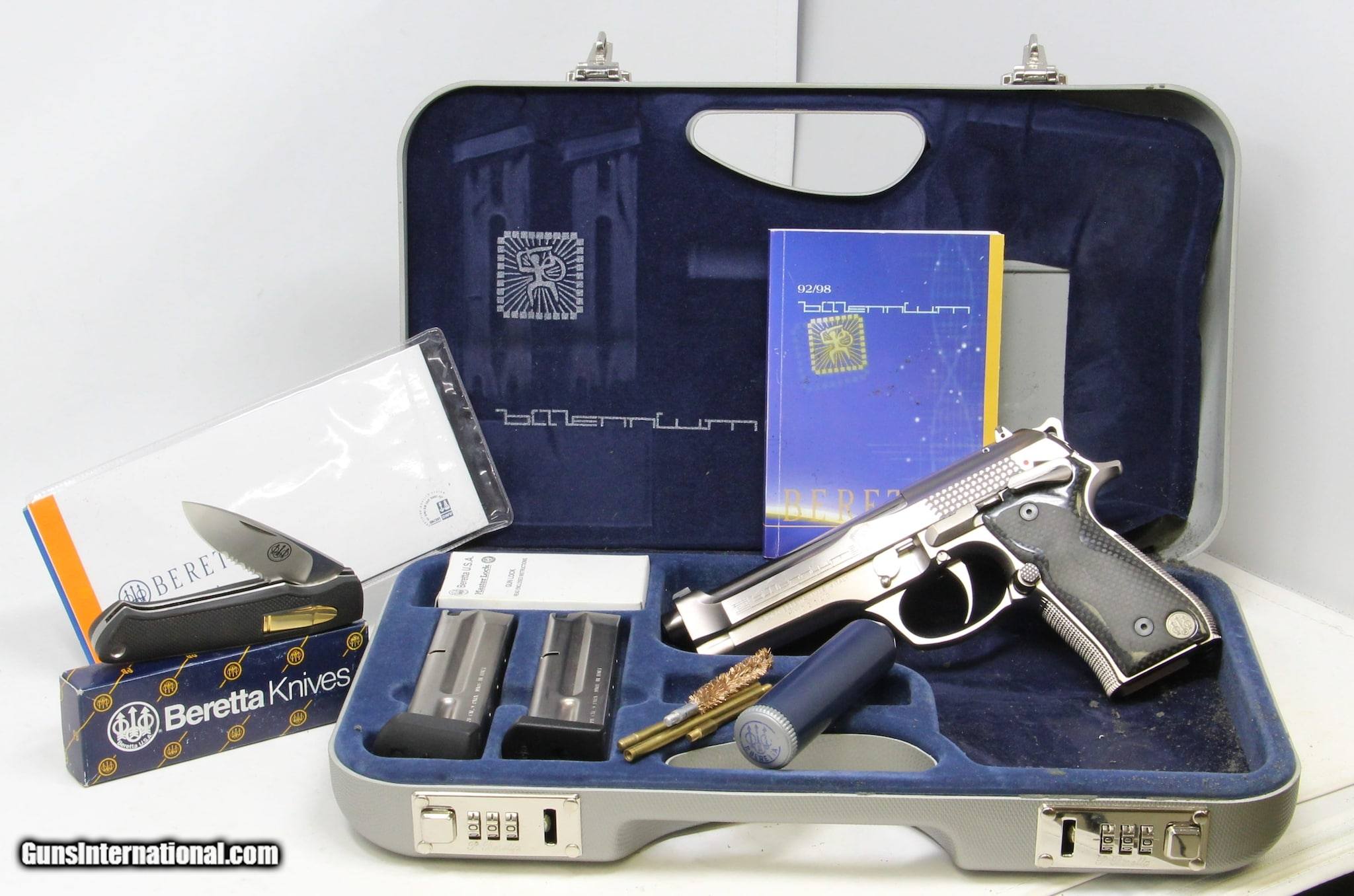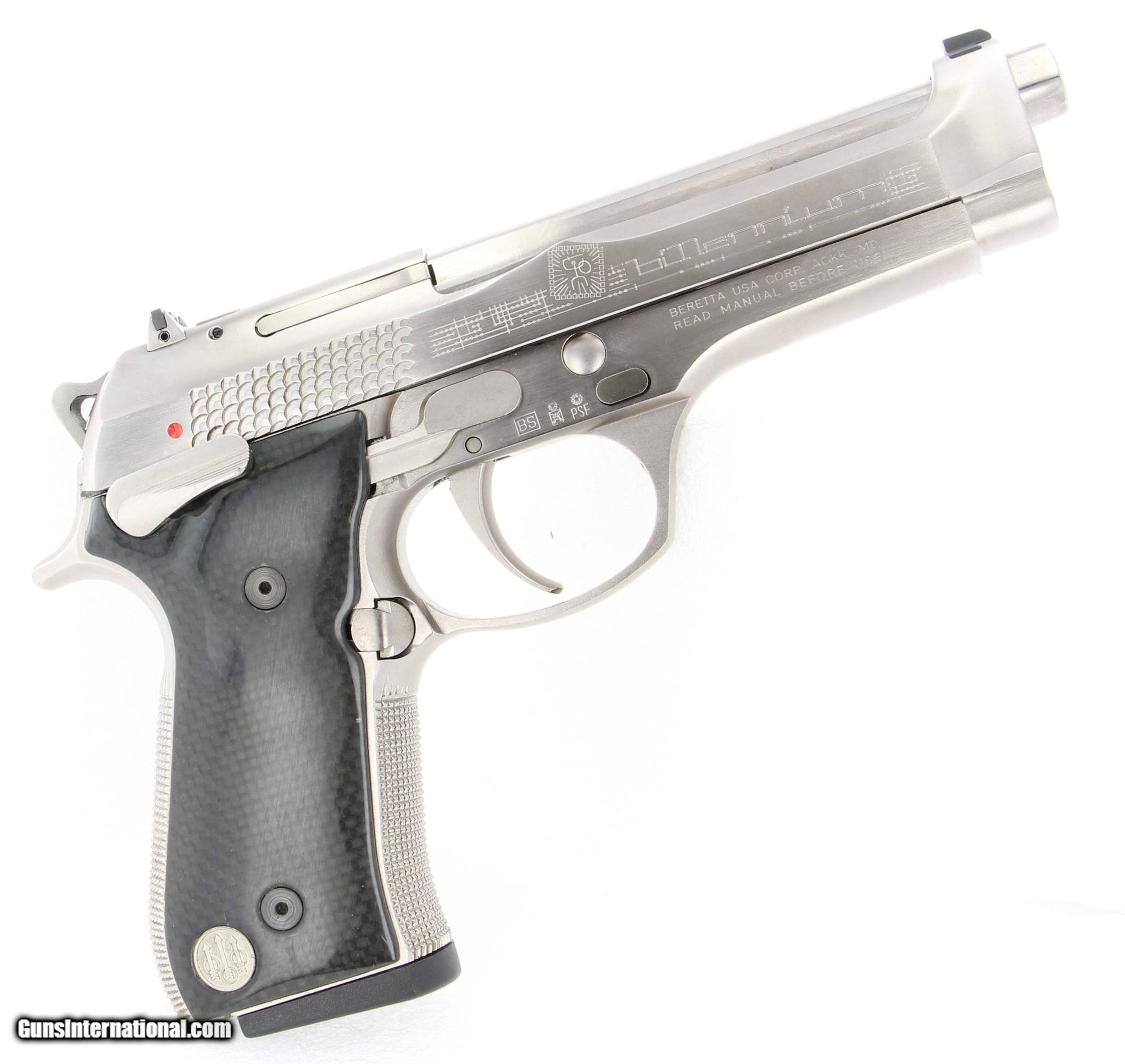 Description: Guns Listing ID: 680164 NEW NEVER SHOT, NEW OLD STOCK CONDITION Up for sale is a New Old Stock Beretta 92 Biliennium 9x19 - 9x21 IMI will come with all accessories. Box shows age and storage wear, internals have degraded, gun and accesories are in new never used condition. The new Beretta 92 Biliennium is the synthesis of the long-standing experience with the 92 model, manufactured in well over 2 million units, and offers unique and innovative features for the new Millennium. Created with true connoisseurs and the more active and expert marksmen in mind, the Beretta 92/98 Biliennium was manufactured in only 2000 units, and is destined to become a collector‚‚s item. UNIQUE FEATURES: Steel frame. 92/98 Biliennium pistols feature an exclusive frame manufactured in high resistance steel and special satin/polished nickel-alloy based finish. The slide was widened near the slide rails. The slight increase in the weight gives the pistol better stability while firing. The reconfigured front profile also allows for a removable dovetailed front sight. Special designed side gripping surface provides fast, easy racking of the slide. 92/98 Biliennium pistols feature a manual safety on the frame that locks the sear and the slide in the closed position. Safety can be inserted with hammer lowered or cocked. Frame mounted, ambidextrous for easier thumb access. Extended length and width. The short and light single action trigger pull allows for faster, more accurate discharge of subsequent rounds. The use of carbon fiber gives the gun a highly technological and innovative look. The central portion of the grips is finished with a thin layer of soft-touch anti-slip material, to increase resistance to wear and abrasions. 92/98 Biliennium pistols feature a competition-tuned trigger with screw to adjust the extra short let-off and over travel. The magazine release button can easily be assembled on the right side of the pistol for left handed shooters. It features extended dimensions for competition use. Its checkered surface secures elevated anti-slip properties. A traditional reversible magazine release button for 92 series pistols is included. The front and back straps are fully checkered to ensure a firm hold. The top of the grip area is precisely curved and relieved for a firmer, more comfortable grip. The magazine release button can easily be assembled on the right side of the pistol for left handed shooters. It features extended dimensions for competition use. Its checkered surface secures elevated anti-slip properties. A traditional reversible magazine release button for 92 series pistols is included. Model 92/98 Biliennium pistols have a high capacity magazine*, which is quickly removed for rapid reloading. The pistol comes with a traditional magazine of the 92 pistol series. A magazine with a rubber bumper is included. Front and rear sights are dovetailed into the slide for possible replacement. The rear sight is micrometrically adjustable for windage. The skeletonized hammer give the pistol a new and distinctive look Model 92 BILLENNIUM Caliber 9 Para Magazine Capacity Rds 15 Operaction Semi-Automatic, short recoil of barrel Locking System Locked-Breech, Falling Block Action Single Action Only Barrel Steel with special polished gey nickel based finish Barrel Length 125 mm 4,9\" Rifling, Pitch R.H., 6 Grooves, Pitch 250 mm (9,84\") Safeties Manual safety on the frame, Automatic firing pin block Overall Length 217 mm 8,5\" Overall Width 44,5 mm 1,7\" Overall Heigth (2) 140 mm 5,7\" Sight Radius 159 mm 6,3 \" SKU: 2212001 SOLD Manufacturer: BERETTA Model: 92 Biliennium Caliber Info: 9MM LUGER (9X19 PARA) Condition: Used - Non-Certified Barrels: 5 BARREL Finish: STAINLESS |