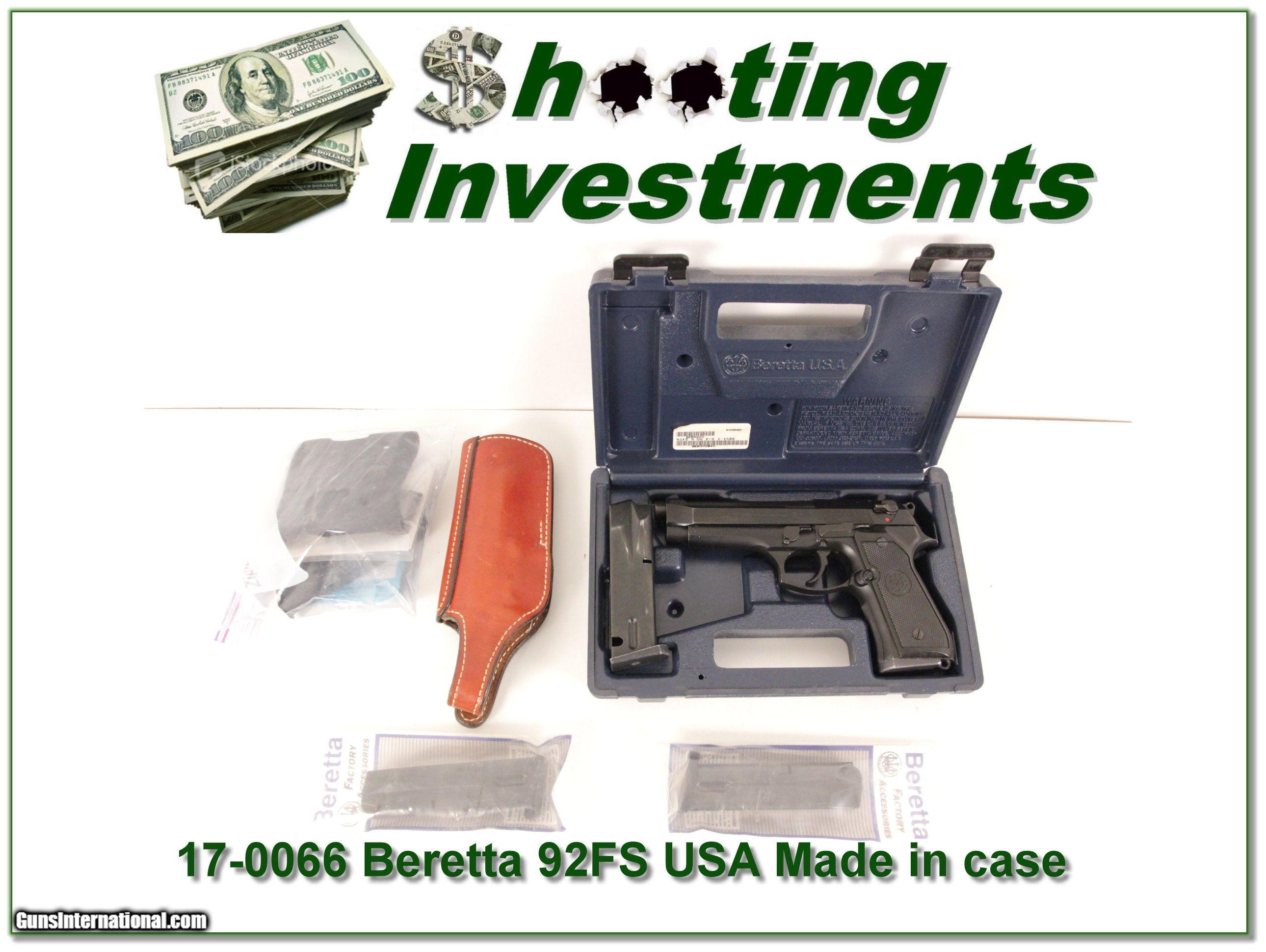 Description: This is a USA Made Beretta 92FS in case. It is nice with some use as seen. It comes with 5 Magazines, a second set or grips and leather holster. I am selling this on consignment; as such, lay-a-way can’t be used. It does of course have the standard 3 day inspection. Shipping and insurance is $29 or $19 more if you want it shipped in a new Plano hard case. Please email me with any questions or larger pictures. (I now consign quality firearms only 10%! Let me know if you have any you would like to sell!) [17-0066] Payment: Payment is by Money Order, Cashiers Check or Personal Check. I can now also accept MasterCard and Visa with a 3% convenience fee. PayPal can be used for some items but never firearms. Please let us know if you would like to pay via PayPal. Shipping: The shipping charge will be listed in each description. It is $39 for most long guns and $29 for most handguns. Some heavy guns or those insured for over $2000 will be higher. Shipments to Alaska and Hawaii are higher because air shipment is required. Most firearms are shipped on Tuesday and Thursday and usually in 5 days of receipt of payment. We package all shipments carefully and insure them. For long guns you can purchase a new Plano case for $19. They now cost us $22 when buying 100 at a time. Optics are shipped Priority Mail and most other non-firearm shipments are shipped First Class. Returns: Our return policy is simple. If for any reason you are not pleased with your purchase, you may return your item for a full refund of purchase price. Ammunition cannot be returned. It is important to us that you are happy. Guns cannot be fired or dissembled before returning them and they must be returned in the same condition as received. Notification of a return must occur with-in 3 days of receipt at your dealer. Shipping, convenience and dealer fees are not refundable and are the responsibility of the buyer. Lay-a-way: If needed, we offer a 60 day lay-a-way option on most firearms. It is 1/3 now, 1/3 in 30 days and 1/3 in 60 days. Lay-a-way firearm sales are final and if not completed the first payment cannot be returned. Consigning your firearms with Shooting Investments: We will help you get top dollar for your firearms. While most local guns shops charge 20% or more, our fee is only 10% with a minimum of $75. At your local gun shop it might take months to sell. Selling on-line provides instant access to thousands of interested buyers. You won’t find any other on-line dealer willing to sell your firearms for only 10% or listing every gun on 3 separate s. Selling through an House typically costs the seller 15% and the buyer an addition 15% (so 30%) and you have to wait several months to sell and longer to receive funds. If properly priced, we will sell your firearms in a few weeks. Send us an email or give us a call and we’ll explain how easy it is for you to get top dollar. Trading: Trading for use is really just buying your gun to re-sell. If you have a gun you want to trade, please email a picture and we will let you know what we can give or it. You will always get more if we sell it for you on consignment. Help for California Buyers: We are happy to ship to California. It is the buyer’s responsibility to make sure any item you buy is legal in your state. We are also happy to help with your purchase of a firearm from someone other than us. If you see a gun you would like to buy but the seller can’t or won’t ship to California they can ship to use and we’ll then ship it to your California dealer. The cost for this service is only $30 + shipping. Let us know if we can help! SOLD |