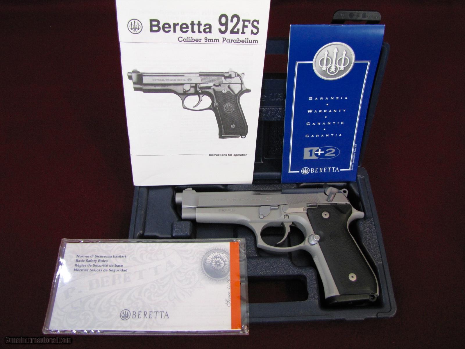 Description: I have for sale a like new Beretta 92 FS Inox in original box and Beretta hard case. This is the Inox model with is stainless steel making for worry free maintenance. The slide, barrel and internal parts are all stainless, while the alloy frame is anodized to match the color and finish of the other components. It also features stippled-textured soft rubber grips to help absorb recoil while giving you a positive grip. The 92 FS is a double/single action semiauto pistol that employs an open slide, short recoil system which gives you a faster cycle time and delivers exceptional accuracy and reliability. The open slide practically eliminates "stove-piping" and gives you flawless cycling and feeding even after thousands of rounds. The fact that the military has recently renewed it's contract for this firearm speaks volumes to the reliability and accuracy of this firearm. This gun is in very near perfect condition and has been fired very little. It is a one owner gun and comes with three magazines, hard case, manuals, and original box. Price of the gun is $550 plus $25 shipping to your FFL. As always there is a three day non-firing inspection period with the buyer paying shipping charges if returned. The three day period begins when the gun arrives at the dealer. SOLD Manufacturer: Beretta Model: 92 FS Inox Caliber Info: 9mm Condition: Excellent / As New Metal Condition: Excelent / As New Finish: Stainless Steel Sights: 3 Dot Red Extras: Box and Manual Case: Beretta Hard Case |