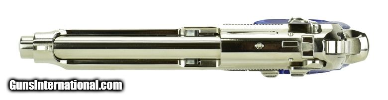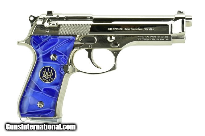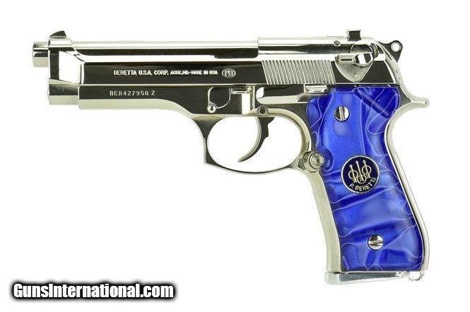 Beretta 92FS 9mm caliber pistol. Customized with bright nickel finish and fancy grips.