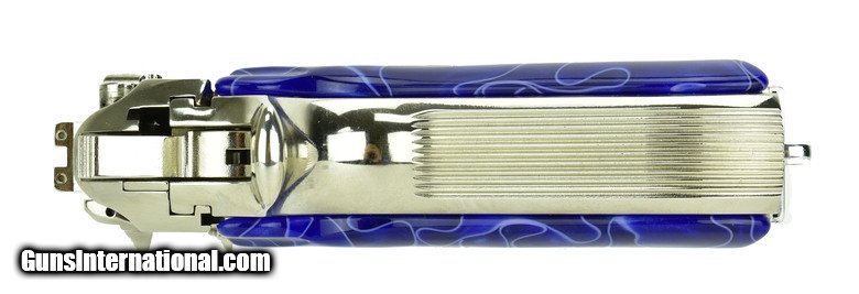 Description: Beretta 92FS 9mm caliber pistol. Customized with bright nickel finish and fancy grips.