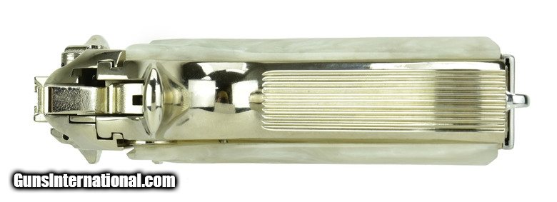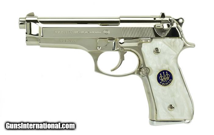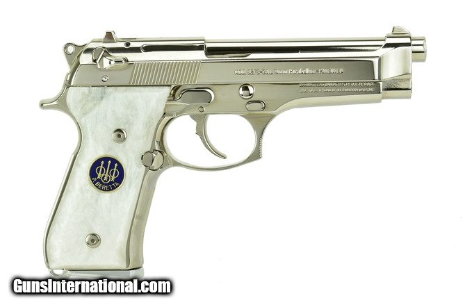 Description: Beretta 92FS 9mm caliber pistol. Custom bright nickel finish with fancy grips.