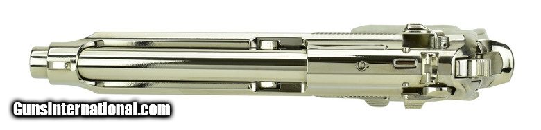 Beretta 92FS 9mm caliber pistol. Custom bright nickel finish with fancy grips.