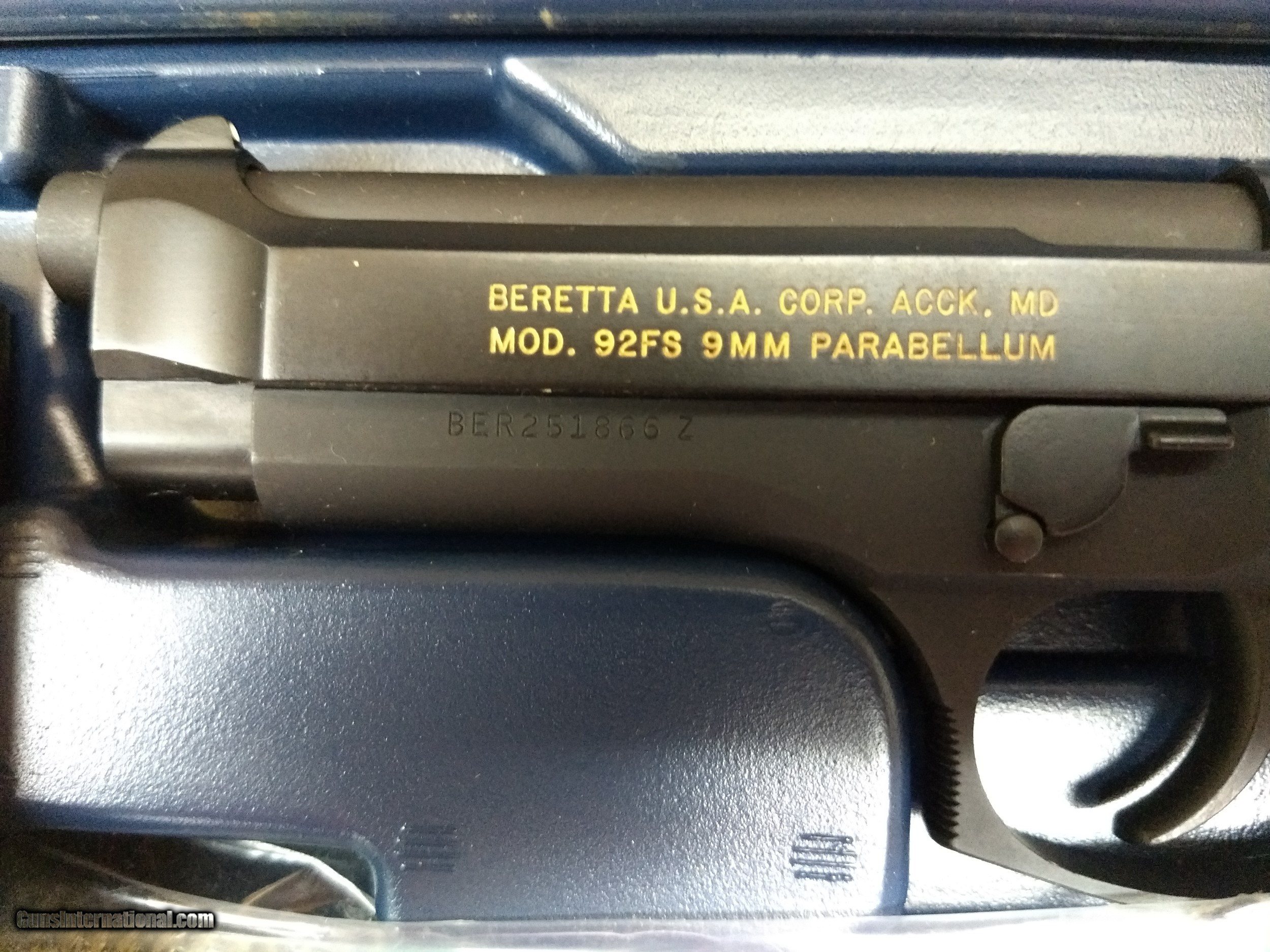 Description: This was a limited run of Berettas offered to the FBI National Academy graduates in the late 80s and early 90s. This beauty has gold plated inlays on the slide and a NA number on the frame unique to this prticular gun. The FBI NA seal is imbedded in each grip. The grip screws are also gold plated. The sights have white dots front and rear. Complete with two new 15 round factory magazines and cleaning tools. All of this in its own factory hard case. This firearm is spotless new. Never fired. Slide never racked. Stored in a gun safe since aquisition. This particular run is now out of production and will never be issued again. This could be a chance for the serious Beretta collector to add a hard to find piece to their collection. Private seller. I will have to ship to a FFL dealer with my I.D. included. Please make sure your dealer is ok with this before you commit to buy. I am new to GI but you can view my feedback from GB at my last sale item 815379594. No California sales. REASONABLE OFFERS CONSIDERED. SOLD Manufacturer: Beretta Model: 92FS FBI National Academy Caliber Info: 9mm Condition: New Metal Condition: New Wood Condition: New Bore Condition: New Finish: Matte Sights: White dots Manufacture Date: 1993 Item Location: Mississippi |