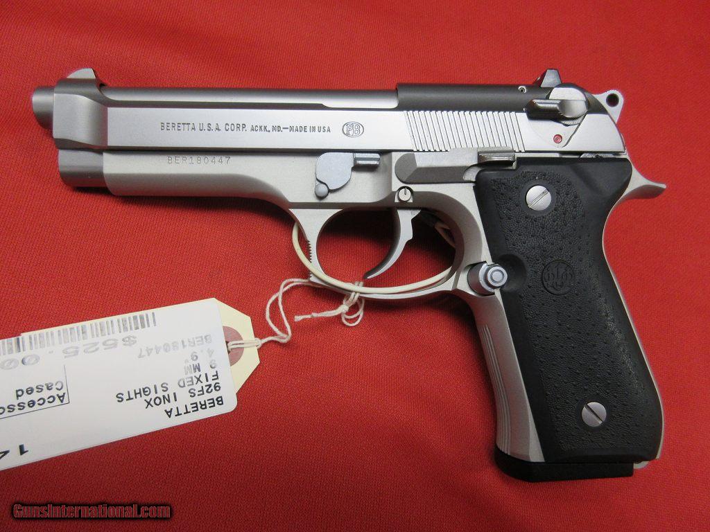 Description: Beretta 92FS Inox 9mm 5" w/ Fixed Sights (USED)-- Factory original and excellent condition: fixed three dot sights, matte stainless slide and frame, black rubber grips, comes with the factory case and 2-15 round magazines. SOLD |