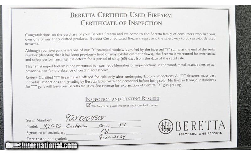 Description: The Beretta 92GTS Centurion features the proven reliability of the 92 Series family of firearms with the state-of-the-art features that you're looking for in a modern defensive pistol. Factory Certified Used – Beretta Type 92. "Y1" coded indicating that it has been thoroughly checked by Beretta factory trained personnel for safety and function, but may have been previously fired and/or has minor cosmetic flaws. It may also be missing original accessories. Comes in a factory box with 2 magazines and accessories along with a factory certificate of inspection. Please note: This firearm is being "SOLD AS USED". The firearm is factory warranted for mechanical and safety performance against defects for a period of 60 days from the date of retail sale. SN:92X0104958 9mm Luger SOLD Metal Condition: Very Good Bore Condition: Bright and Shiny Barrels: 4.25 Triggers: X-Treme S Trigger System Weight: 1.95 lbs. Sights: Fiber Optic Front / Serrated Rear with Optic Cut Slide Item Location: League City, TX |