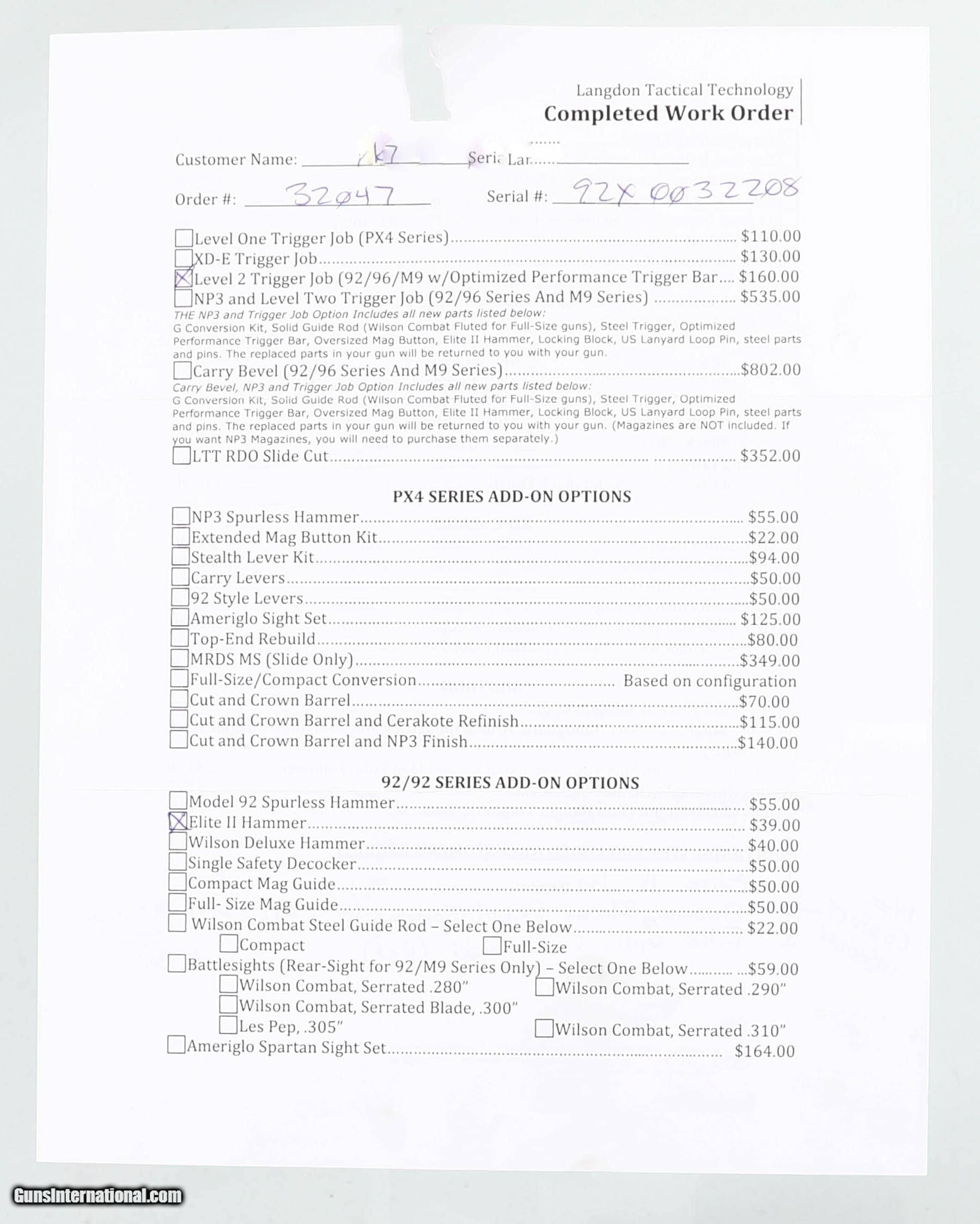 BERETTA 92X LANGDON TACTICAL TRIGGER JOB & HAMMER 9MM LUGER (9X19 PARA)