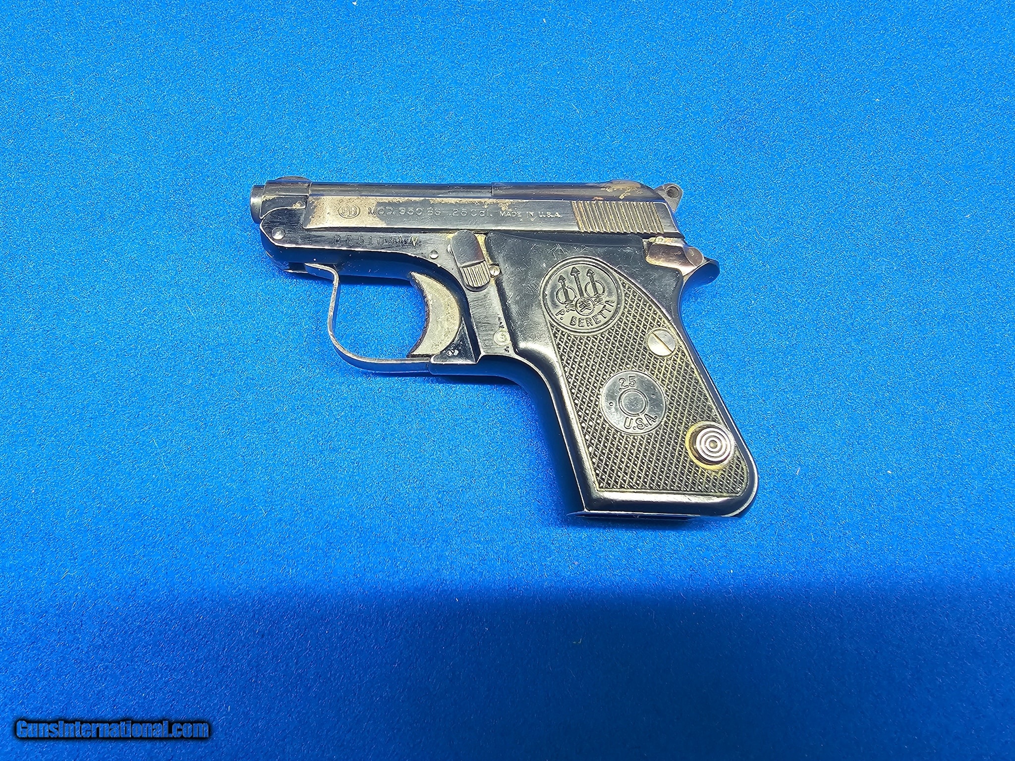 Description: Guns Listing ID: 973472 Beretta 950BS NO MAGAZINE included. Some of the bluing has worn off of the firearm which is pictured above. SOLD Manufacturer: BERETTA Model: 950 BS Caliber Info: .25 ACP Condition: Used - Non-Certified Barrels: 2.4 BARREL Finish: BLUE |