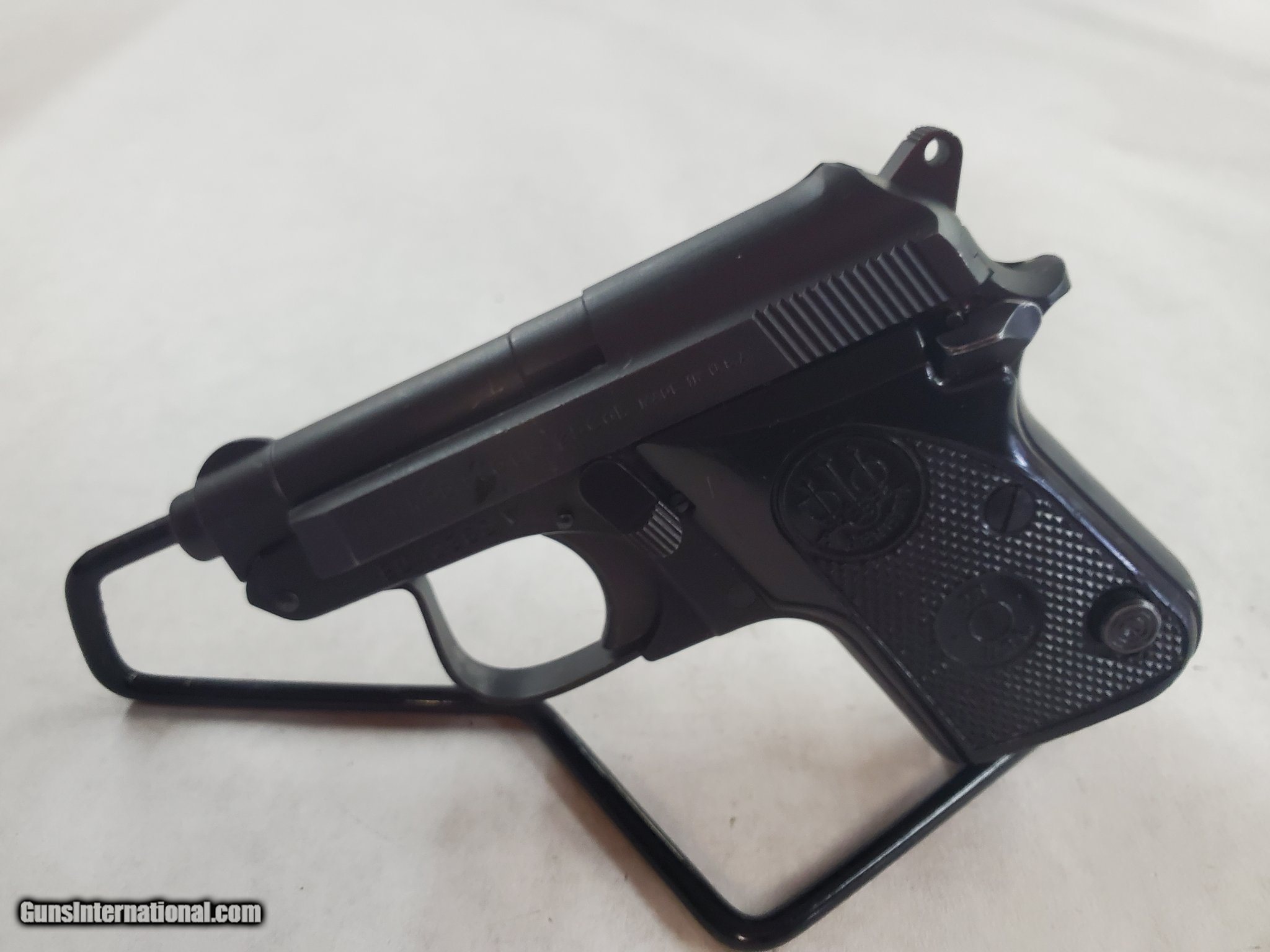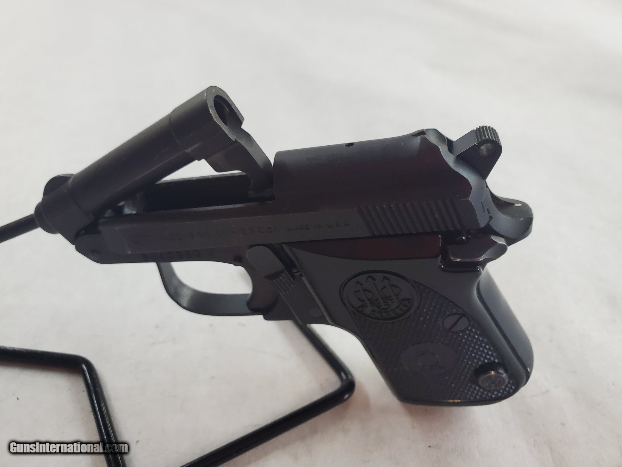 Description: Guns Listing ID: 530641 The Beretta 950 BS Jetfire is a compact, single-action semi-automatic pistol chambered in .25 ACP, renowned for its small size and classic design. Introduced in 1952 and produced until 2002, it was originally manufactured in Italy, with later models assembled in the United States. The \"BS\" designation indicates the inclusion of a left-side thumb safety, distinguishing it from earlier models. northeastshooters +1 gun-tests +1 berettaweb en.wikipedia +1 americanhandgunner +1 ?? Specifications Caliber: .25 ACP Action: Single-action semi-automatic Barrel Length: 2.4 inches (60 mm) Overall Length: 4.7 inches (120 mm) Height: 3.4 inches (87 mm) Width: 0.9 inches (23 mm) Weight (unloaded): 10 oz (280 g) Frame Material: Aluminum alloy Slide and Barrel Material: Carbon steel Grip Material: Plastic Magazine Capacity: 8+1 rounds Sights: Fixed Safety: Left-side thumb safety SOLD Manufacturer: BERETTA Model: 950 BS Caliber Info: .25 ACP Condition: Used - Non-Certified Barrels: 2.4 Action: SEMI AUTOMATIC Finish: black |