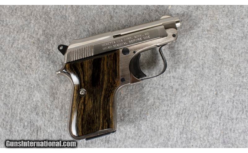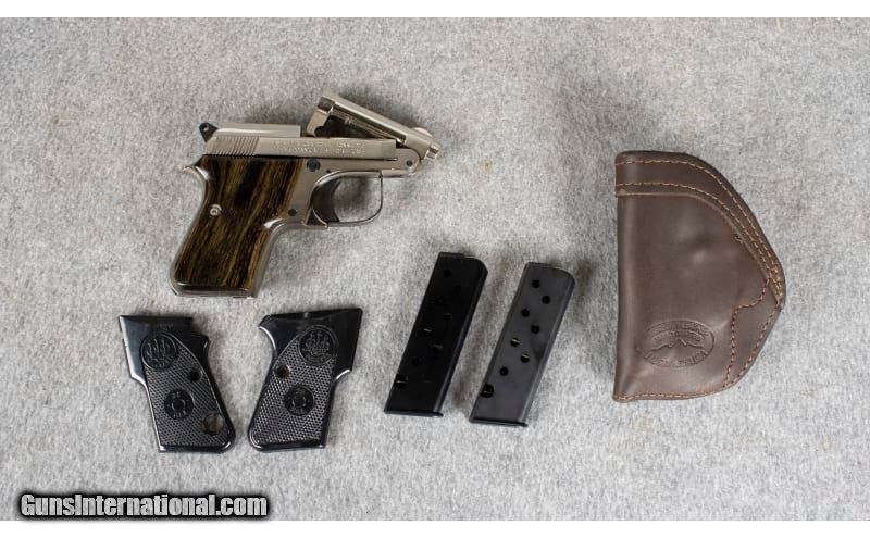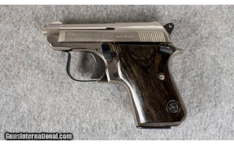 Description: This Beretta 950 BS pistol is chambered in .25 ACP and has a nickel finish. It comes with the aftermarket laminate grips currently on the firearm, the original black plastic grips, a holster and two magazines. .25 ACP SOLD Metal Condition: Excellent Wood Condition: Excellent Bore Condition: Very Good - Excellent Barrels: 2.5 Triggers: DA/SA Butt Pad: Wood Weight: .12 oz. Sights: Integral rear with front blade. Item Location: East Hartford, CT |