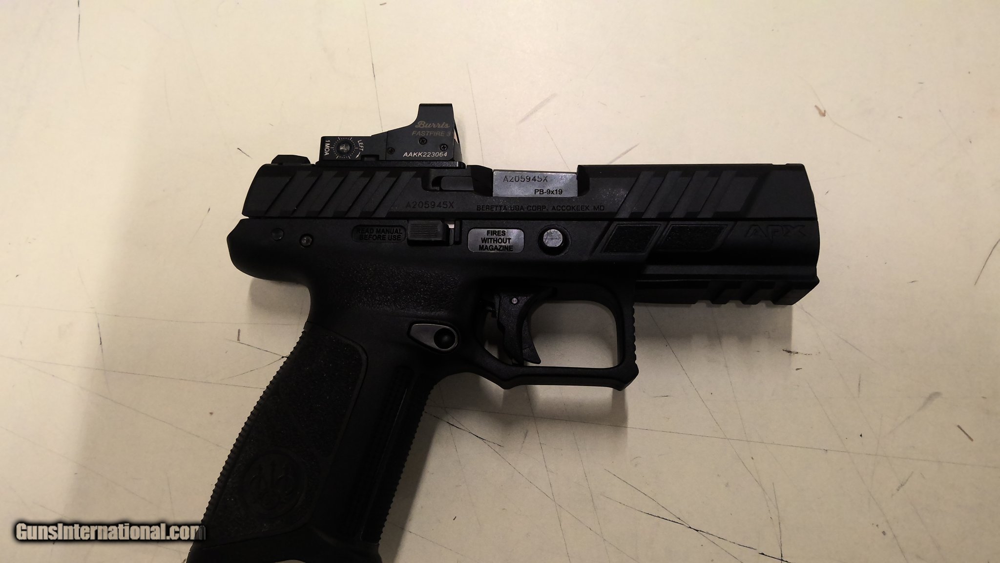 Description: Guns Listing ID: 478353 Excellent condition! Comes with 3 total magazines along with the original case and a Burris Pistol Optic - \"Fastfire 3\ SOLD Manufacturer: BERETTA Model: APX Condition: Used - Non-Certified Barrels: 4.3 Gauge Info: 9MM LUGER (9x19 PARA) Finish: black |