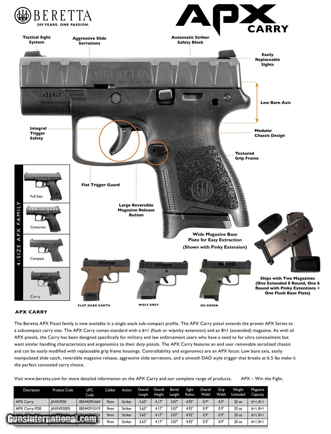 Description: The Beretta APX Carry pistol extends the proven APX Series to a subcompact carry size. Easy to conceal. No matter what clothes you wear or whether you carry inside or outside the waistband, the small design and thin grip make the APX Carry virtually invisible, while still allowing you a firm and instinctive grip when you need to draw it. The APX Carry comes standard with a 6+1 (flush or w/pinky extension) and an 8+1 extended magazine. The APX Carry features an end user removable modular serialized chassis system that allows replacement, reconfiguration and size tailoring. That can be easily modified with replaceable grip frame housings- small, medium and large back straps included. Controllability and ergonomics are an APX focus: Low bore axis- reduces felt recoil, easily manipulated slide catch, reversible magazine release, aggressive slide serrations and a smooth DAO style trigger that breaks at 6.5 lbs make it the perfect concealed carry choice. Ships with two magazines and three baseplate styles for full customization. ***WE OFFER FREE 10 MONTH LAYAWAY WITH ONLY 10% DOWN*** OAKLAND GUN, 189 CR 175, Oakland Arkansas 72661 (870)431-4311 LAYAWAY POLICY 1. 10% down to start layaway. 2. Make another 10% payment every 30 days until the item is paid off. 3.No refunds or returns. 4. No penalty for early pay off. 5. Payments are nonrefundable and nontransferable. 6. No fees or interest. 7. If no payment is made within 60 days, the item and all deposits will be forfeited. ALL ALASKA AND HAWAII SHIPPING BUYER WILL PAY ACTUAL SHIPPING... Inventory: Items are subject to prior sale and are subject to availability at the time payment is received. Photos and Specifications: Many of our photos are provided by the manufacturer and may not necessarily represent the actual item being purchased. Please verify any photo accurately reflects the product described in the title, description, and/or specifications before you order. We do our best, but please notify us via email if you notice any potential conflicts in an image, title, or specification. Please contact us via email with any questions you may have regarding this item. Payment: Personal Check, Visa / MasterCard, Discover, USPS Money Order, Money Order, Certified check. The above prices on this item reflect a 3% cash/check discount. This discount is not valid for credit card purchases. Add 3% to the total cost for credit card purchases. Shipping: Priority Mail with Insurance $30-$40 for handguns depending on cost of insurance. FedEx with insurance $35 for long guns. Additional Terms of Sale, no international shipments. SOLD Manufacturer: Beretta USA Model: APX Carry Caliber Info: 9mm Luger Condition: New In Box Barrels: 3.07 Barrel Type: Low Bore Axis Action: SAO Finish: Wolf Gray Weight: 20oz Sights: 3 Dot Item Location: Oakland, AR |