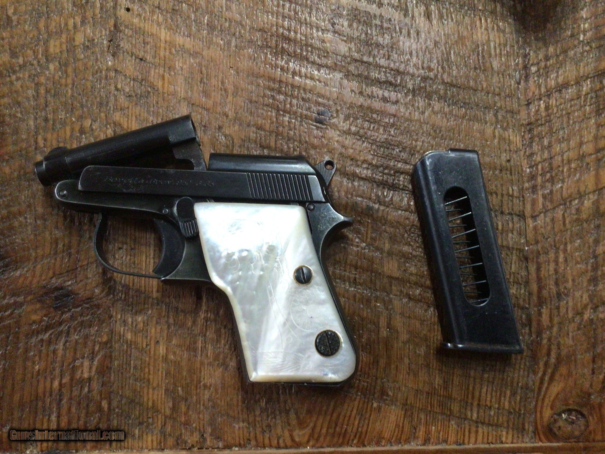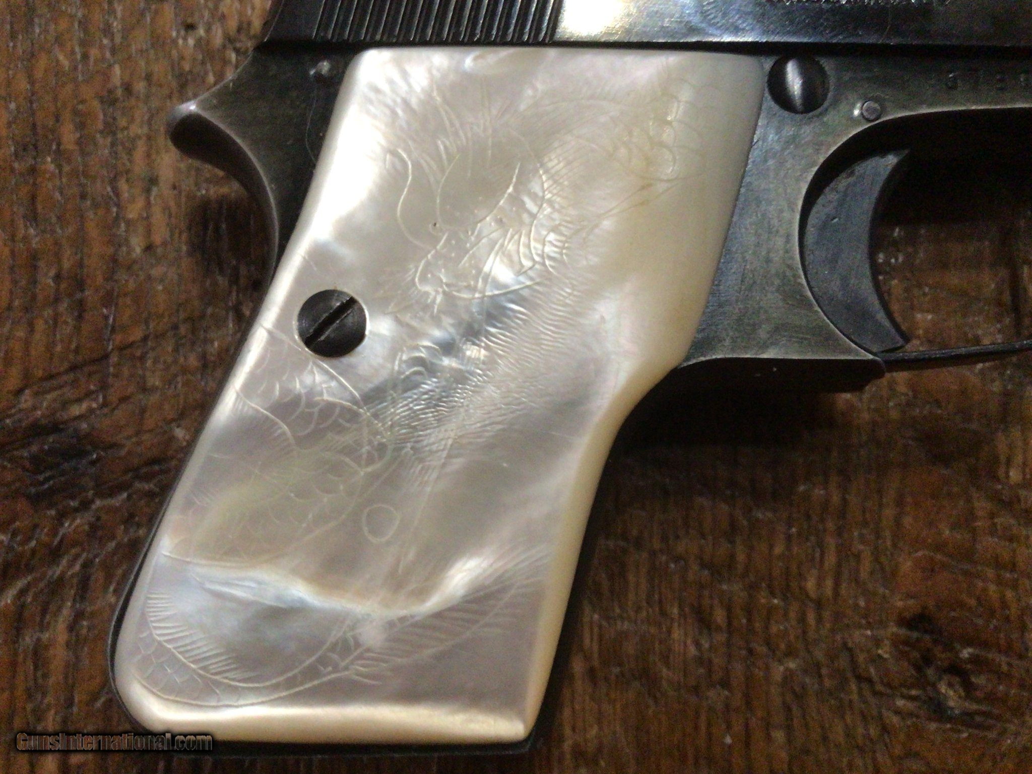 Description: Guns Listing ID: 1352414 Very nice Beretta Brev.950-6.35 semi-auto in 25acp, with engraved Pearl grips, one 8 round mag. SOLD Manufacturer: BERETTA Model: Brev. 950 Caliber Info: .25 ACP Condition: Used - Non-Certified Barrels: 2.5 BARREL Finish: BLACK AND WHITE FLAG |