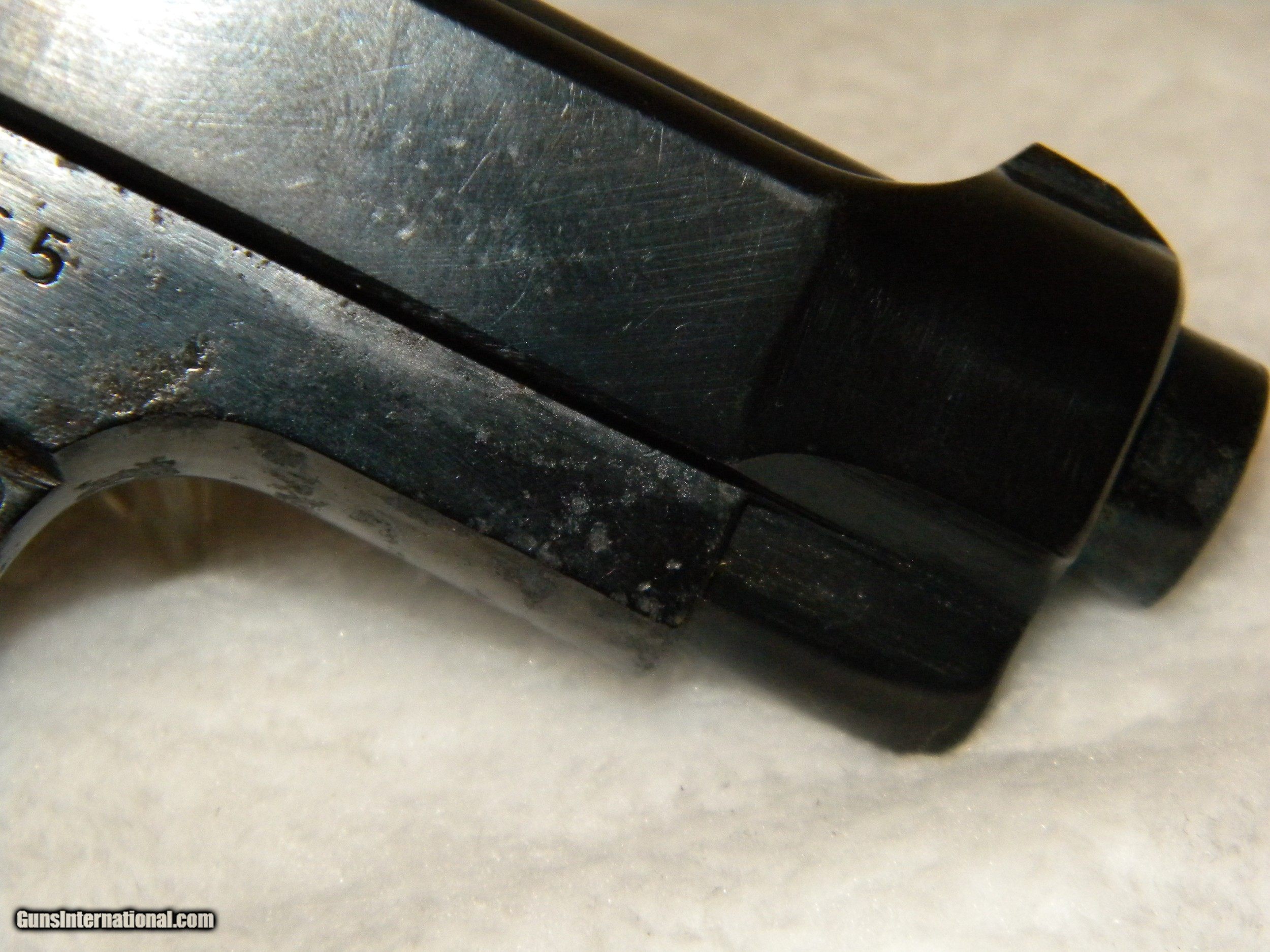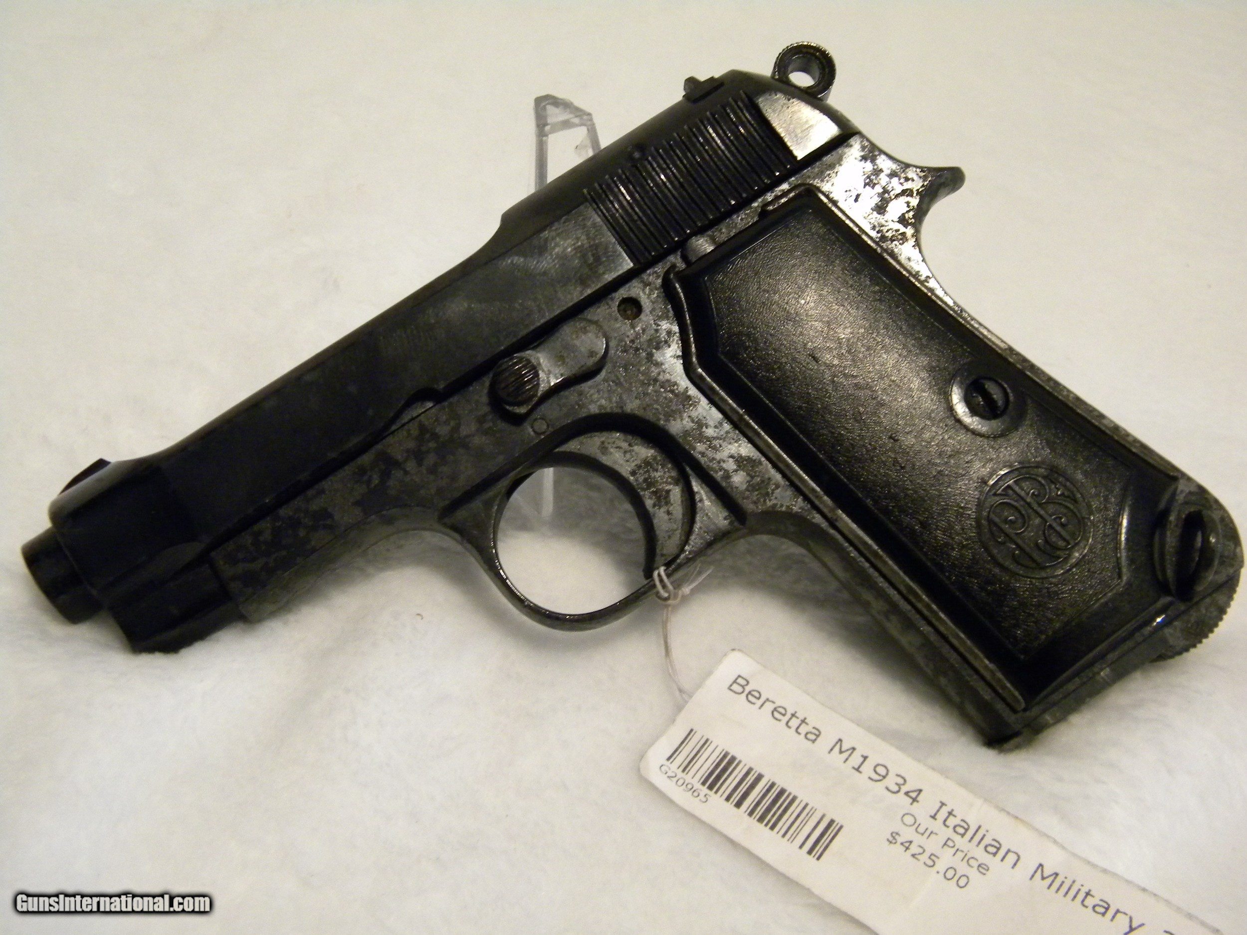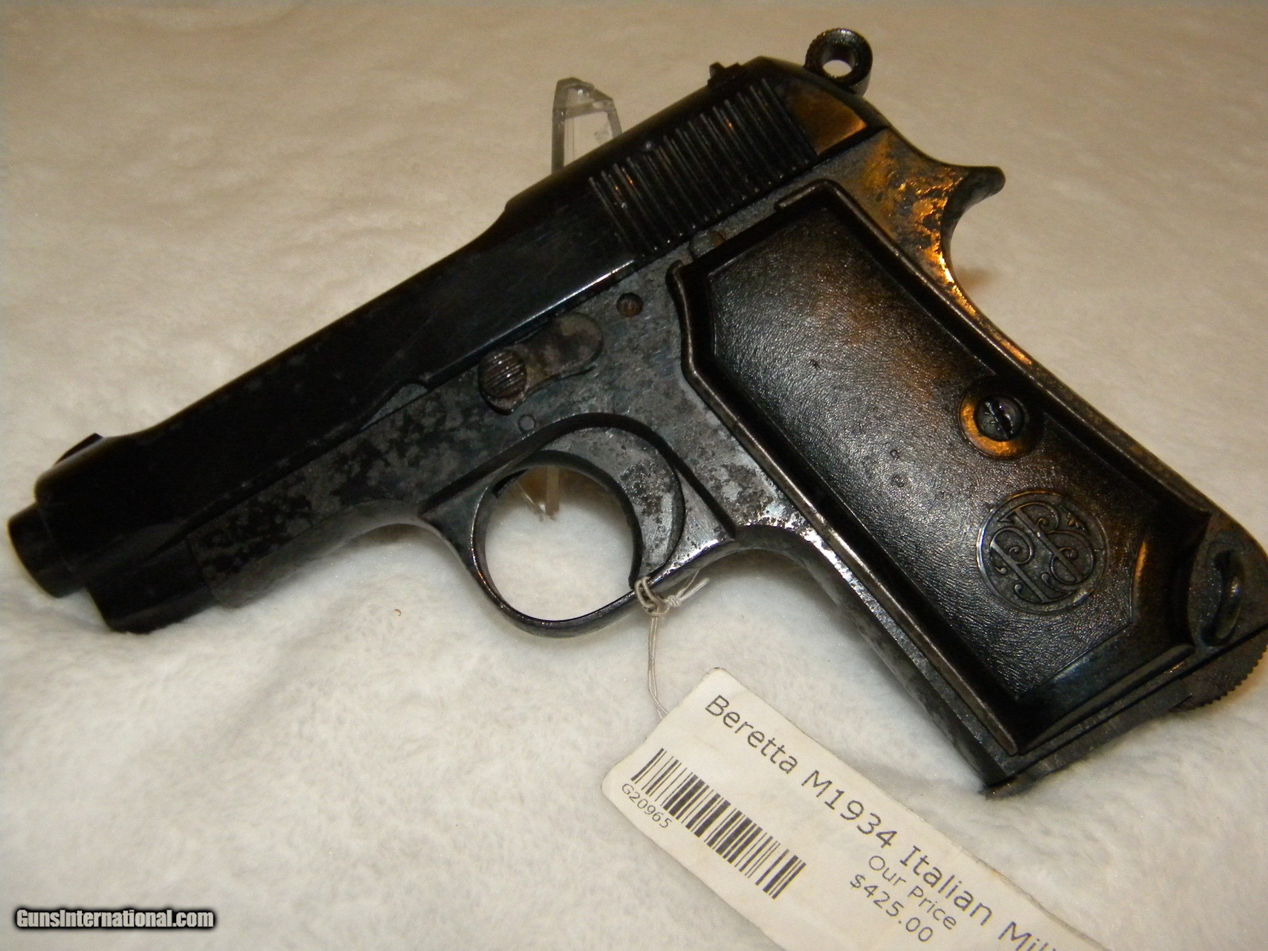 Description: Italian Military Issue Beretta M1934. This firearm was taken from it's owner during war time and has only had one other owner. The grips bear the Beretta insignia, but the gun itself is only serial number stamped. It's overall condition is fair and has been reblued to stabilize metal. There is rust lacing especially on the left side of the frame. Grips are complete and intact, with a lanyard loop. Slide condition is good and clean. This gun was fire tested and functioned well. Bore is 85% clean. SOLD Handgun Caliber: .380 ACP (9x17mm Browning Short) Manufacturer: Beretta Model: M1934 Serial Number: G20965 Condition: fair Metal Condition: fair Wood Condition: plastic good Bore Condition: 85% |