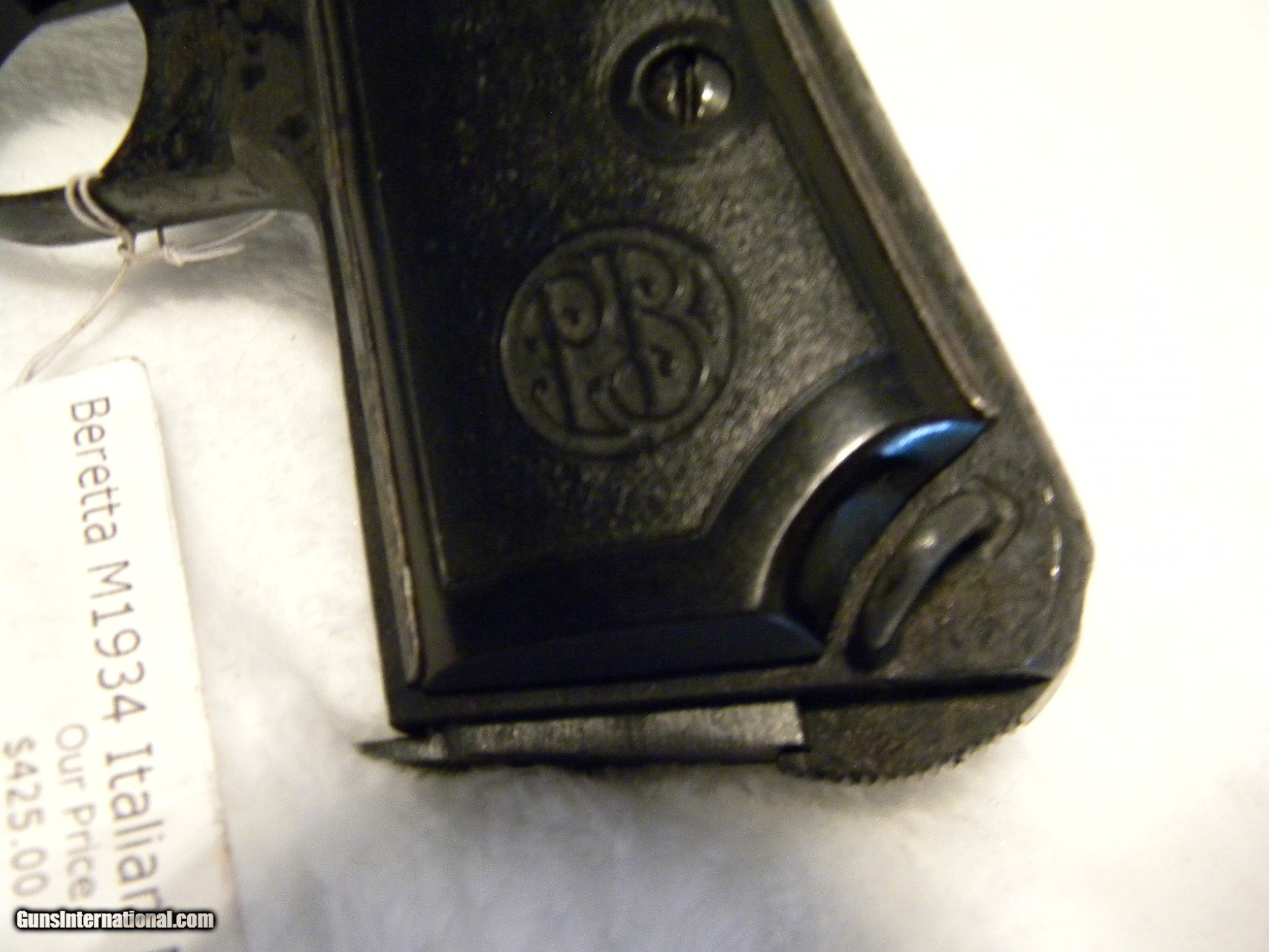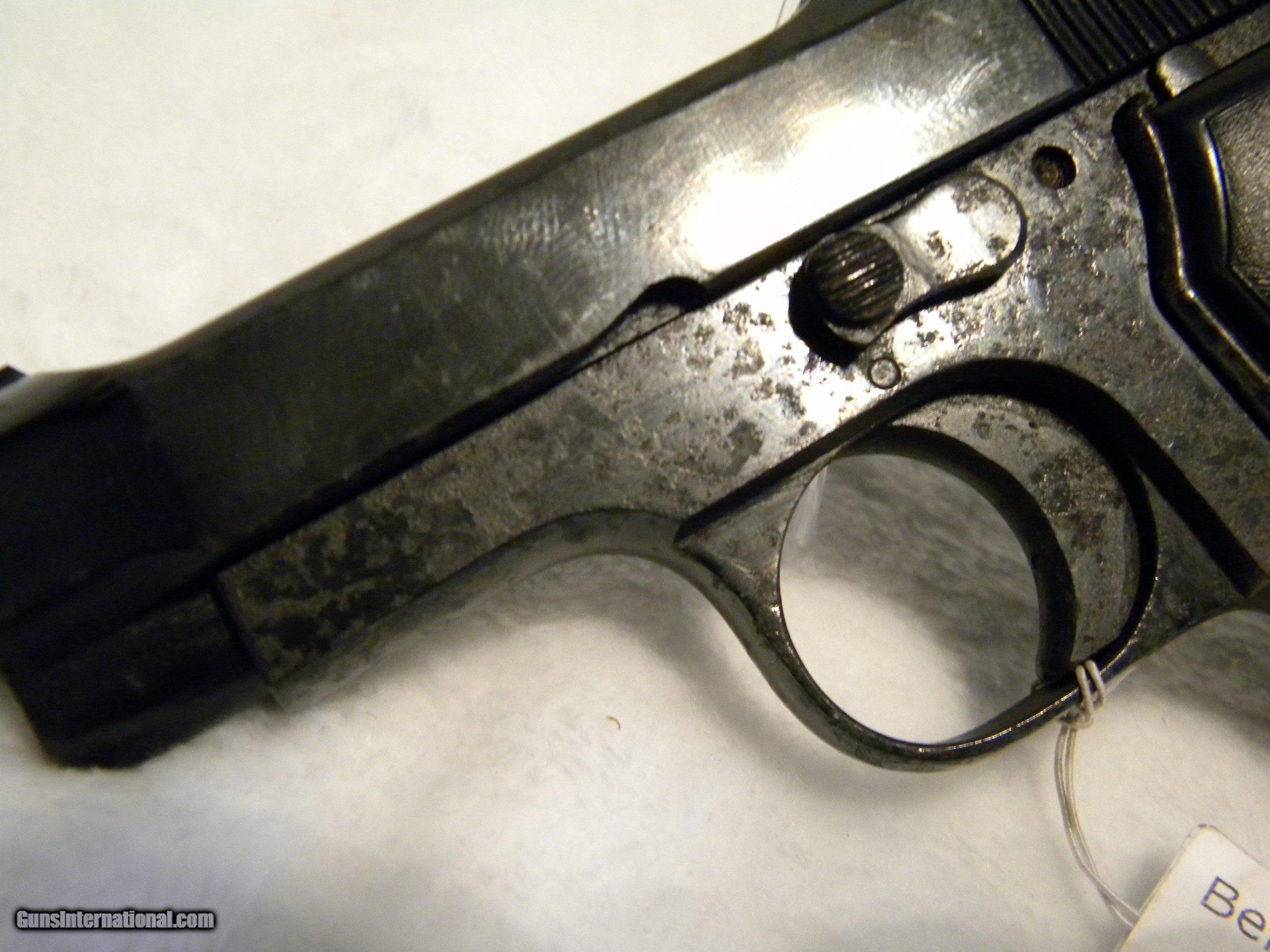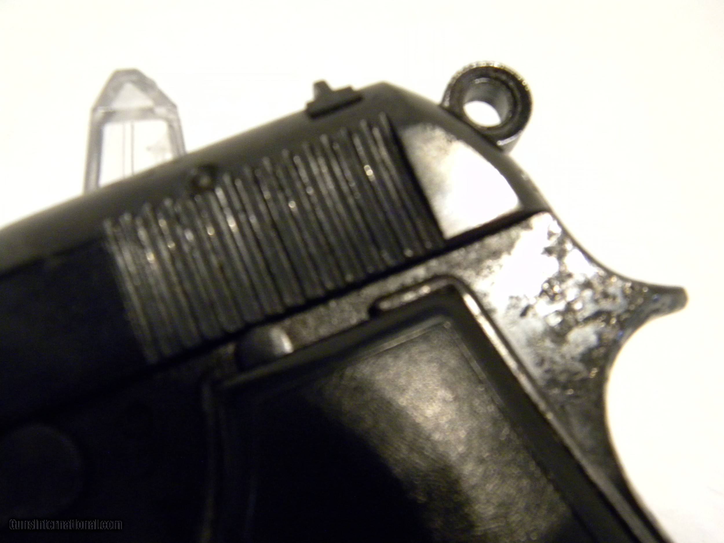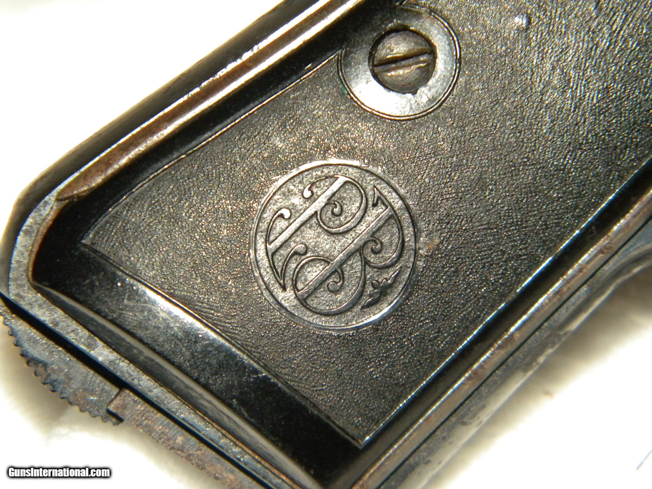 Description: Italian Military Issue Beretta M1934. This firearm was taken from it's owner during war time and has only had one other owner. The grips bear the Beretta insignia, but the gun itself is only serial number stamped. It's overall condition is fair and has been reblued to stabilize metal. There is rust lacing especially on the left side of the frame. Grips are complete and intact, with a lanyard loop. Slide condition is good and clean. This gun was fire tested and functioned well. Bore is 85% clean. SOLD Handgun Caliber: .380 ACP (9x17mm Browning Short) Manufacturer: Beretta Model: M1934 Serial Number: G20965 Condition: fair Metal Condition: fair Wood Condition: plastic good Bore Condition: 85% |