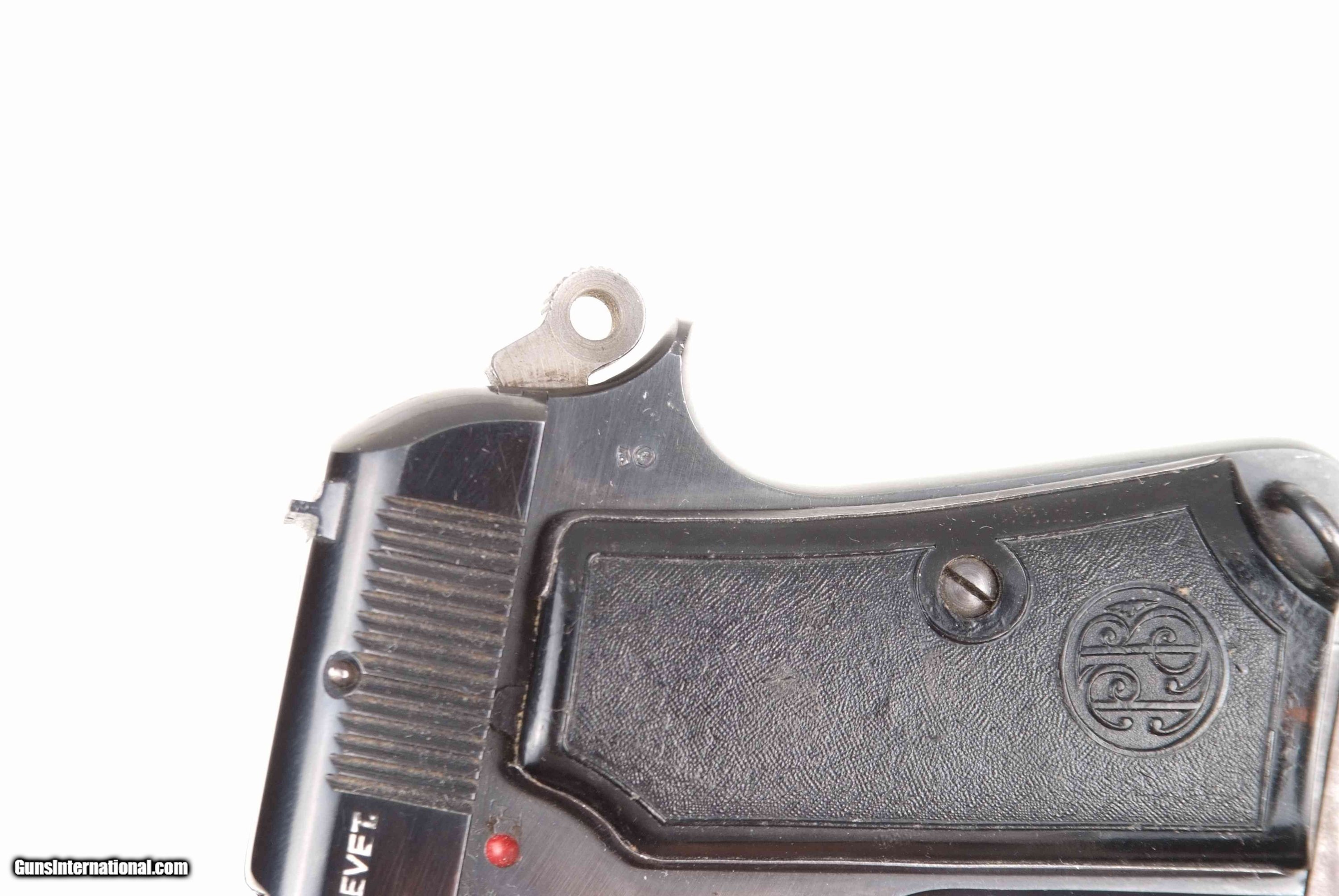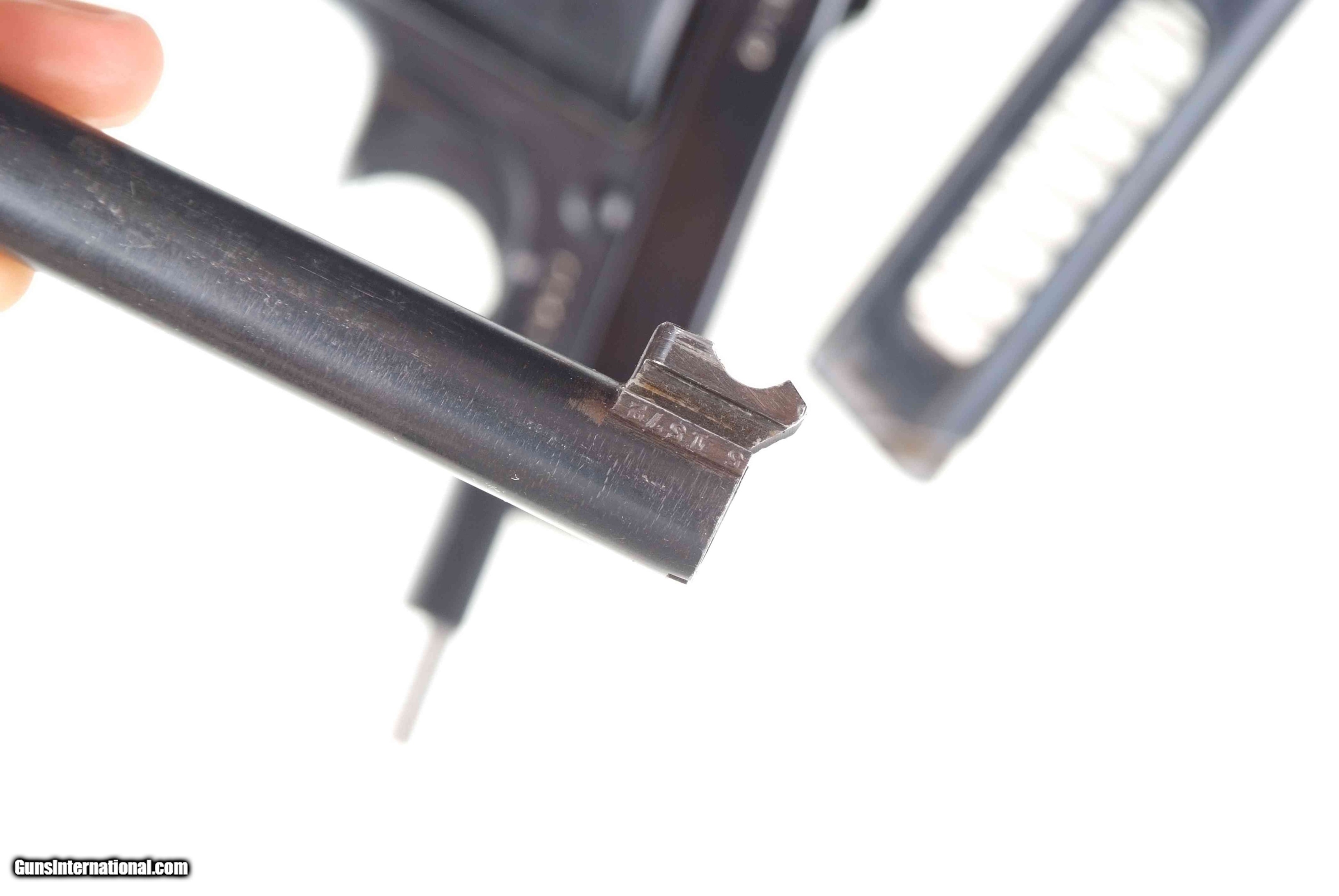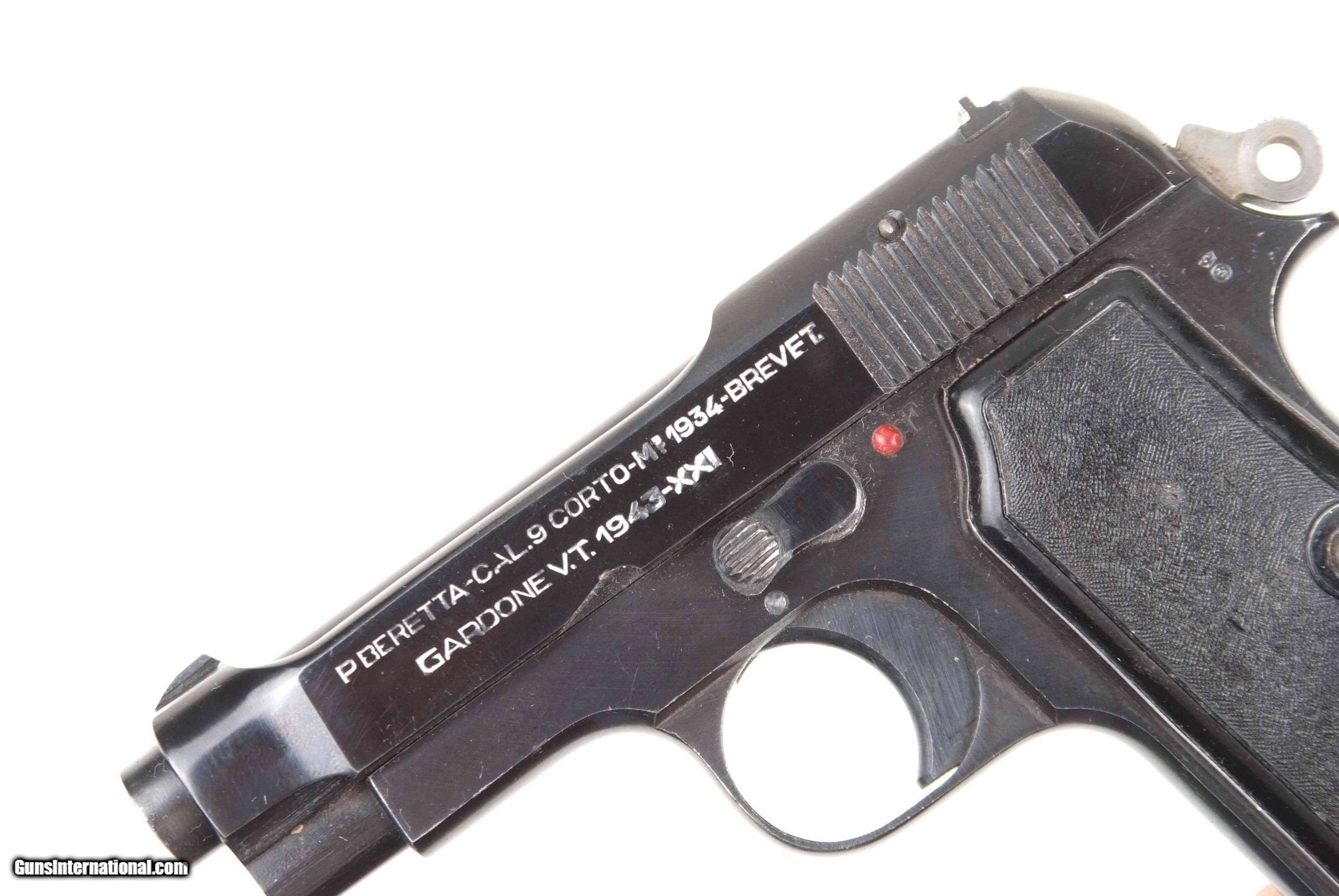 Description: Standard configuration Beretta M1935 with fixed front sight and a drift adjustable rear sight. Marked on the left side of the slide with two line address, all capitals , denoting caliber, model, and year of manufacture in 1943. āSā and red dotted "F" safety detents. Small proof on left tang. Boxed "MA" on right trigger guard web. Full serial number on right side of barrel lug, right slide, and right frame. Standard metal backed plastic grips and blued magazine with finger extension floorplate. Synopsis: Exceptionally nice Beretta M1934, WWII, Italian Military issue. Condition: Nearly 99% bright original high polish salt blue. Just minimul sharp edge wear. Comparable condition grips and nicely slotted, not burred, grip screws. VG magazine with thinning finger extension floorplate. Mirror bright bore with sharp rifling. Perfect manual mechanics. A beautiful mid WWII Beretta M1934, made 1943, that would be difficult to upgrade. ~~Insured shipping fee of $55; most packages shipped using FedEx 2nd Day.~~ SOLD Curio/Relic: Yes Manufacturer: Beretta Serial Number: G51572 Caliber Info: .380 ACP |
