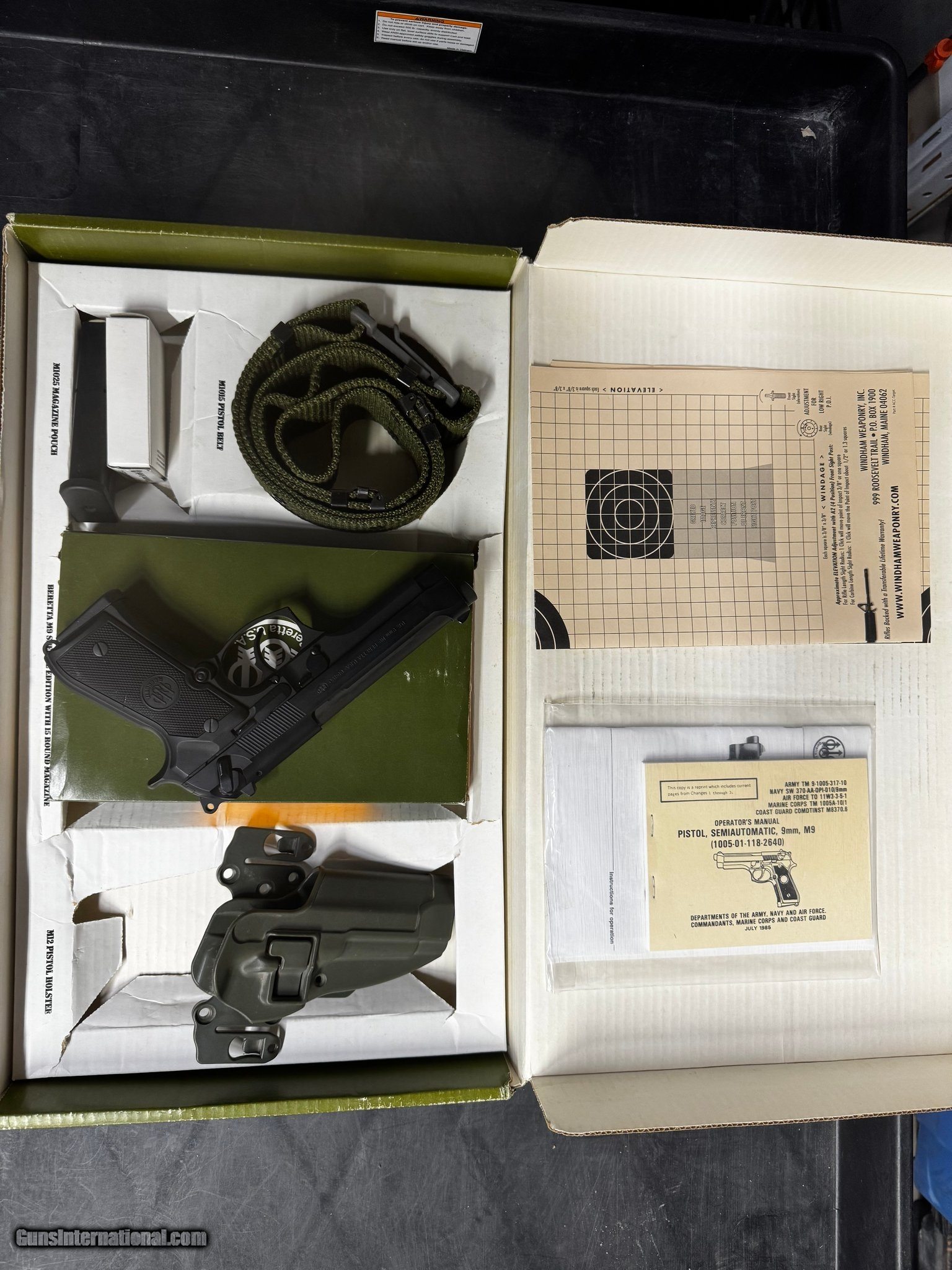 Description: Guns Listing ID: 477129 BERETTA M9 SPECIAL EDITION US MILITARY KIT INCLUDES 2-15RD MAGS NOT THE ORIGINAL M12 BUT IT IS A KYDEX HIP HOLSTER M1015 PISTOL BELT PAPER WORK AND TARGETS WITH THE LIMITED EDITION BOX NO MAG POUCH OVERALL CLEAN GUN WITH SOME NORMAL HANDLING MARKS ONLY 10,000 WERE PRODUCED THIS ONE WOULD BE THE 4629TH ONE. SOLD Manufacturer: BERETTA Model: M9 Condition: Used - Non-Certified Barrels: 5 Gauge Info: 9MM LUGER (9x19 PARA) Finish: black-matte |