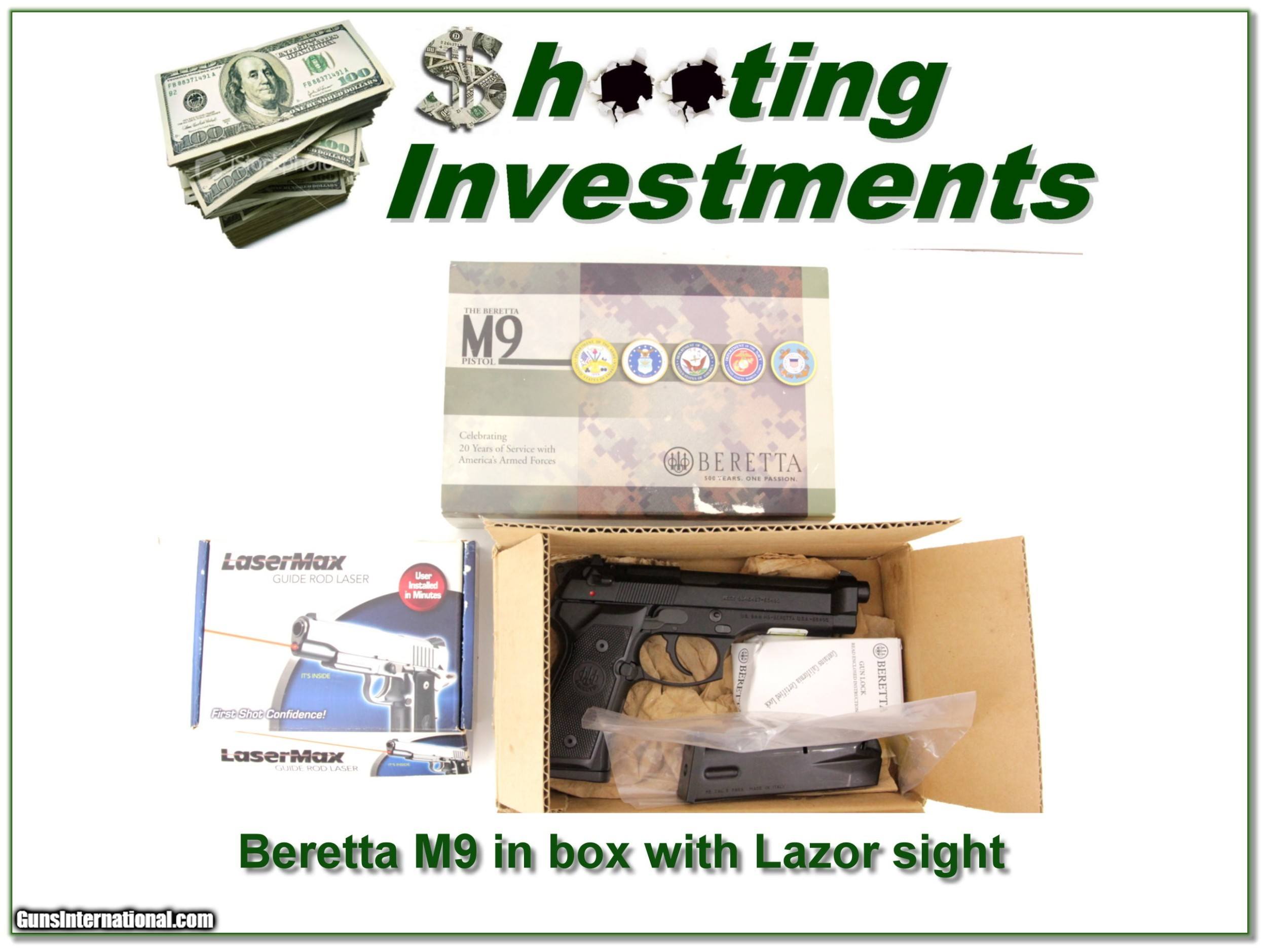 Description: This is a like new Beretta M9 9mm with LazorMax laser site. It comes as seen with 2 magazines in box. I am selling this one on consignment and as such lay-a-way can’t be used. It does of course have the standard 3-day inspection. Shipping with insurance is $39. Please email me with any questions or larger pictures. (Consign your quality firearms with Shooting Investments for only 12%! Let me know if you have any you would like to sell!) 19-0813 Payment: Payment is by Money Order, Cashiers Check or Personal Check. I can now also accept MasterCard and Visa with a 3% convenience fee. PayPal can be used for some items but never firearms. Please let us know if you would like to pay via PayPal. Shipping: The shipping charge will be listed in each description. It is $39 for most long guns and $29 for most handguns. Some heavy guns or those insured for over $2000 will be higher. Shipments to Alaska and Hawaii are higher because air shipment is required. Most firearms are shipped on Tuesday and Thursday and usually in 5 days of receipt of payment. We package all shipments carefully and insure them. For long guns you can purchase a new Plano case for $19. They now cost us $22 when buying 100 at a time. Optics are shipped Priority Mail and most other non-firearm shipments are shipped First Class. Returns: Our return policy is simple. If for any reason you are not pleased with your purchase, you may return your item for a full refund of purchase price. Ammunition cannot be returned. It is important to us that you are happy. Guns cannot be fired or dissembled before returning them and they must be returned in the same condition as received. Notification of a return must occur with-in 3 days of receipt at your dealer. Shipping, convenience and dealer fees are not refundable and are the responsibility of the buyer. Lay-a-way: If needed, we offer a 60 day lay-a-way option on most firearms. It is 1/3 now, 1/3 in 30 days and 1/3 in 60 days. Lay-a-way firearm sales are final and if not completed the first payment cannot be returned. Consigning your firearms with Shooting Investments: We will help you get top dollar for your firearms. While most local guns shops charge 20% or more, our fee is only 12% with a minimum of $75. At your local gun shop it might take months to sell. Selling on-line provides instant access to thousands of interested buyers. You won’t find any other on-line dealer willing to sell your firearms for only 12% or listing every gun on 3 separate s. Selling through an House typically costs the seller 15% and the buyer an addition 15% (so 30%) and you have to wait several months to sell and longer to receive funds. If properly priced, we will sell your firearms in a few weeks. Send us an email or give us a call and we’ll explain how easy it is for you to get top dollar. Trading: Trading for use is really just buying your gun to re-sell. If you have a gun you want to trade, please email a picture and we will let you know what we can give or it. You will always get more if we sell it for you on consignment. Help for California Buyers: We are happy to ship to California. It is the buyer’s responsibility to make sure any item you buy is legal in your state. We are also happy to help with your purchase of a firearm from someone other than us. If you see a gun you would like to buy but the seller can’t or won’t ship to California they can ship to use and we’ll then ship it to your California dealer. The cost for this service is only $30 + shipping. Let us know if we can help! SOLD |