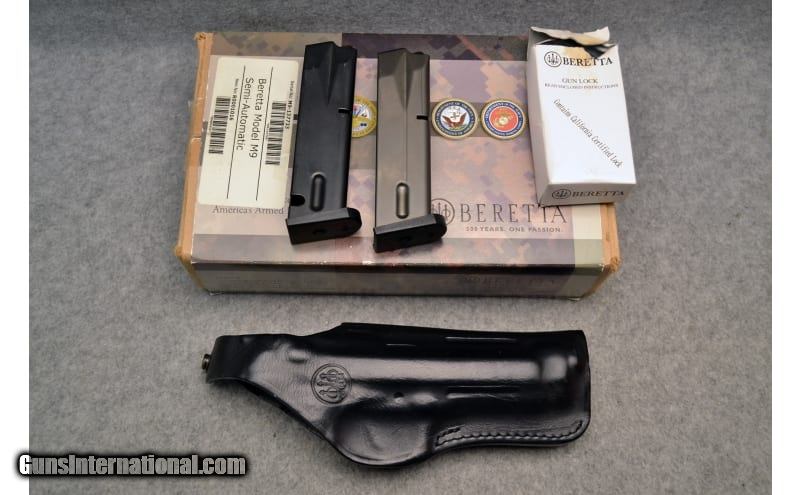 Description: The Beretta® M9 has been the standard sidearm for the US Military since the 1980s, making it one of the most extensively tested and duty proven Semi-Auto Pistol designs in existence. The M9 utilizes a short recoil, delayed blowback system to cycle the action flawlessly. Built on an extremely strong, lightweight, forged aircraft-quality aluminum alloy frame, this semi-automatic pistol features an open top slide that virtually eliminates jamming and stove piping. A chrome-lined barrel provides extreme corrosion resistance and ease of cleaning, while the deeply recessed combat muzzle crown protects the rifling. The spring-loaded, ambidextrous safety lever doubles as a decocking lever. A Bruniton™ non-reflective black coating provides superior corrosion and wear resistance. The Beretta M9 Semi-Auto Pistol is a perfect choice for home defense, field carry, law enforcement, and target practice. Includes factory box, two magazines, and a holster. 9mm Luger SOLD Barrels: 5 Weight: 2 lb Item Location: christiana |