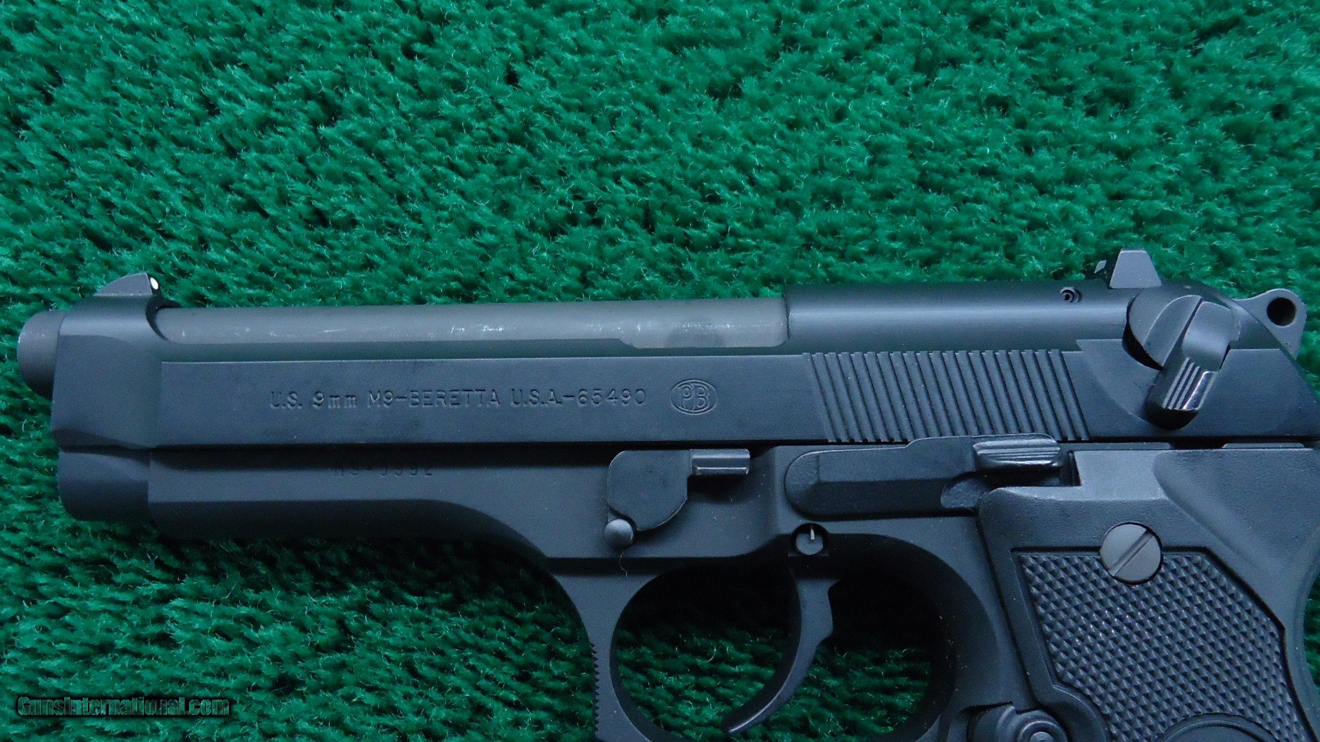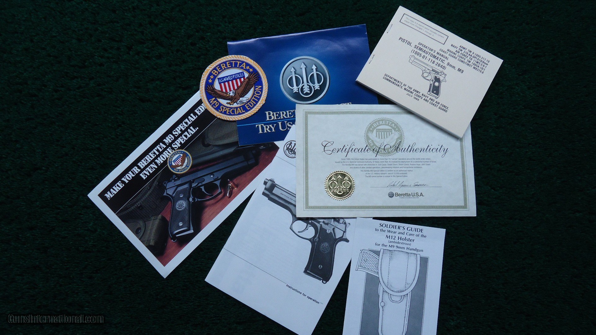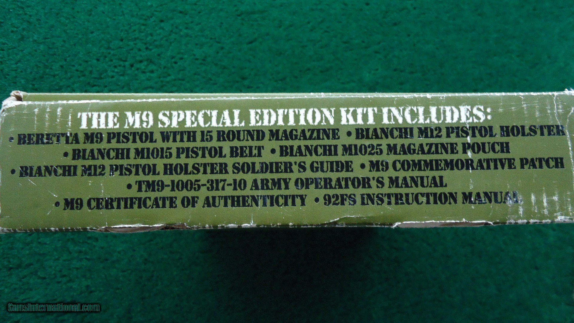 Description: Beretta M9 Special Edition Semi-Automatic Pistol with Box and Accessories. Introduced in 1995 to commemorate the 10th anniversary of the U.S. military official sidearm. Production was limited to 10,000 and special serial numbers were issued. The left side of the slide and right side of the frame are marked "U.S. 9mm M9-BERETTA U.S.A.- 65490". It features white dot fixed sights, squared trigger guard, ambidextrous safety, reversible magazine release, lanyard ring and checkered black plastic grips. Complete with factory set box and factory box numbered to gun. Also included in the set are; an instruction booklet , a copy of the M9 operators manual from July 1985, a special edition patch, certificate of authenticity, a Bianchi M12 holster, 2-magazine pouch and pistolbelt in matching green. This gun is brand new and in the original box. Leroy Merz Antique Firearms specializes in antique and vintage Winchesters and other fine American firearms. Since 1965 Mr. Merz has taken part in the world of firearms and has been a contributor to many well known reference books. We have hundreds of additional guns in every price range at our home online. Search for Merz Antiques in google. SOLD Curio/Relic: Yes |