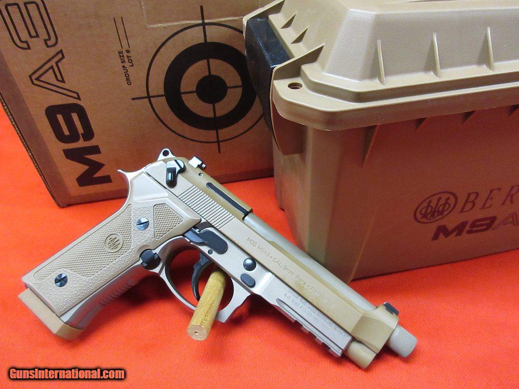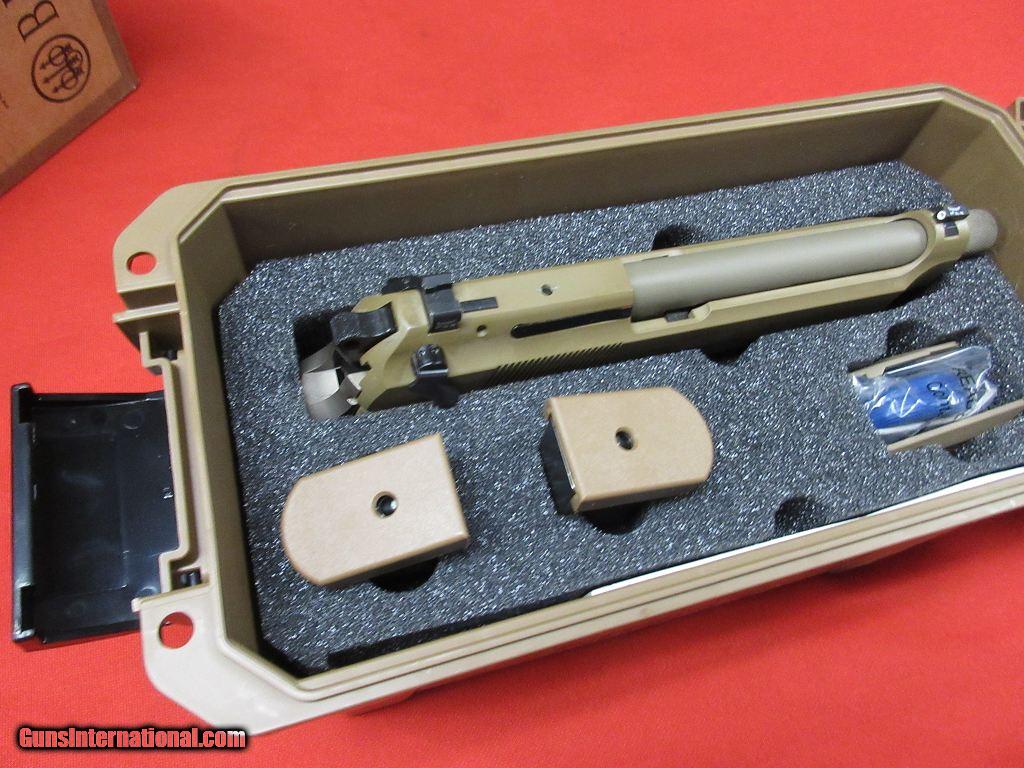 Description: Beretta M9A3 9mm 5.2" FDE Cerakote (NEW)-- This is the newly redesigned pistol in the M9 series. The M9A3 has a Flat Dark Earth Cerakote finish, brigadier frame, picatinny rail, threaded for a surpressor with a protector, three-dot Trijicon night sights, thin grip profile with an extra larger rubber wrap around grip included, checkered front and back-strap, steel trigger, safety decocker, over-sized mag release button, comes with 3-17 round magazines and an ammo box carry case. SOLD |