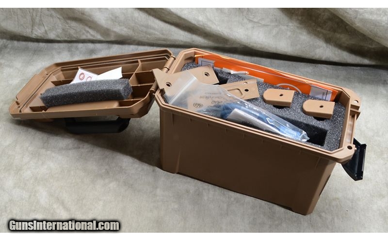 Description: This tactical field kit includes the pistol, ammo box storage, three magazines and extra grips. The pistol itself features threaded muzzle, double action trigger, ambidextrous safety, and night sights. 9mm Luger SOLD Chambers: 17+1 capacity Metal Condition: LNIB. Wood Condition: LNIB. Bore Condition: LNIB. Barrels: 5-1/4 inch with threaded muzzle. Triggers: Factory single/double action trigger. Fore End: Under barrel accessory rail. Butt Pad: Textured rubber wrap-around grip. Thin grip panels provided. Weight: 34 oz. Sights: Three-dot night sights. Item Location: Rogers |