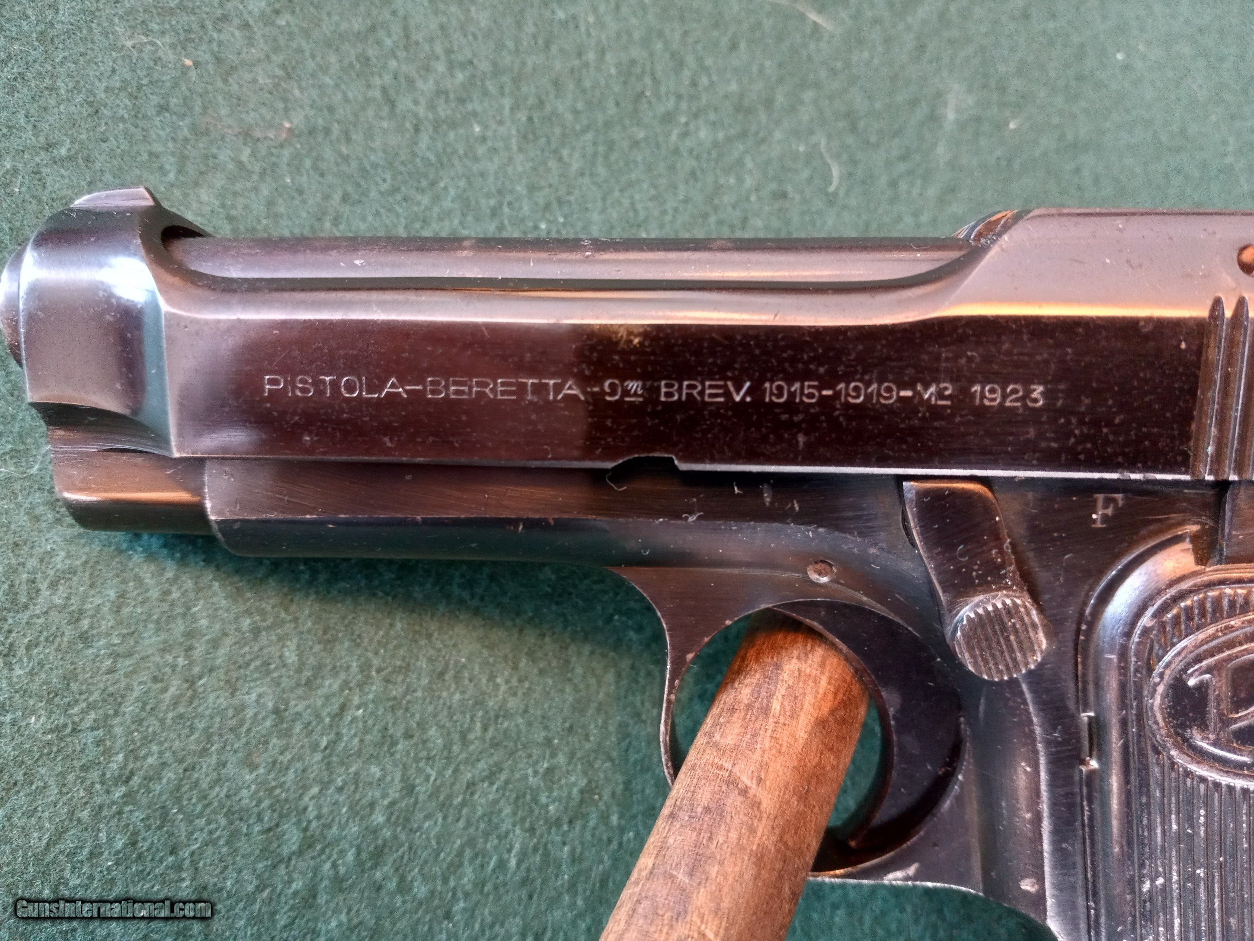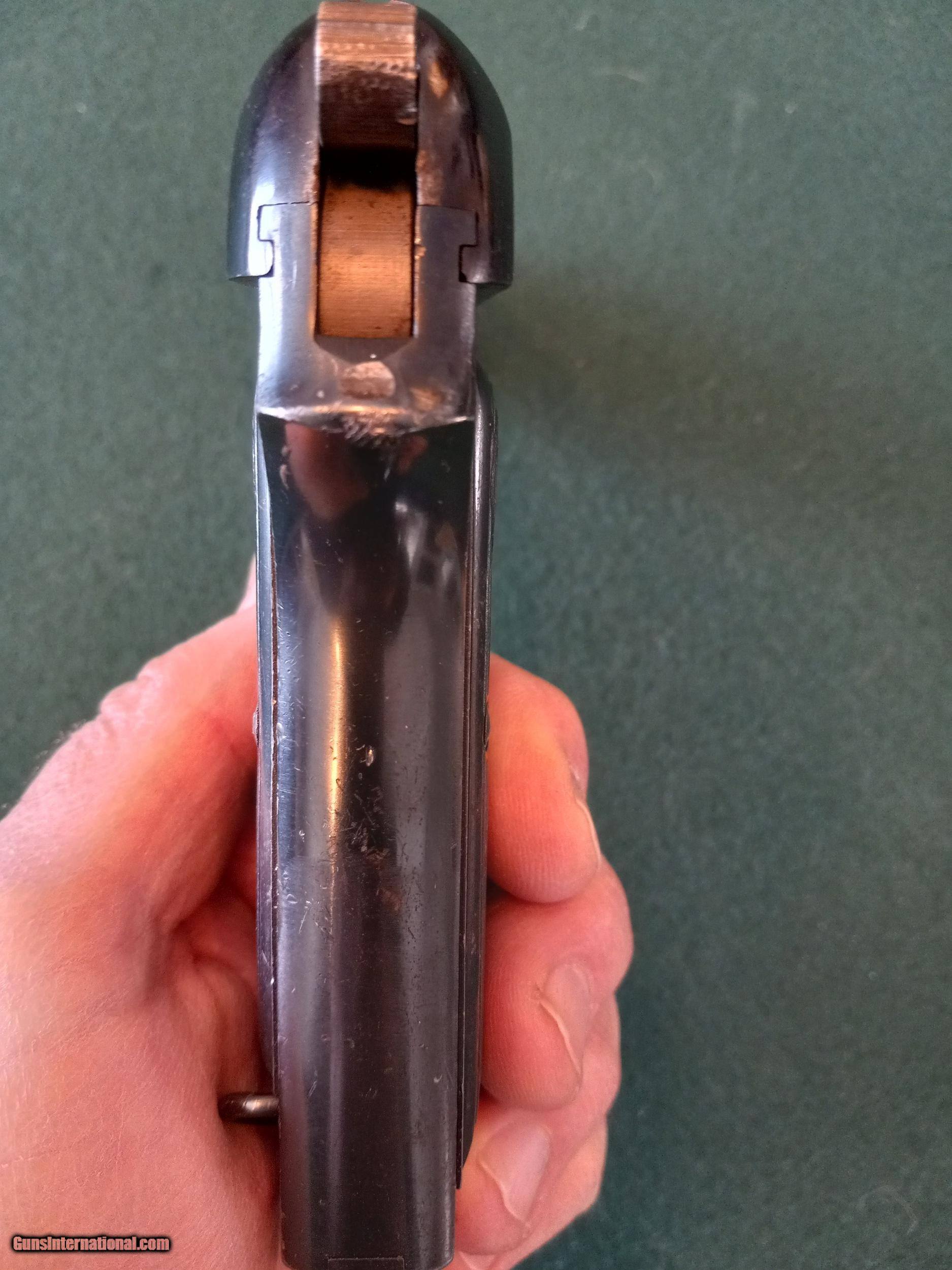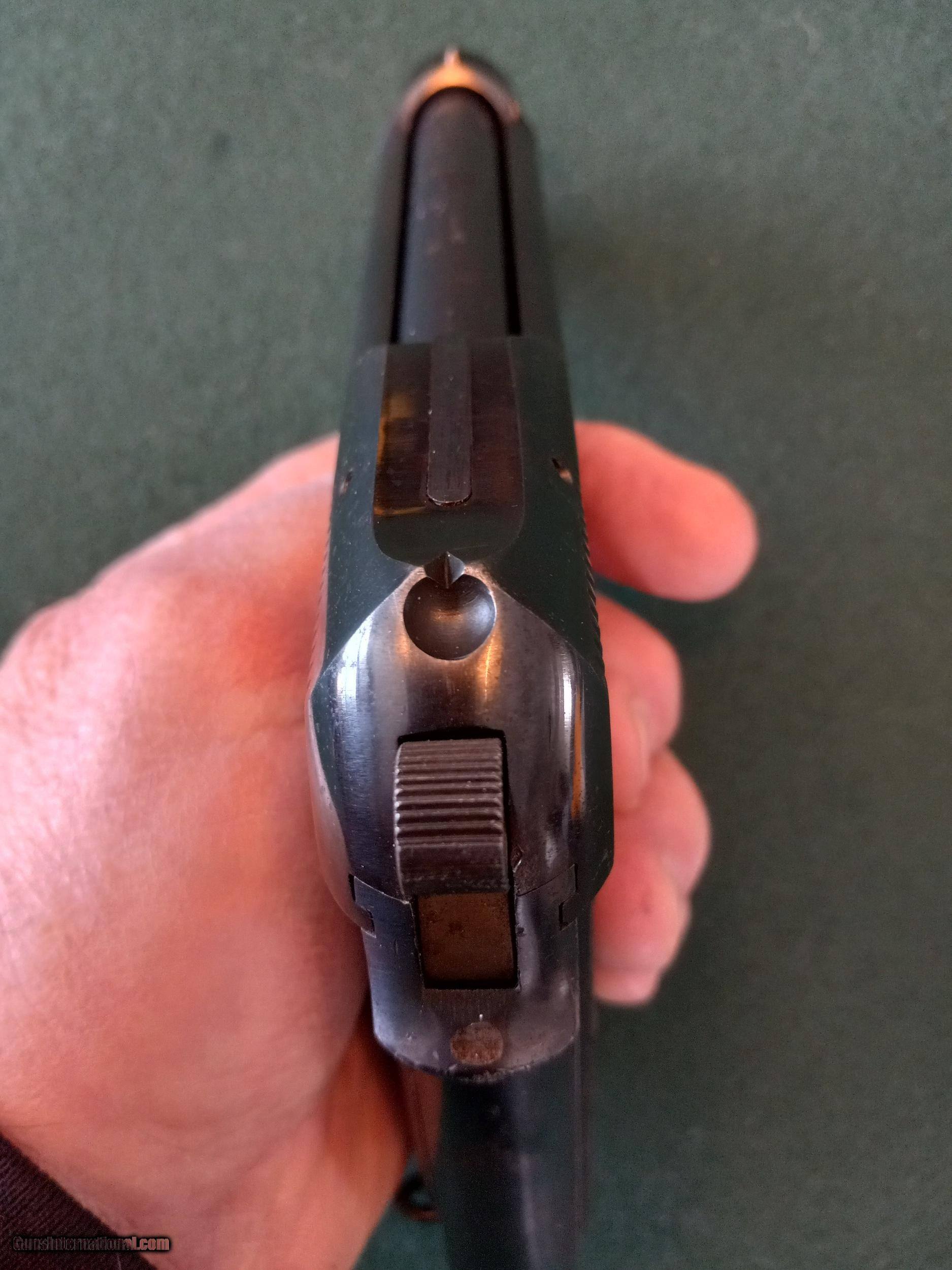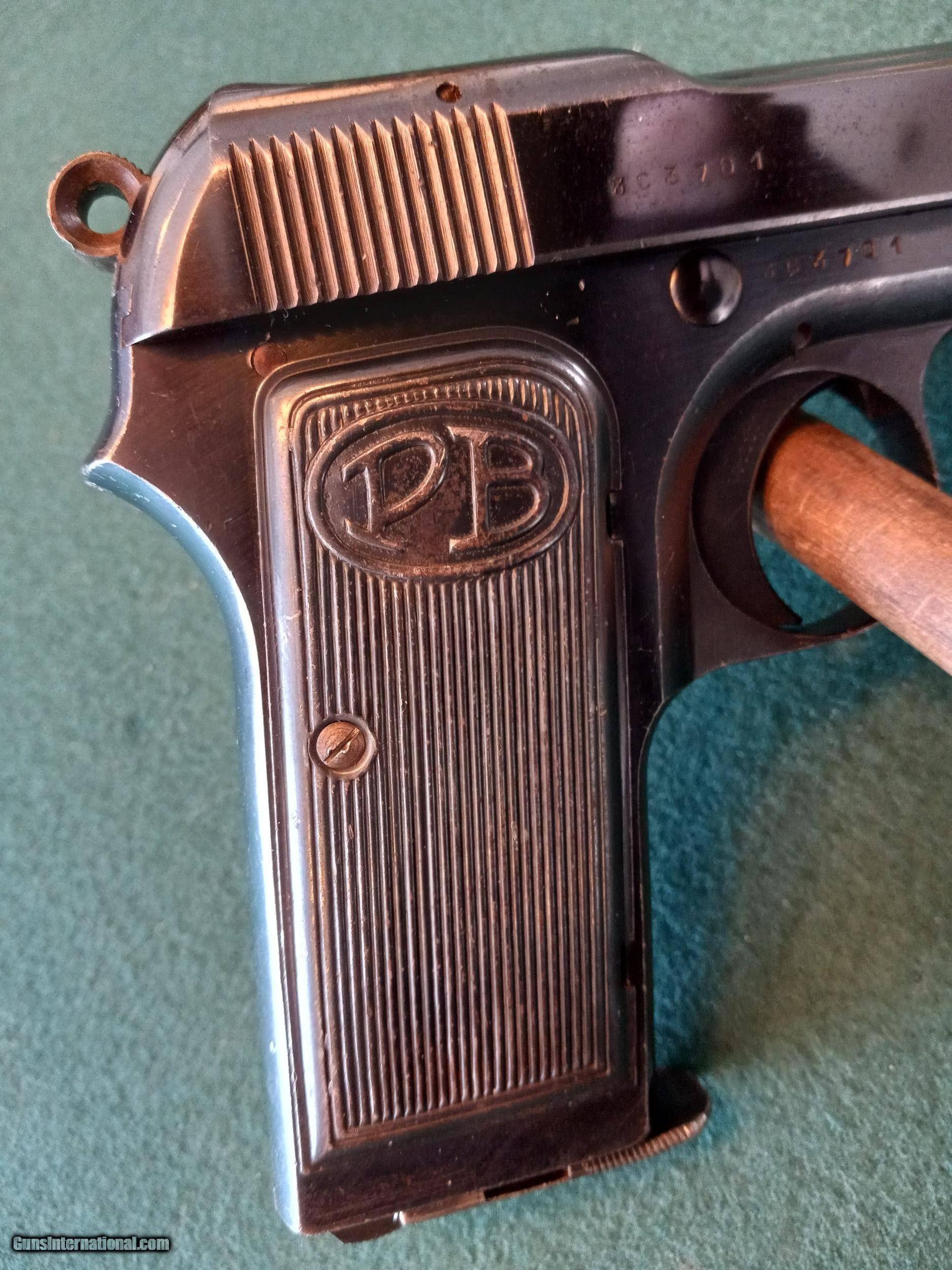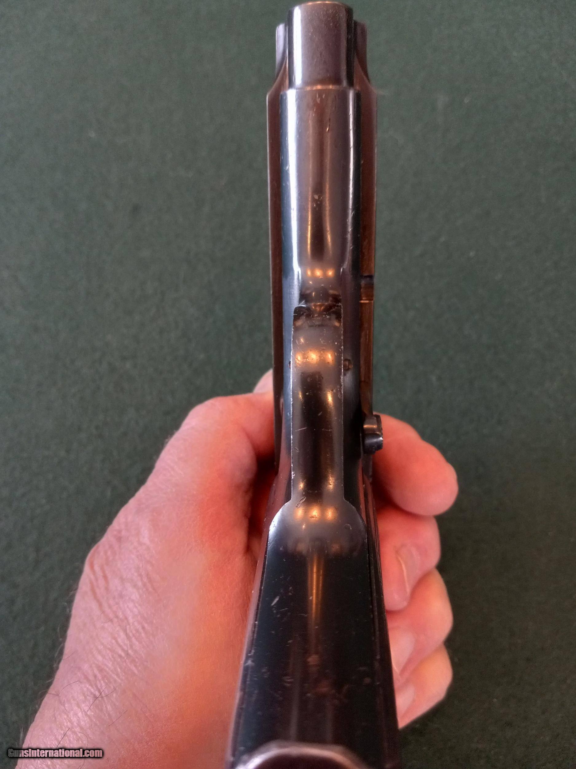 Description: Beretta. Model 1923. SOLD (NAVY) Semi auto pistol. "Rare" with the "R" Navy Anchor M" in circle stamped on the left side. Cal 9mm. 4" barrel with excellent bore. Manufactured 1923 to 1926. Metal surface retains 90% original blue finish. Matching numbers. The original metal PB logo grips are in very good condition and comes with the correct flat bottom magazine. Collectors grade condition. Serial # 3C3701. SOLD Manufacturer: Beretta Model: 1923 Serial Number: 3C3701 Condition: Fine Bore Condition: excellent Manufacture Date: 1923-1926 |
