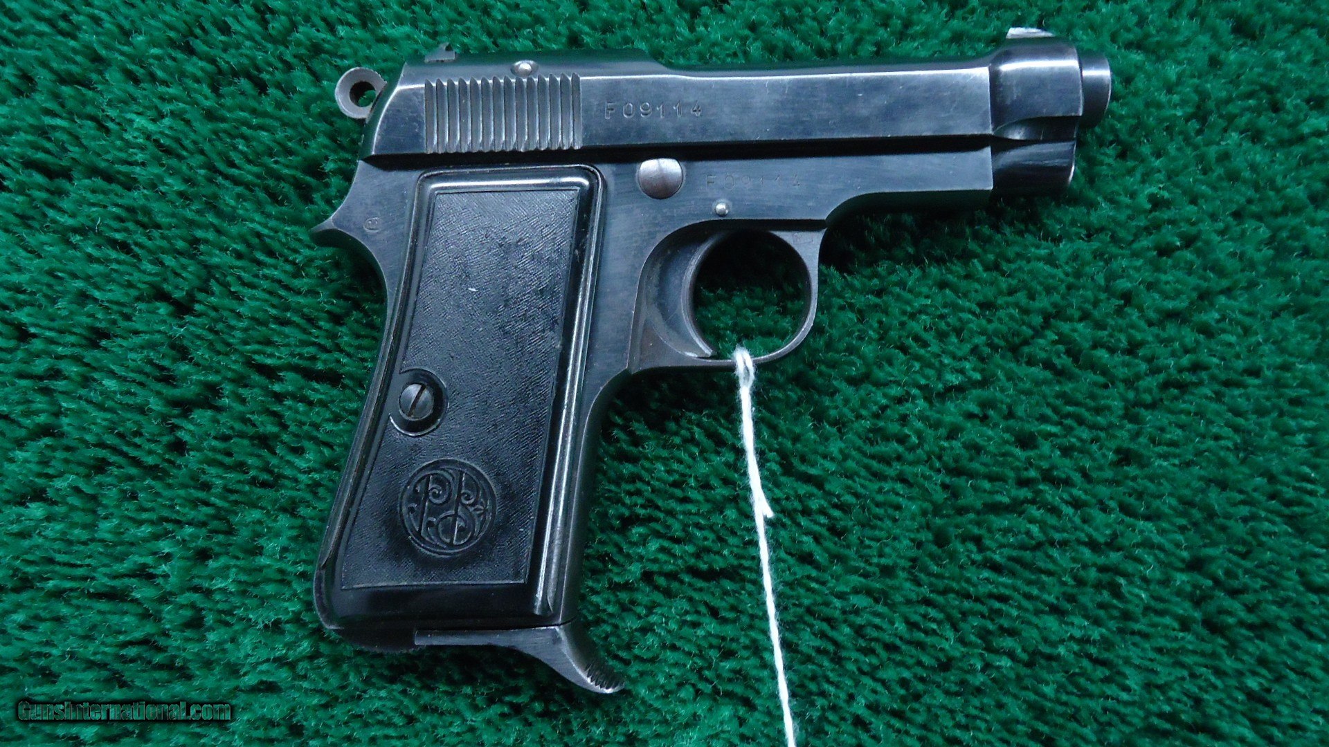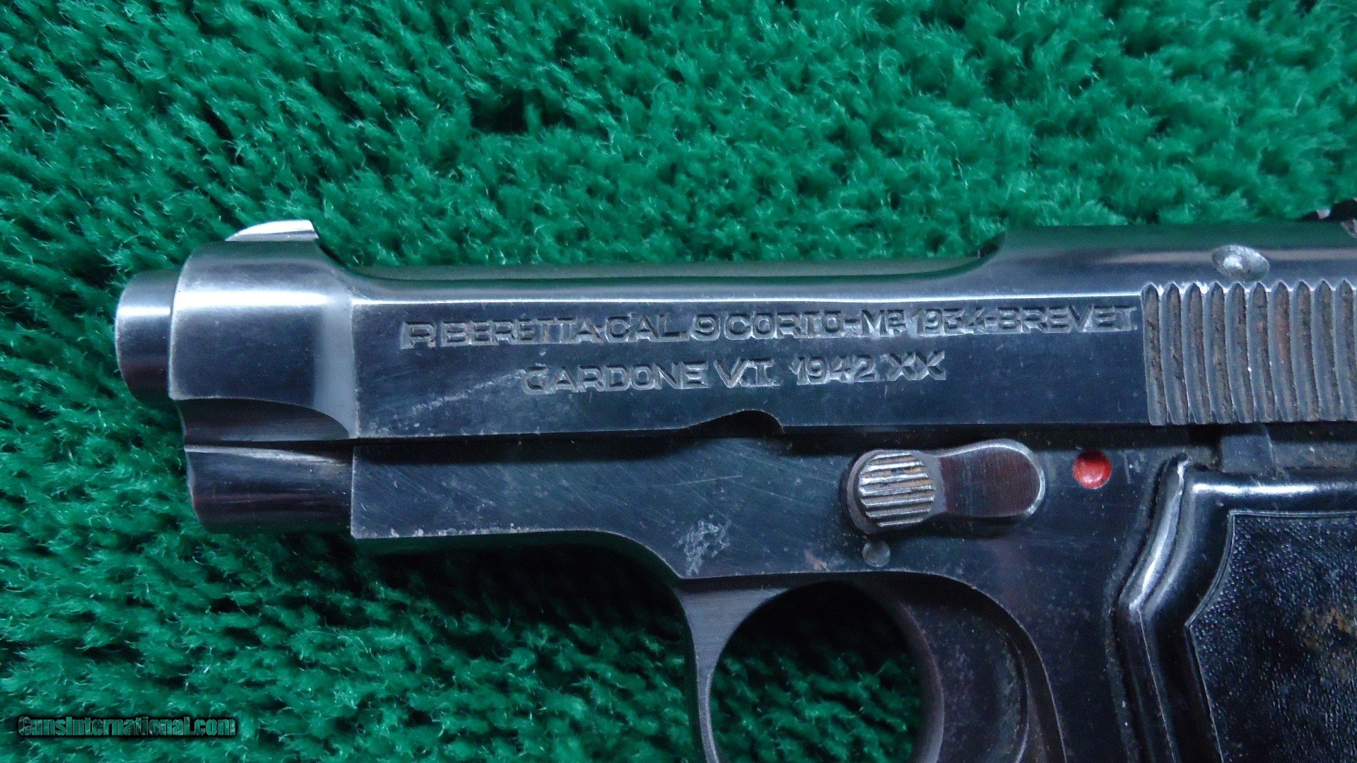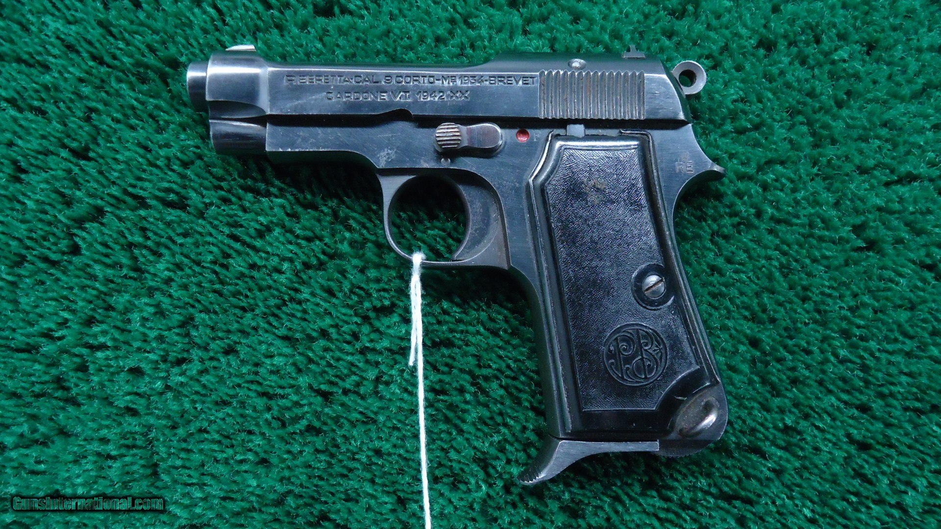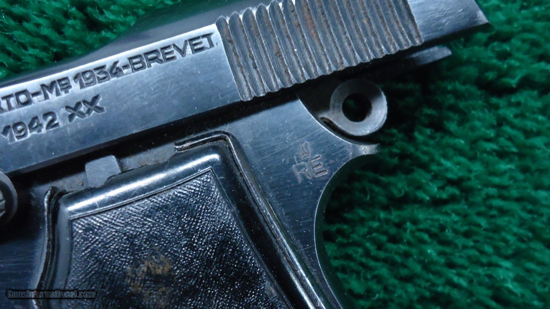 Description: 3-3/8 inch barrel chambered in 380 ACP caliber. Fixed sights. Blued frame with plastic grips. The Beretta Model 1934 is a compact combat handgun that first saw service with the Italian Military in 1934. It was Italy's service weapon in WWII. The left side of the pistol is "RE" stamped for the Italian army. Lots of markings. “PO” by lanyard loop, boxed “M” on right front of trigger guard, “X” on left side of butt near rear & “IVU” in oval at top right rear of frame. Matching numbered slide. “PB” logo hard rubber metal backed grips.Left grip has a small chip out of the top under the slide. Most all of the original blue remains. Excellent bore and action. Made in 1942 as marked on slide plus “XX”. One 7 round magazine. Leroy Merz Antique Firearms specializes in antique and vintage Winchesters and other fine American firearms. Since 1965 Mr. Merz has taken part in the world of firearms and has been a contributor to many well known reference books. We have hundreds of additional guns in every price range at our home online. Search for Merz Antiques in google. SOLD Curio/Relic: Yes Handgun Caliber: .380 ACP (9x17mm Browning Short) |