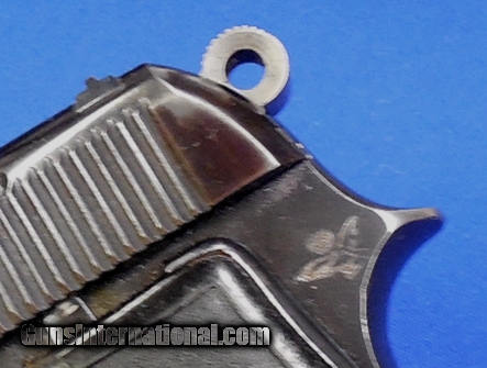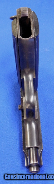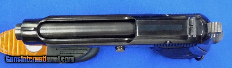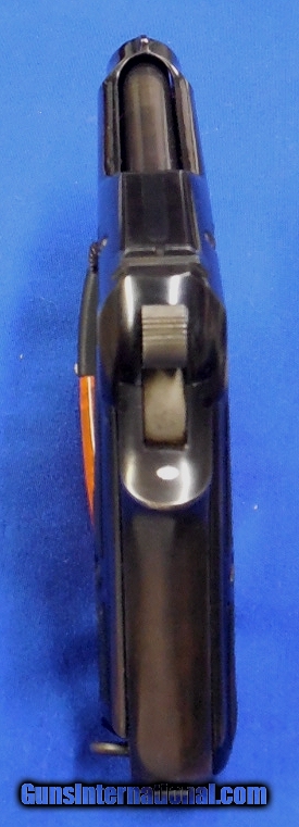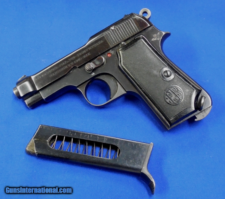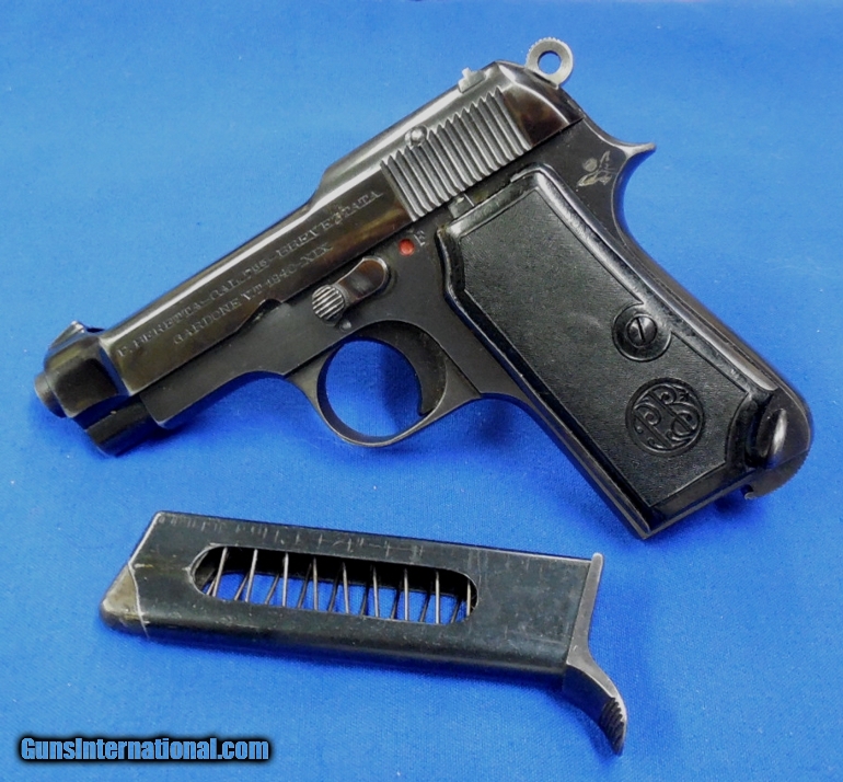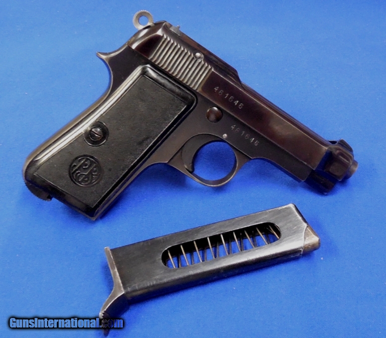 Description: Beretta Model 1934 "Air Force" Semi Auto Pistol. Scarce Gun, serial # 461646 matching, cal. 32, has a 3 1/2" barrel with a very good bright bore and strong rifling. The metal surfaces retaining 90%+ original blue finish. The left side of the slide has the Beretta logo that’s 1940 dated and the Air Force Eagle is stamped on tang making this a scarce gun. Black plastic PB logo grips. Pistol comes with its original magazine. The overall condition as described is very good - very good plus. Inv.: # 1-1292 SOLD Curio/Relic: Yes |