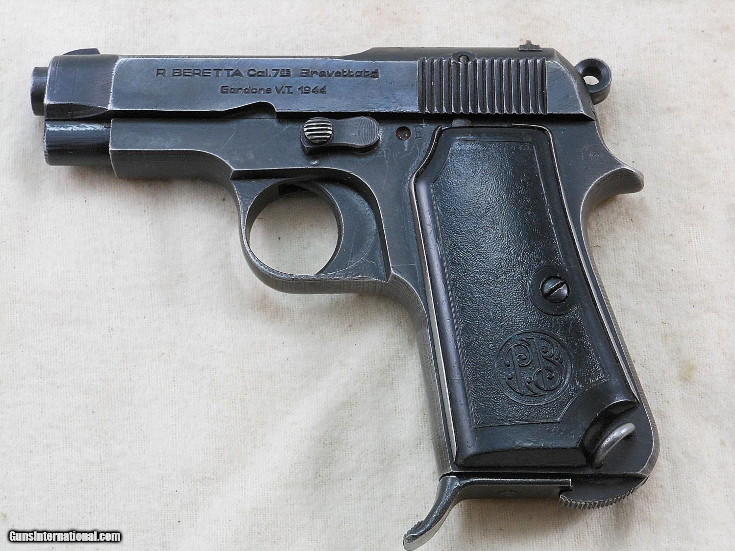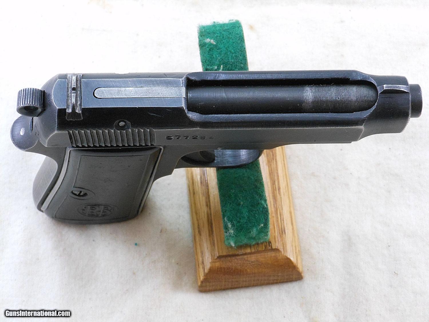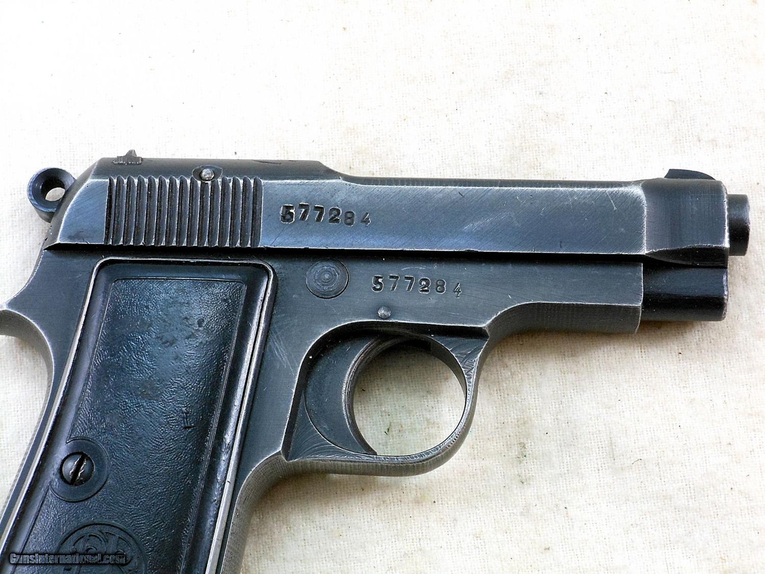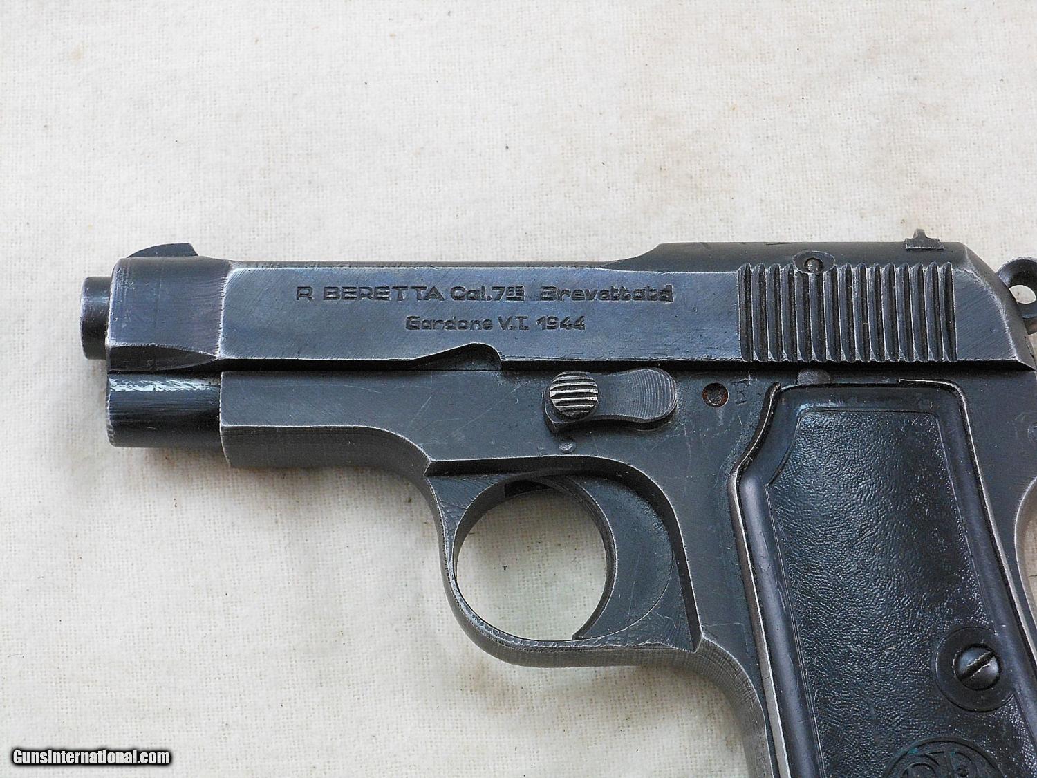 Description: Quality consignments Wanted! This Beretta was produced in 1944 For the Italian Socialist Republic Army and German occupation forces after the fall of Mussolini in 1943. The serial number is 577284. This pistol is chambered for the 32 A.C.P. cartridge. The R.S.I. was from 1943 to 1945. This pistol has a fine bore. The finish is the late war time finish that is blued. Has the steel backed grips, This pistol would rate a 95% condition. It comes with two original magazines and the correct army green leather holster. The holster is in fine condition. On the back is two small punch holes for unknown purposes. This is a nice Beretta with interesting historical interest. Search for hlvfineguns on google. Curio&Relic C.A.C. Consn. F. No. 225 SOLD Curio/Relic: Yes Manufacturer: Beretta Model: 1935 Serial Number: 577284 Caliber Info: 32 A.C.P. Manufacture Date: 1944 Extras: Holster And Spare Magazine |