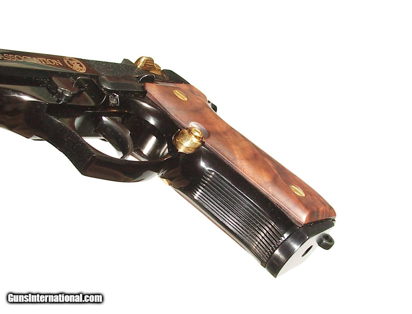Description: 9mm, 5" barrel with double stack magazine. Finished blue with gold inlay on both sides commemorating the National Rifle Association on the left and Beretta's information in script on the right. In addition the hammer, grip screws, magazine release and safety are gold plated. Plain fancy walnut grips. In as new, unfired original condition and accompanied by it's wooden display box. SOLD |