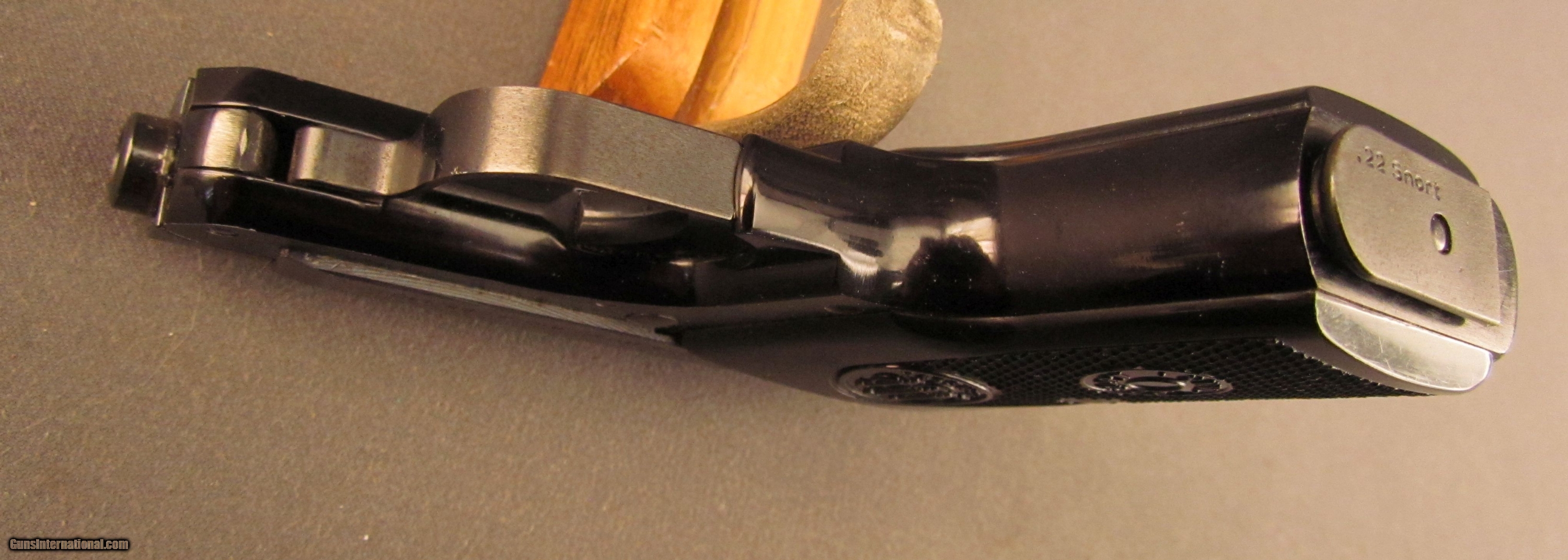 Description: Serial #BER15277T, .22 Short, 2 1/2” tip-up barrel with an excellent, bright bore. This little “Jetfire” model retains 97-98% of the original blue finish with some very minor specks of silvering on a few of the high edges and projections. Additionally, there are a handful of very minor freckling spots on the top of the slide. The checkered black plastic “MINX” marked grips are in fine shape with only some minor handling marks and very little flattening of the points. The pistol comes with a single magazine and is in excellent condition overall. FFL SOLD Manufacturer: Beretta Model: 950 Serial Number: BER15277T Caliber Info: .22 Short Gauge Info: .22 Short |
