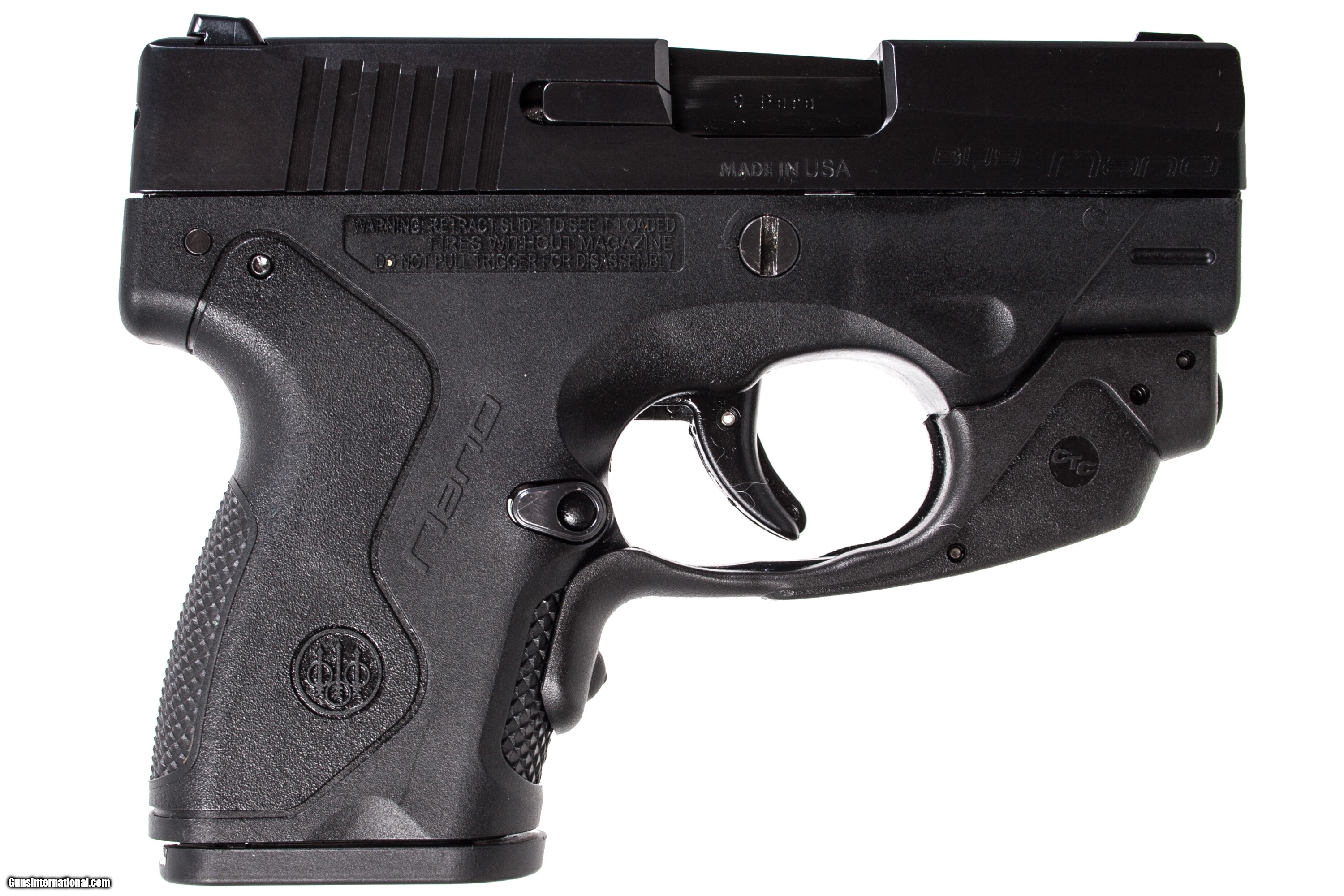 Description: Beretta Nano chambered in 9 mm with a 3 inch barrel case 3 extra magazines and a Crimson Trace laser. This gun is in excellent condition and is covered by Dury's Lifetime Warranty.