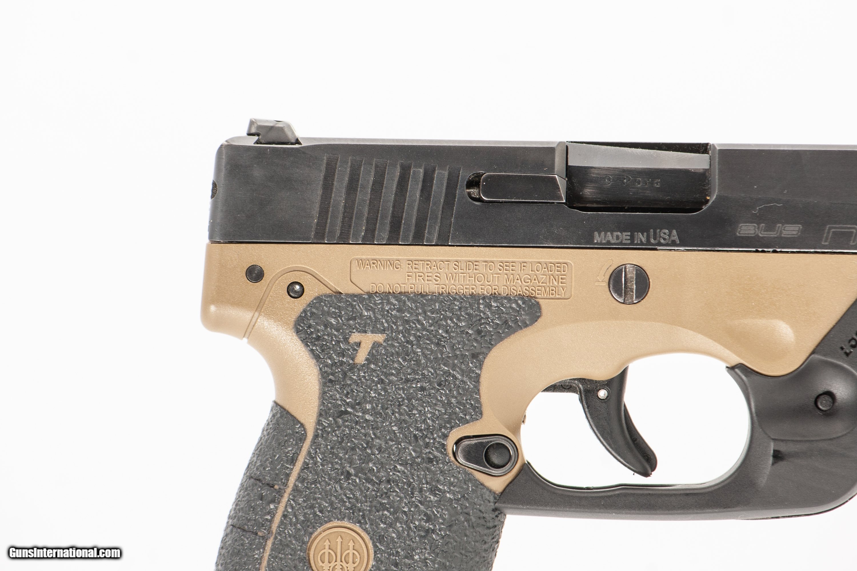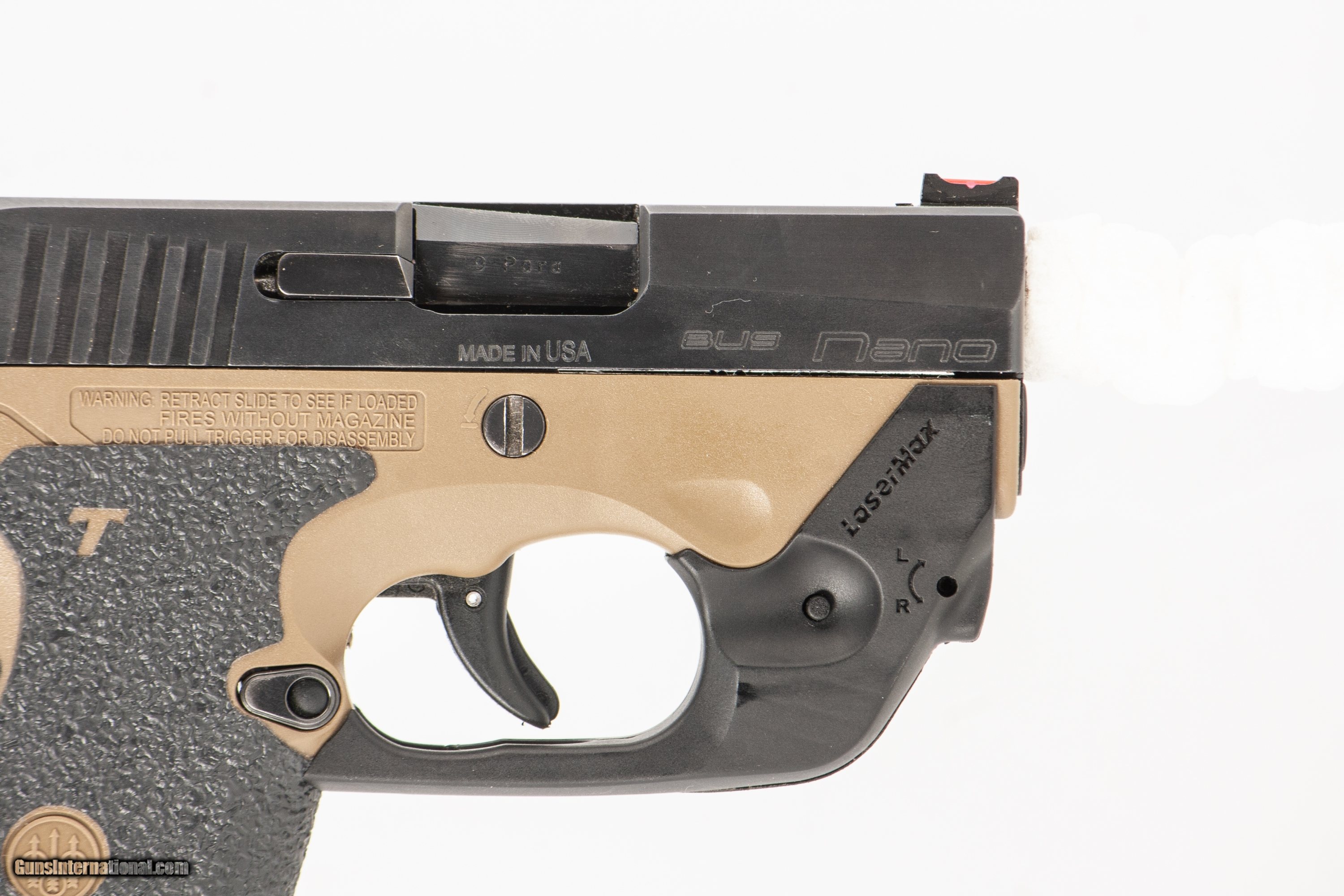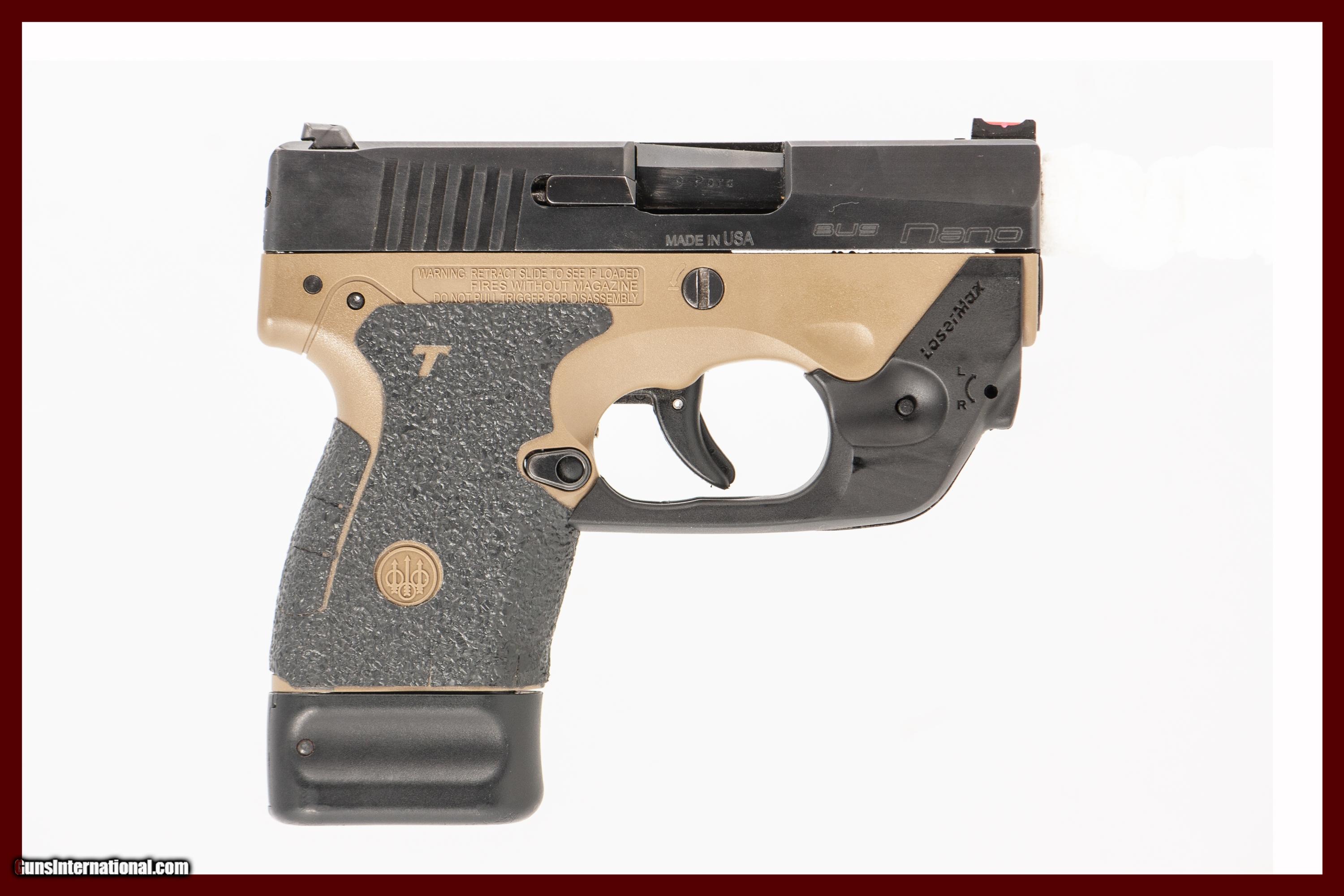Beretta Nano chambered in 9 mm with a 3 inch barrel bright & shiny bore lasermax trigger guard mounted laser holster 2 extra magazines and a hard case. This firearm is in excellent condition and is covered by Dury's Lifetime Warranty.