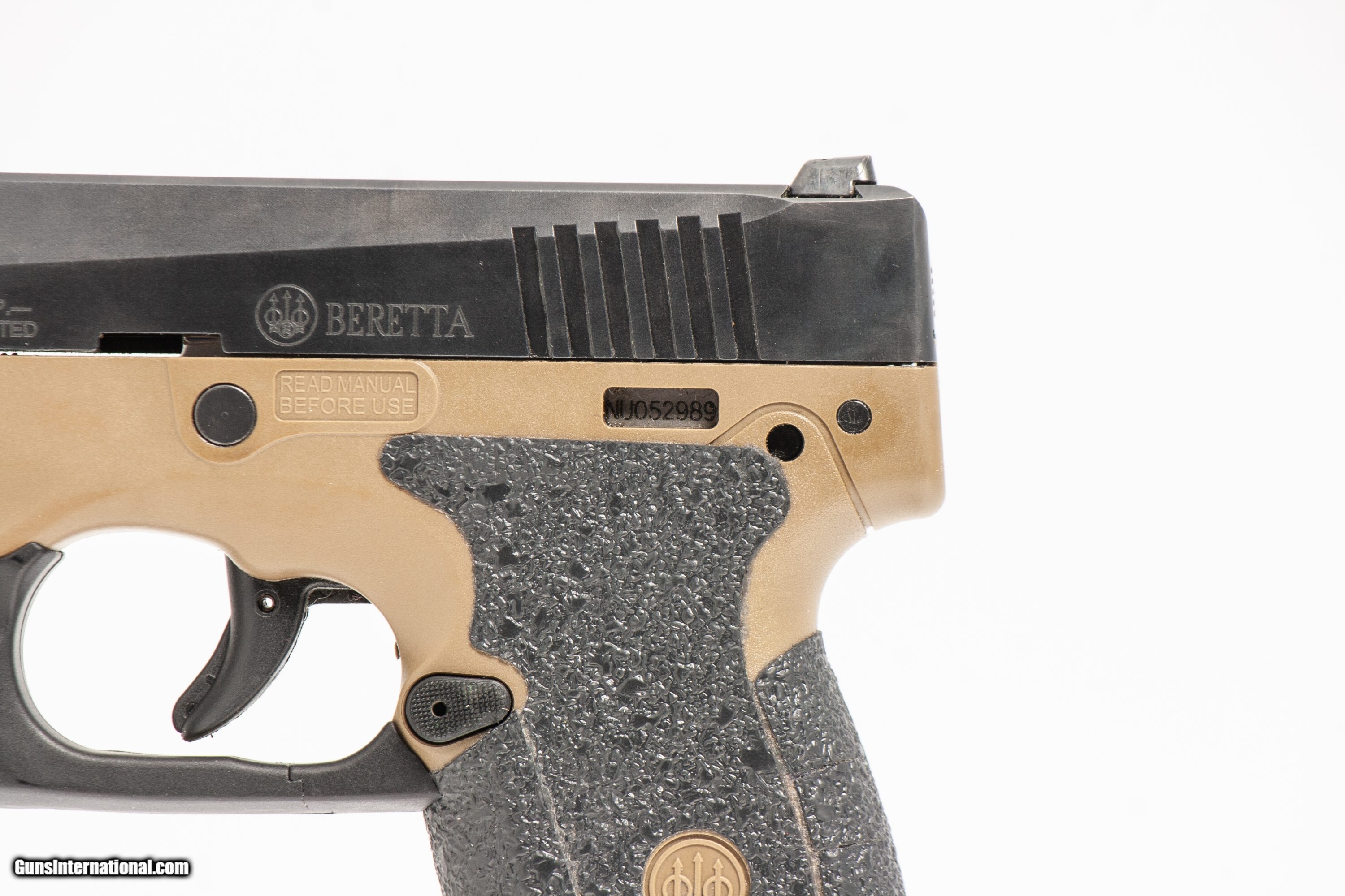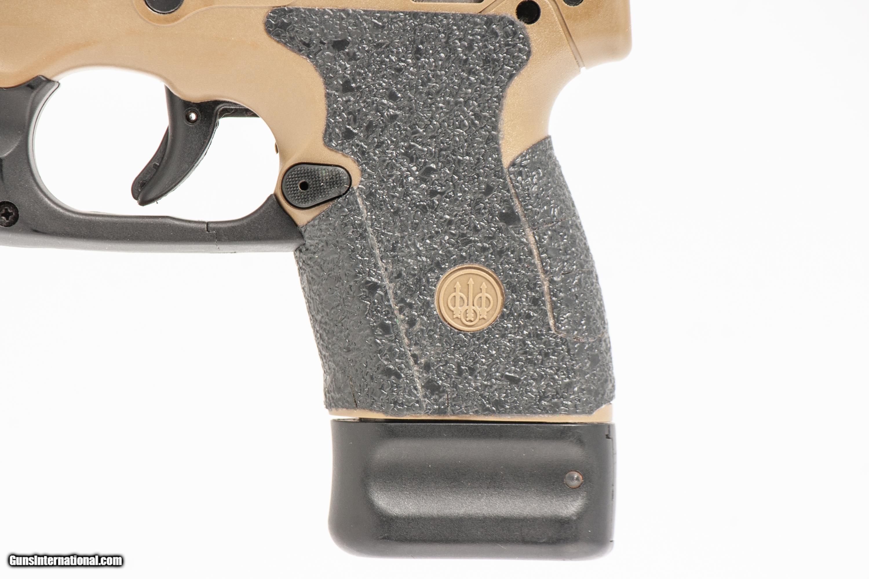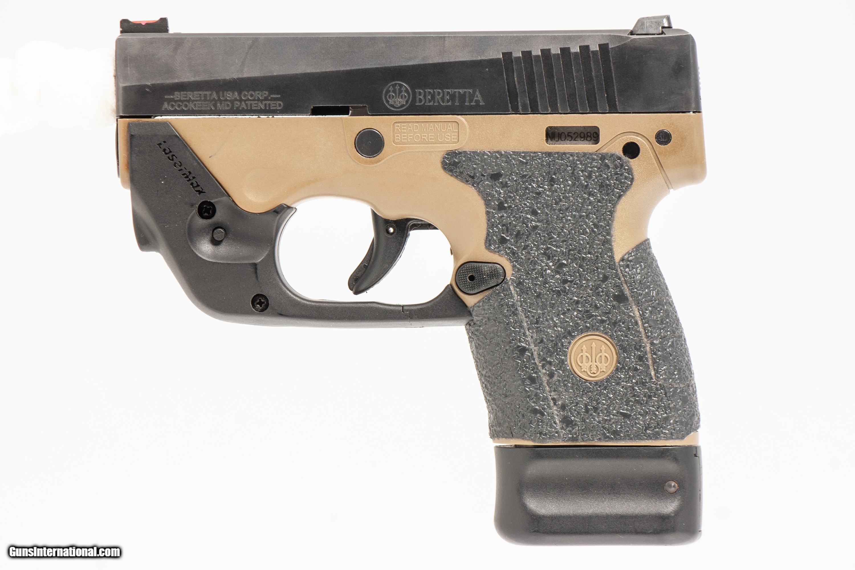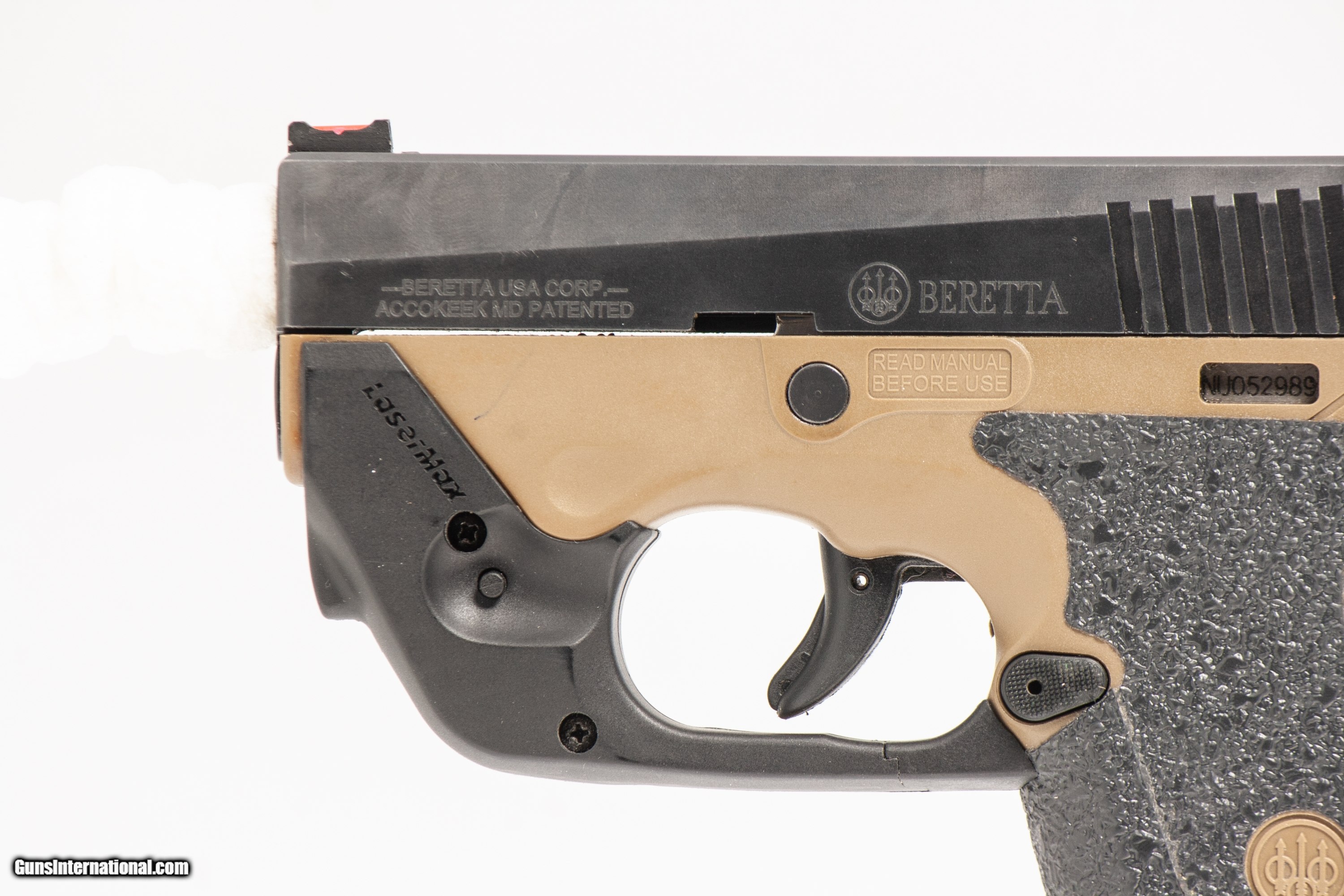 Beretta Nano chambered in 9 mm with a 3 inch barrel bright & shiny bore lasermax trigger guard mounted laser holster 2 extra magazines and a hard case. This firearm is in excellent condition and is covered by Dury's Lifetime Warranty.