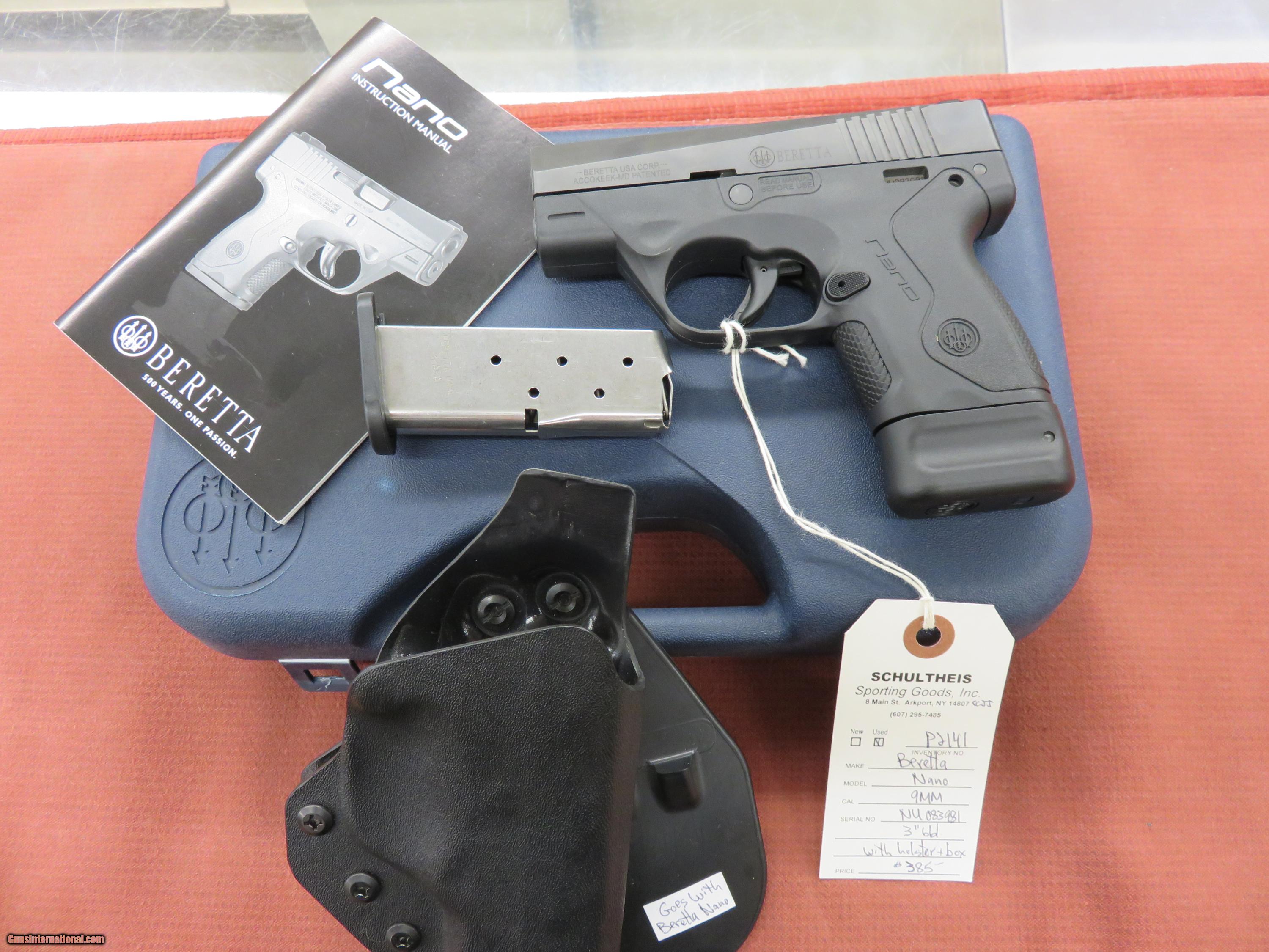 Description: Beretta Nano 9mm, 100% finish, mint with box, "G-Code" holster and extra magazine. SOLD |