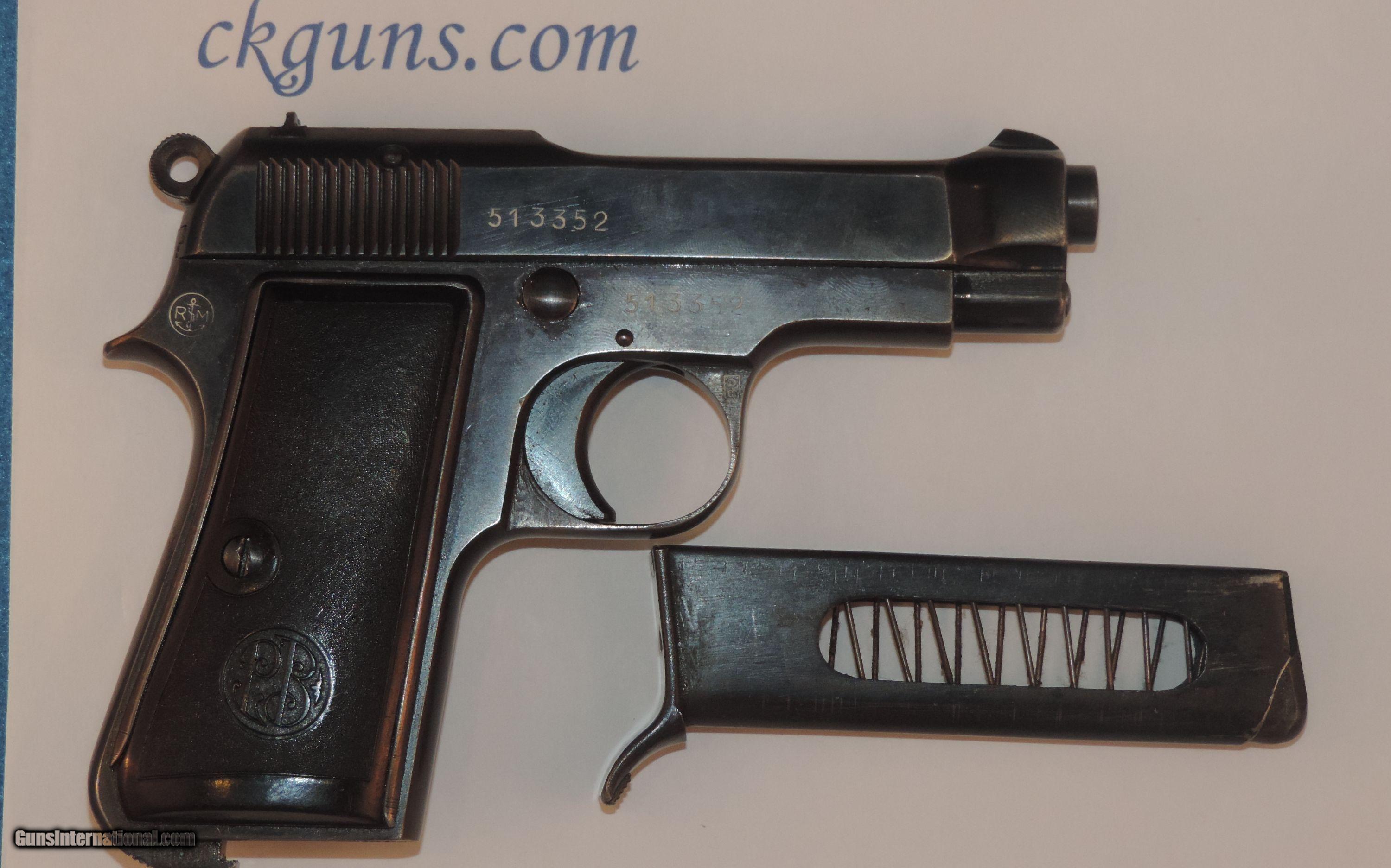 Description: Beretta Navy, Mdl. 1935 Cal. .32acp. Ser. 513352. Extremely rare and in beautiful condition. This is a very rare "ISR" proofed 1935 Navy gun. In the September of 1943 well after the allied invasion the Nazis took control of Italy. Those loyal to Mussolini, under Nazi supervision formed a new government called the "Italian Social Republic". Guns made under the Nazi occupation were proofed with the new ISR proof. As you can imagine the Italian navy had almost disappeared at that late date. However this gun has both the ISR proof and the rare Italian Navy Ordinance stamp. It is also in remarkable condition retaining about about 98+%. The only finish loss is due to some slight sharp edge silvering. There are no pits, rub marks or scratches anywhere. The grip straps have not even started to tone. All numbers match. The black Bakelite grips are without a blemish. The barrel like the gun is pristine, sunshine bright with razor sharp rifling.This rare little beauty comes with one correct finger grip .32acp magazine. What a find for the serious collector . A real centerpiece with full bragging rights at only.....$1495. To purchase this firearm or if you want to request more information contact us at: Email ckgunsymail Phone 201-512-0002 Cell 201-575-6838 FAX 201-215-4759 We accept most major credit cards. Prices shown are Discounted 3% for Cash or Check. The buyer must be familiar with all the laws governing the purchase and the ownership of firearms in their own city and state. The Yankee Armorer, Inc is not responsible for any failure to comply with or observe these laws. The Yankee Armorer, Inc will only ship after full payment and receipt of all required documents. Shipping: Add $35.00 for handguns, $45.00 for long guns. New Jersey buyers are subject to a 7% sales tax. The Yankee Armorer, Inc offers a 3 day inspection period with full refund upon return of intact firearm and in the original condition. The Yankee Armorer, Inc offers a no interest lay away program - 25% down; 25% in 30 days; 25% in 60 days; and full payment in 90 days. Any violation of this policy is subject to restocking and forfeiture of all payments. Any variation from this policy must be agreed to in advance. Unshipped Cancelled sales are subject to a 20% restocking fee. Be advised that all firearms sold by The Yankee Armorer, Inc. or the Gun Exchange, LLC (SELLER) are sold as collector’s items. They have not been fired or tested for safety and must be examined by a license gunsmith prior to use. By purchasing any item from the (SELLER), you are agreeing to hold the (SELLER) free from any damages or lawsuits of any nature. Any item left for transfer or storage will be charged to $25.00 per month, per item from the day of its receipt. Any variation from this policy must be agreed to in advance. Store hours 10:00 am to 5:00 pm Tuesday -Saturday. It's always best to call for appointment. Store 201-512-0002, cell 201-575-6838. SOLD Curio/Relic: Yes Manufacturer: Beretta Model: 1935 Serial Number: 513352 Caliber Info: .32 |