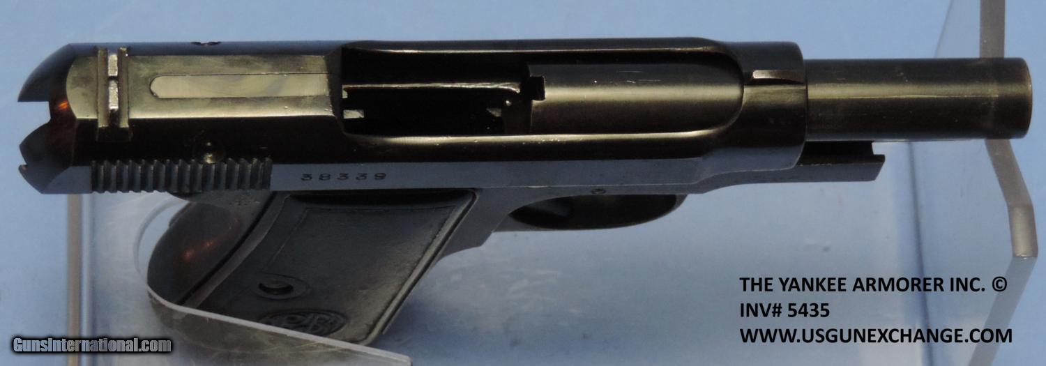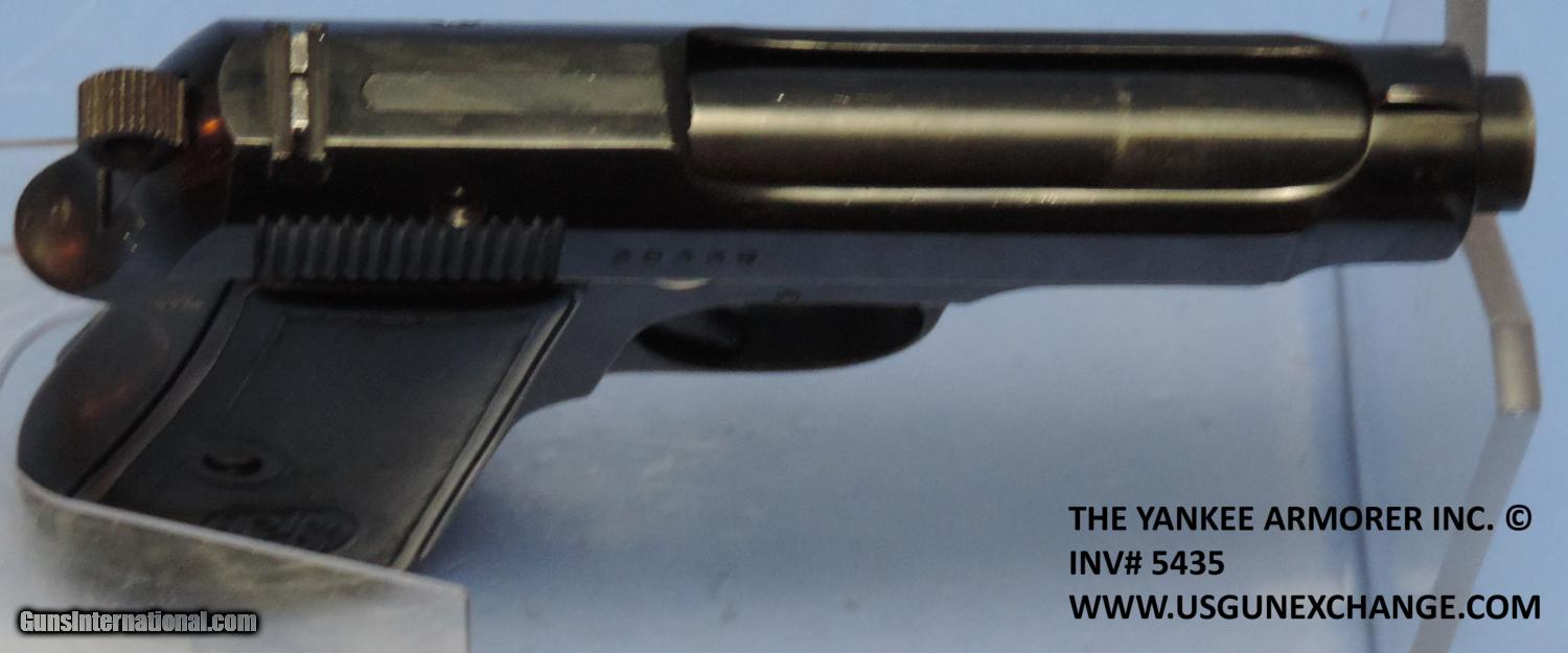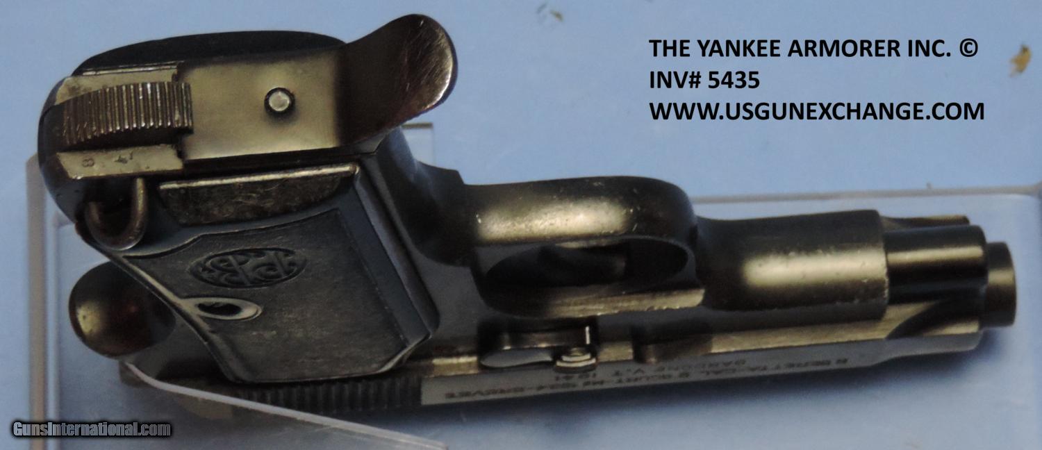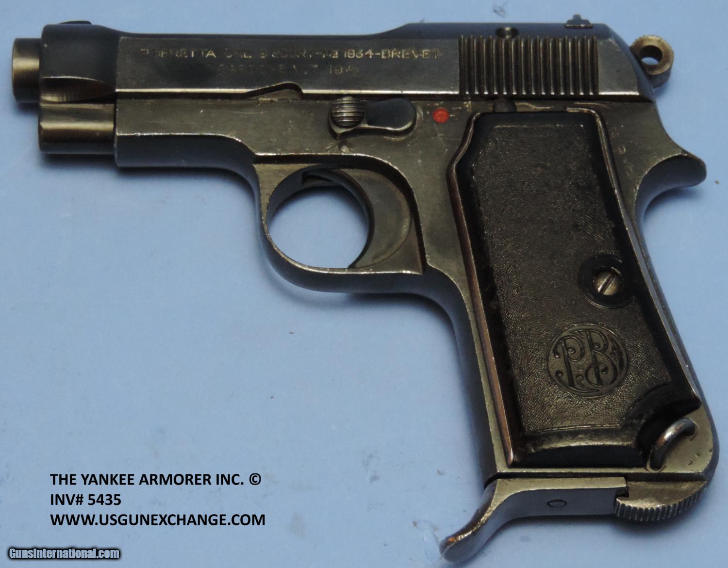 Description: Inv. 5435 Beretta, (Romanian Contract with Nazi Waffenamt). Mdl. 1934 Cal..380, Dated 1941. Very rare and with great condition are only words that describe this gun. Be advised there are are no import marks on this gun. It must have been a bring back. This was originally part of a contract for the Romanians The entire contract was not delivered before the Nazis took over. This gun may have already been delivered by the time the Nazis took over Romania or possibly part of the contract that went undelivered and was turned over to the Nazis directly from Beretta. The slide is are marked 9mm "Scurt" which is Romanian for "Short' and the serial number is correct for the Romanian contract. This gun retains about 97-98% original high polish commercial blue. There is the usual sharp edge and muzzle silvering and a few scattered pinpricks. There is virtually no rust or pits to be found. The barrel, slide, and frame all match which is correct for the gun. The grips straps show almost no toning to gray. The right rear tang has a CM in circle, we think was the Romanian inspector's mark of the period. Then below that is a Nazi Waffenamt, a stick Eagle/WaA63. WaA/63 was indeed a Nazi inspector originally stationed at Waffenfabrik Brunn. The plastic grips and metal base plates show no wear, they are devoid of any splits or chips. The bolt face and feed ramps show almost no use. The bore like the rest of the gun shows almost no wear. The rifling is extremely sharp and bright with only the slightest hint of graying. The gun comes with one correct early finger grip magazine. You won't find another, let alone in this condition. Definitely a rarity from WW II.....$1495. To purchase this firearm or if you want to request more information contact us at: Email ckgunsymail Phone 201-512-0002 Cell 201-575-6838 FAX 201-215-4759 We accept most major credit cards. Prices shown are Discounted 3% for Cash or Check. The buyer must be familiar with all the laws governing the purchase and the ownership of firearms in their own city and state. The Yankee Armorer, Inc is not responsible for any failure to comply with or observe these laws. The Yankee Armorer, Inc will only ship after full payment and receipt of all required documents. Shipping: Add $35.00 for handguns, $45.00 for long guns. New Jersey buyers are subject to a 7% sales tax. The Yankee Armorer, Inc offers a 3 day inspection period with full refund upon return of intact firearm and in the original condition. The Yankee Armorer, Inc offers a no interest lay away program - 25% down; 25% in 30 days; 25% in 60 days; and full payment in 90 days. Any violation of this policy is subject to restocking and forfeiture of all payments. Any variation from this policy must be agreed to in advance. Unshipped Cancelled sales are subject to a 20% restocking fee. Be advised that all firearms sold by The Yankee Armorer, Inc. or the Gun Exchange, LLC (SELLER) are sold as collector’s items. They have not been fired or tested for safety and must be examined by a license gunsmith prior to use. By purchasing any item from the (SELLER), you are agreeing to hold the (SELLER) free from any damages or lawsuits of any nature. Any item left for transfer or storage will be charged to $25.00 per month, per item from the day of its receipt. Any variation from this policy must be agreed to in advance. Store hours 10:00 am to 5:00 pm Tuesday -Saturday. It's always best to call for appointment. Store 201-512-0002, cell 201-575-6838. SOLD Curio/Relic: Yes |