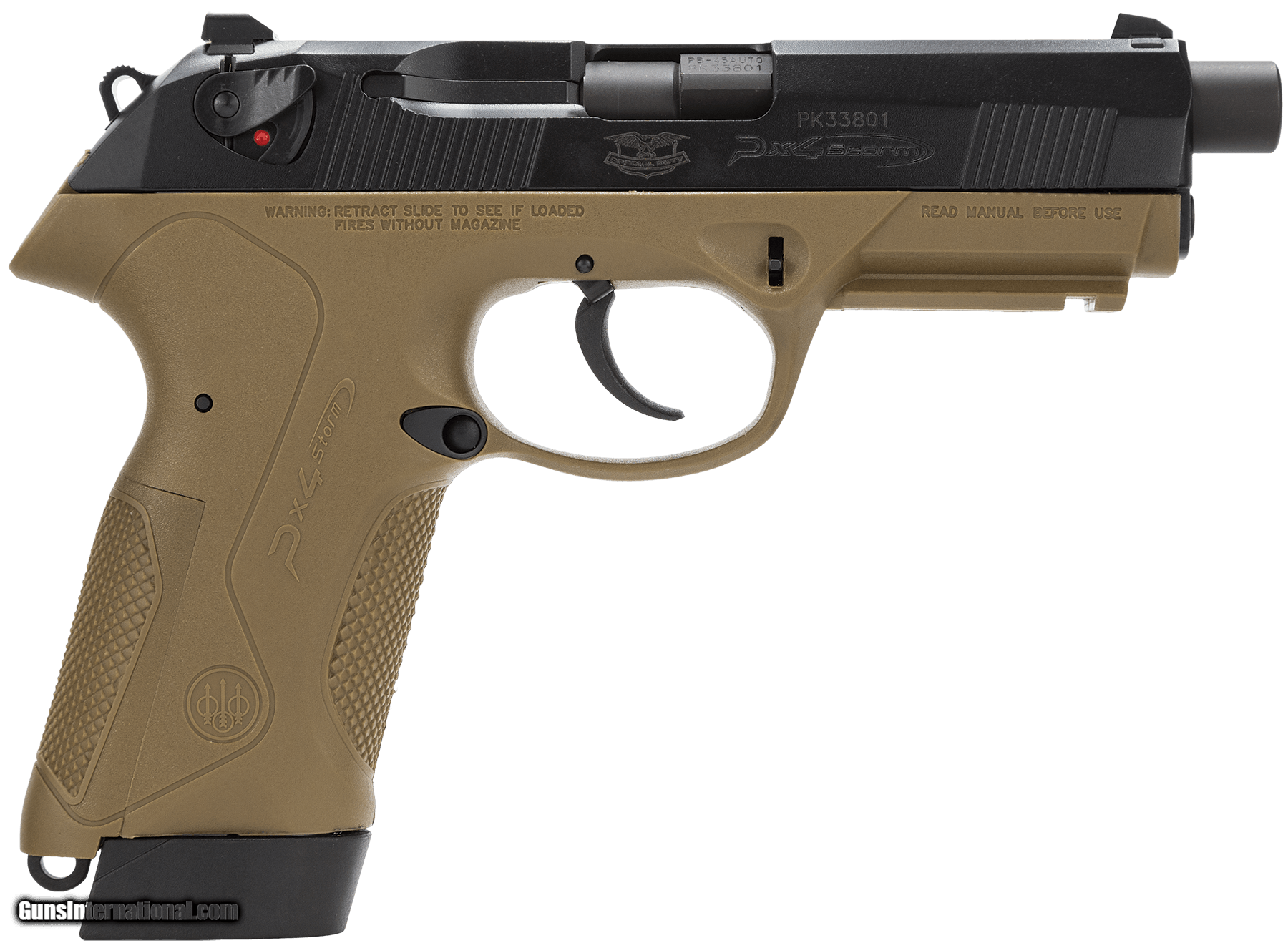 Description: Guns Listing ID: 25968 Based on the dependable design of the Cougar the Beretta PX4 Storm Full is a reliable full size semi-automatic handgun made to meet military standards. Ergonomics contribute to comfort while interchangeable parts and the Picatinny rail make it easily customizable. Reversible controls make this pistol ambidextrous while the modular design and clean lines ensure smooth snag-free unholstering and re-holstering. Available in a range of finishes sizes and calibers the PX4 Storm Full is a suitable duty weapon recommended for home and self-defense and a reasonable option for full size concealed carry. Details Action SADA - Caliber .45 ACP - Capacity 9rd 10rd - Barrel 4.5\" - Frame Polymer Dark Earth - Slide Steel Bruniton - Sights 3-Dot - Safeties Ambidextrous Automatic Firing Pin Block - Length 8.27\" - Width 1.42\" - Height 5.51\" - Weight 28.6 oz. - Commander-Style Hammer - Ambidextrous Safety - Non-Reflective Black Bruniton - Automatic Firing Pin Block - Extended Barrel for Threading - Picatinny Rail - Simple Disassembly Latch - Reversible Magazine Release - Drop-Free Magazine - The PX4 Storm SD .45 ACP semiauto pistol was developed to meet the very demanding requirements issued by the US Special Forces Command (SOCOM) for their Joint Combat Pistol. They called for superior weather resistance three magazines (one 9-round flush and two 10-round extended) dark earth frame extended barrel for threading tactical case and additional accessories. Beretta answered the call successfuly not just by merely rechambering the PX4 Storm to .45 ACP--but rather by redesigning its internal components to meet and exceed all these requirements. The result is a pistol that satisfies not only SOCOMs requirements but the most demanding shooter looking for the absolute best and most reliable for personal defense competition or carry. SOLD Manufacturer: BERETTA Model: PX4 STORM SPECIAL DUTY Caliber Info: .45 ACP Condition: new Barrels: 4.5 BARREL Finish: FDE |