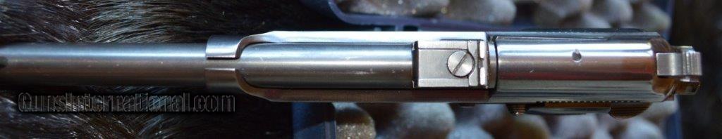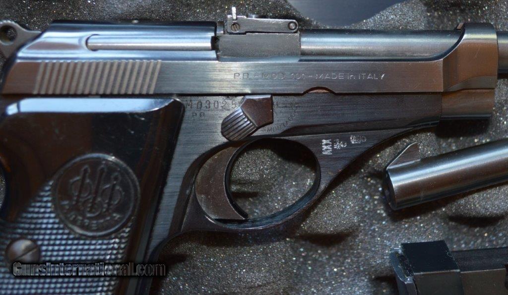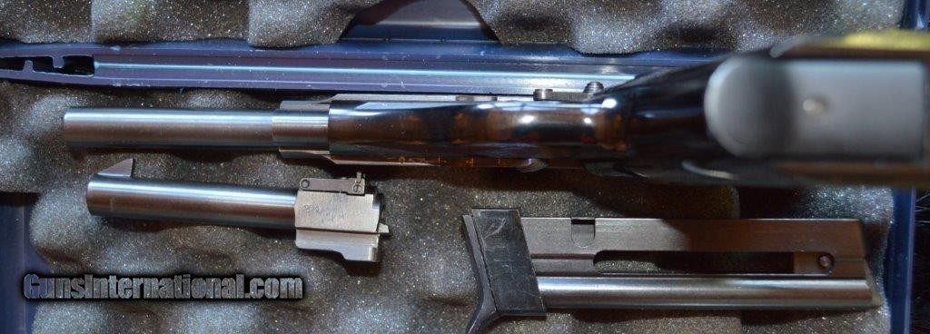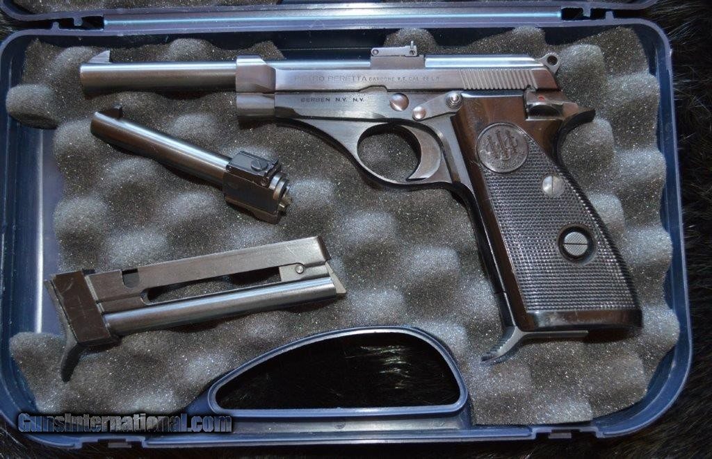 Description: This is a Beretta semi-auto .22 LR two barrel set with a 6" and a 3-1/2" barrel. Each barrel has a rear adjustable sight for maximum accuracy. It also comes with two factory 10 round magazines. It is a fun and great little pistol to shoot. It comes in the Beretta blue plastic rigid case with a foam interior. It has a Bake-Lite style serrated black plastic grip. The gun weighs 20 ounces empty with the 4" barrel. The 2-1/2" barrel weighs 3.3 ounces. The entire set up, in the box, weighs only 2 pounds 3.3 ounces. SOLD Rifle Caliber: .22 Long Rifle |